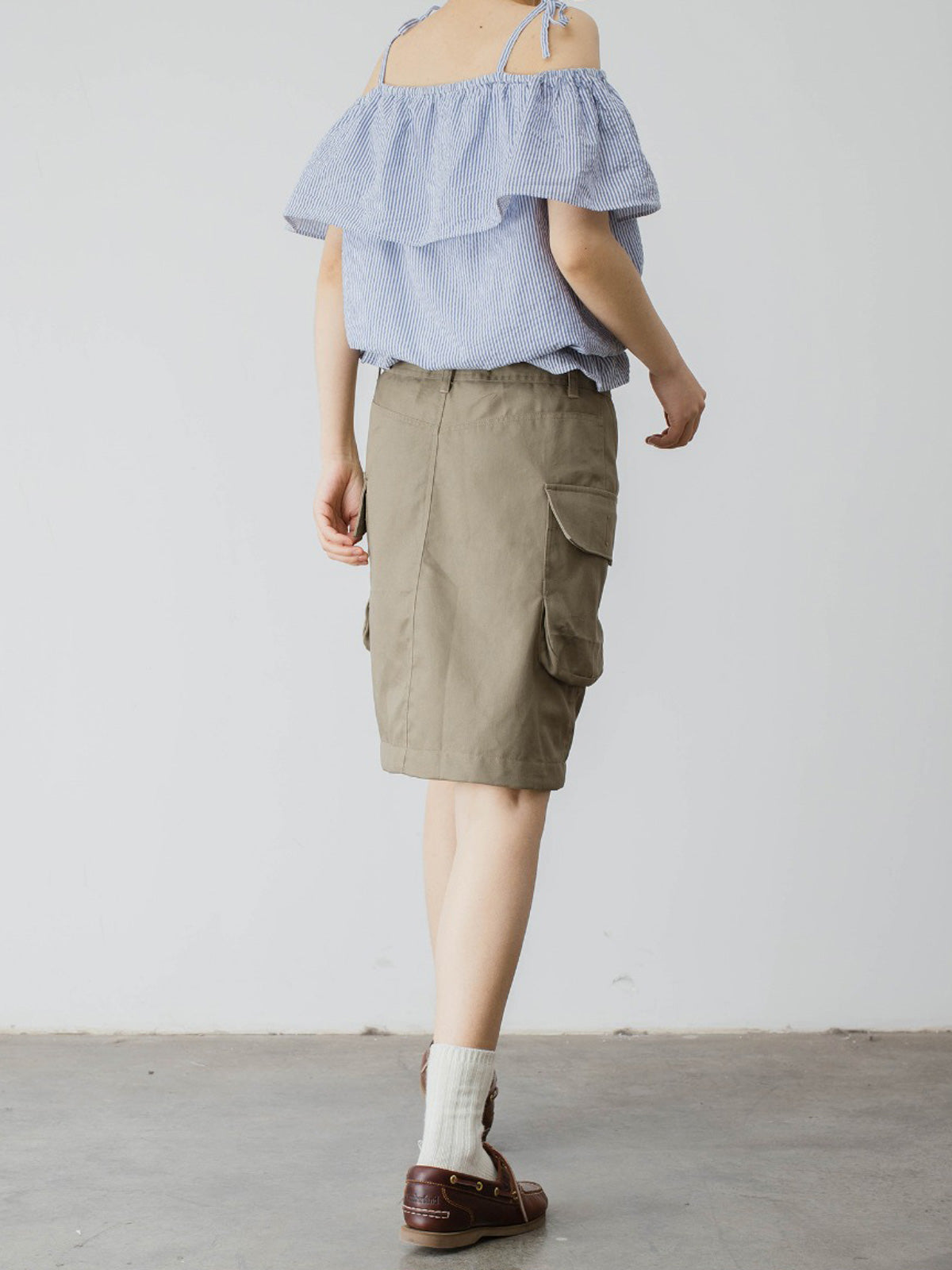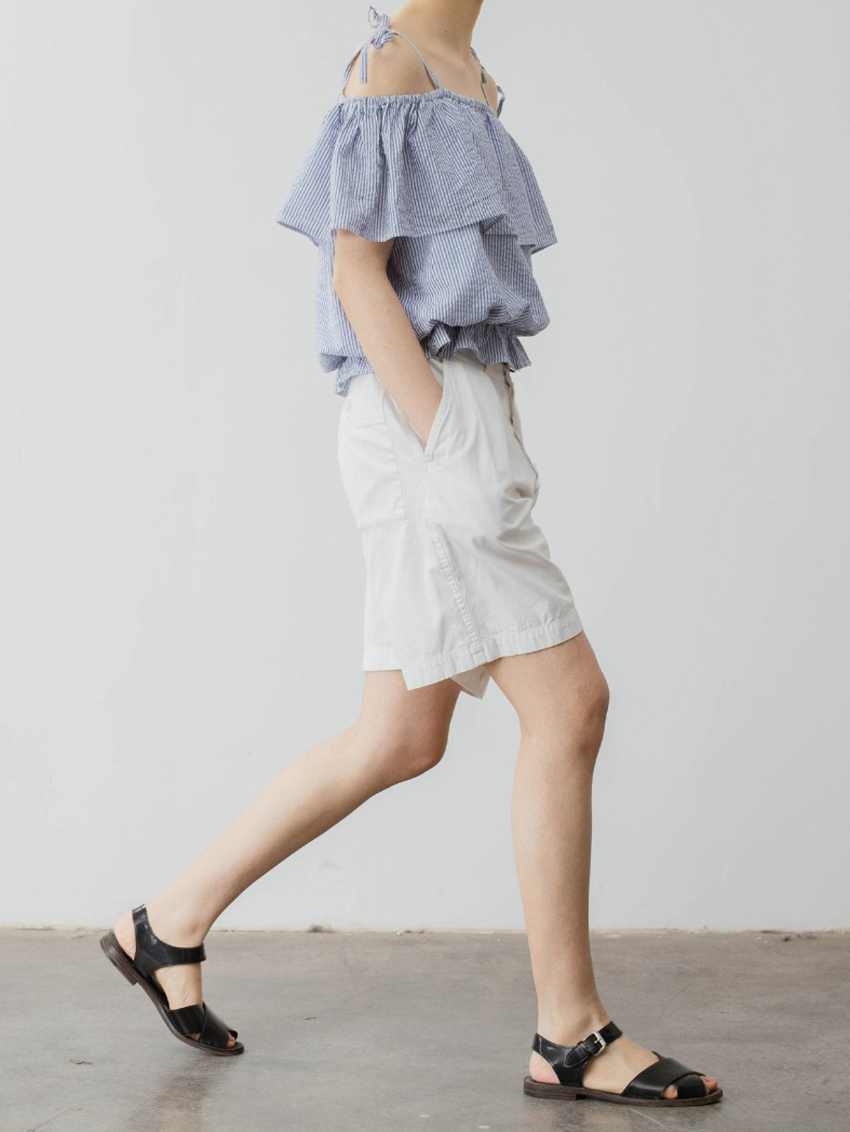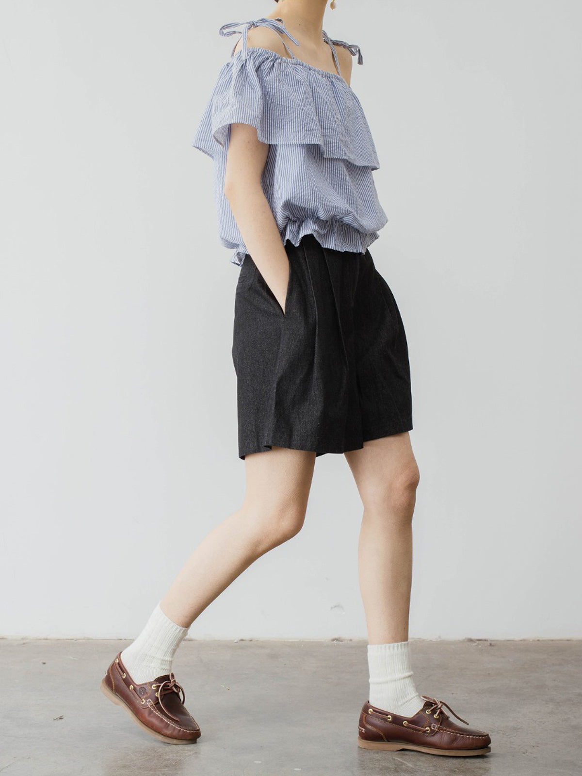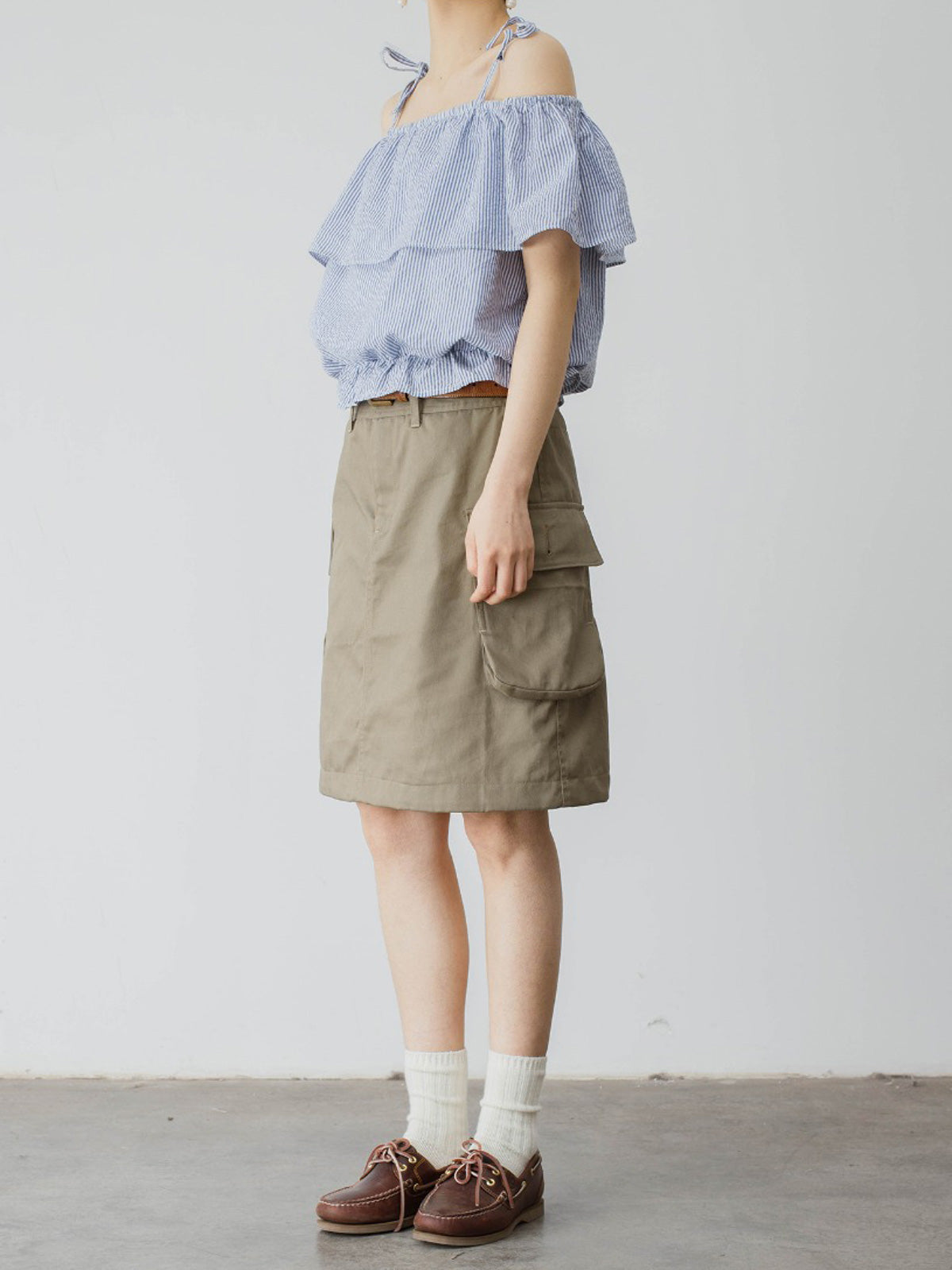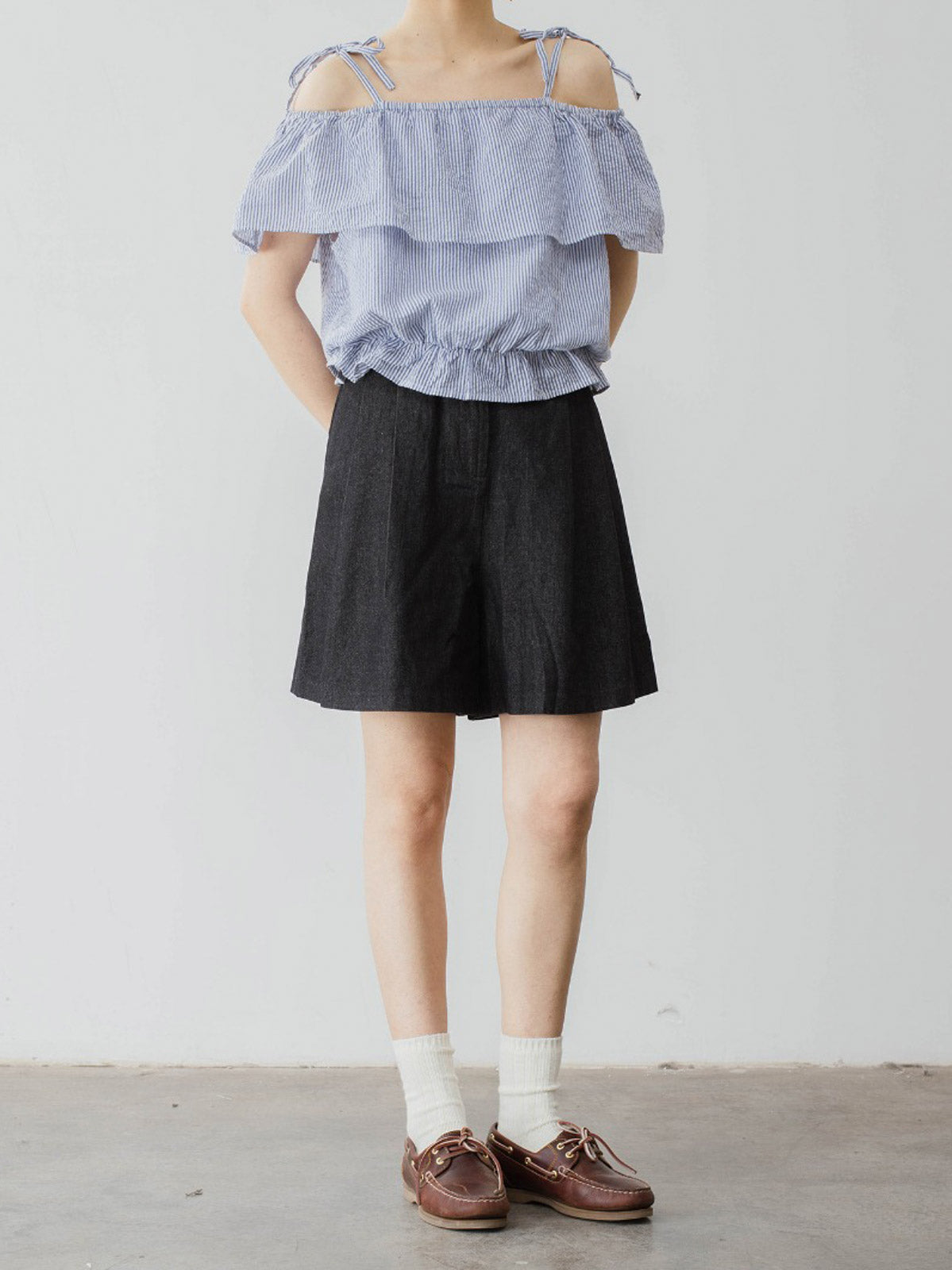 このオフショルダー キャミソールはブルーとホワイトのストライプデザインで、涼しく快適で夏らしい雰囲気を漂わせます。