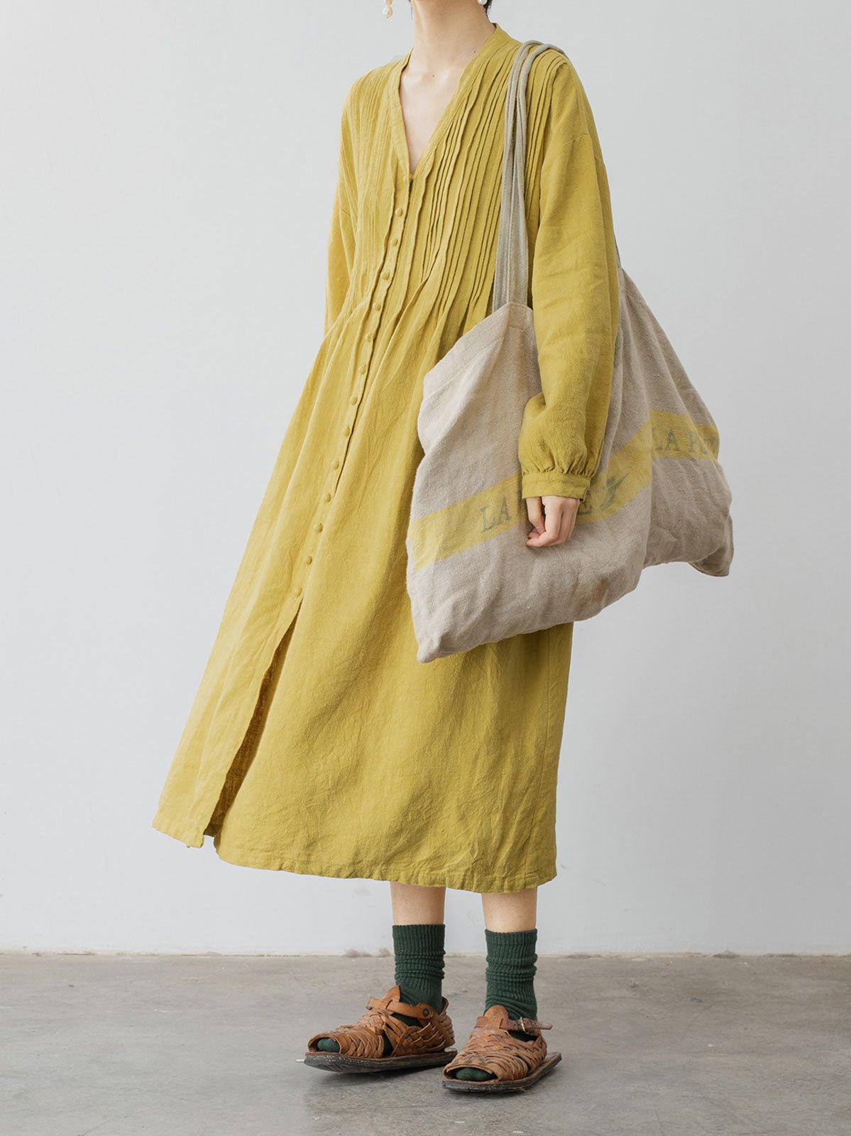 このドレスは、リネン35%とコットン65%のブレンド素材を採用し、通気性と快適さを確保しています。明るいマスタードイエローは視覚的に魅力的で、自然を感じさせる色合いが特徴です。Vネックデザインは首元をすっきり見せ、女性らしさを強調します。前面のプリーツはスタイルに動きを加え、リラックスフィットのシルエットが様々な体型にフィットし、日常から特別な日まで幅広く活躍します。袖口のギャザーが着心地の良さをさらに向上させ、洗練された印象を与えます。