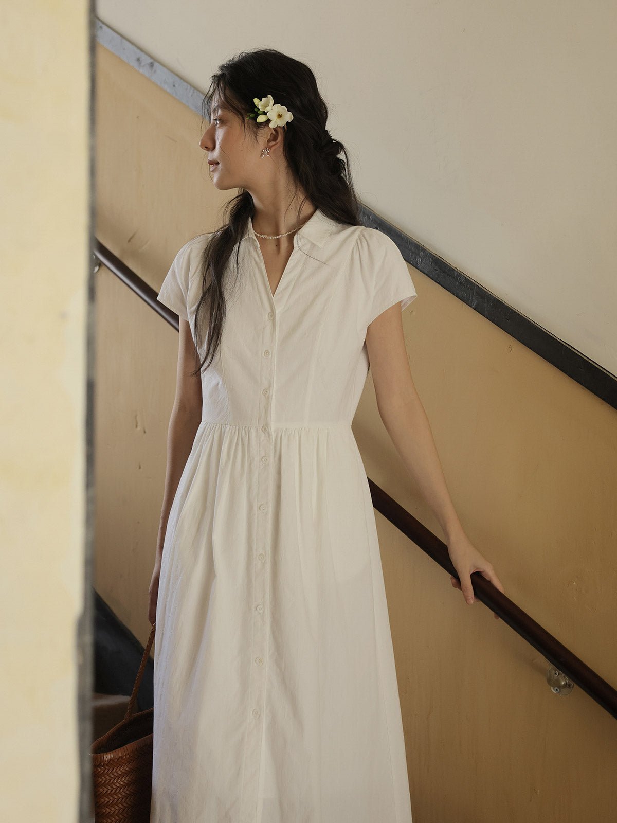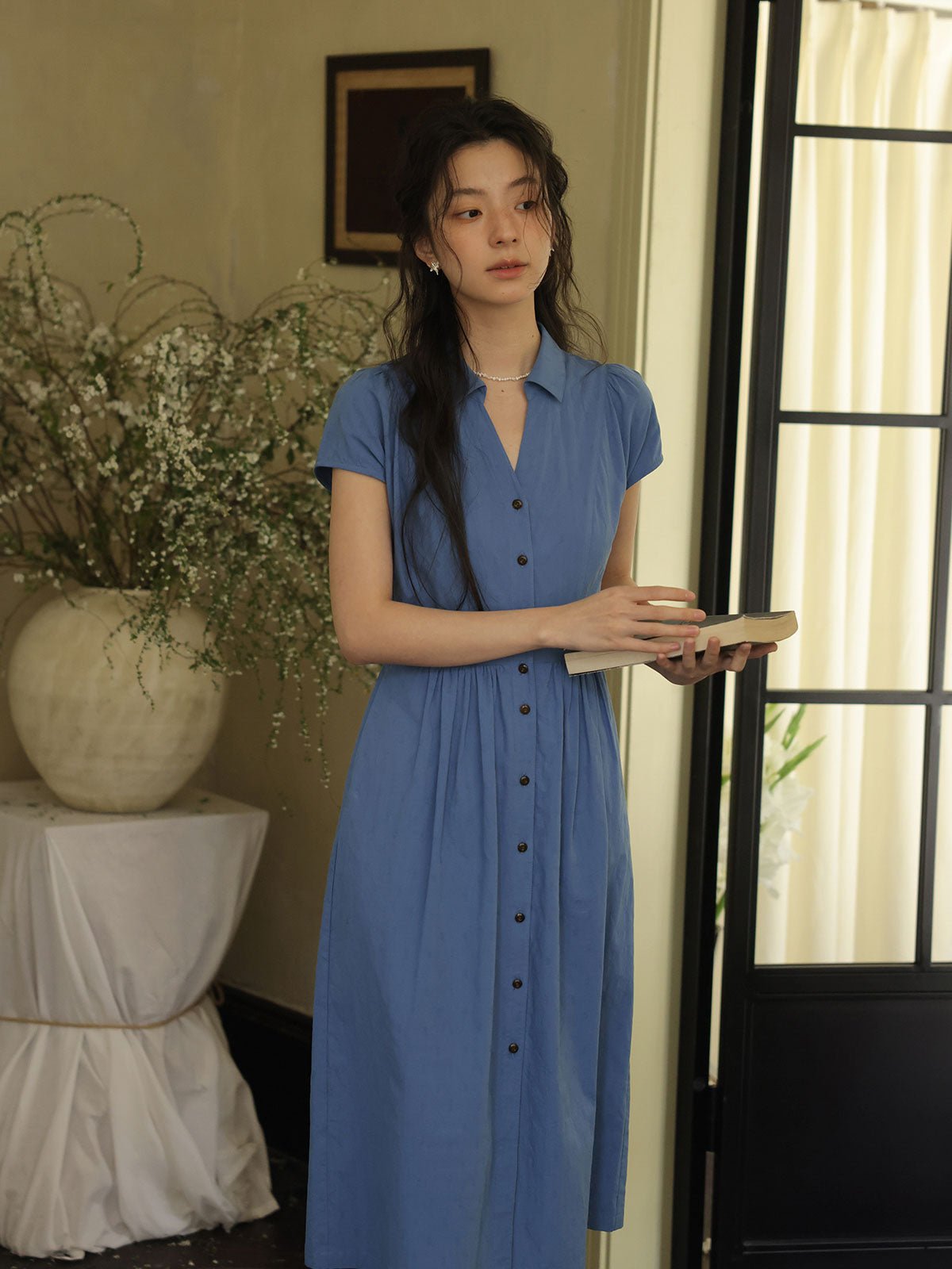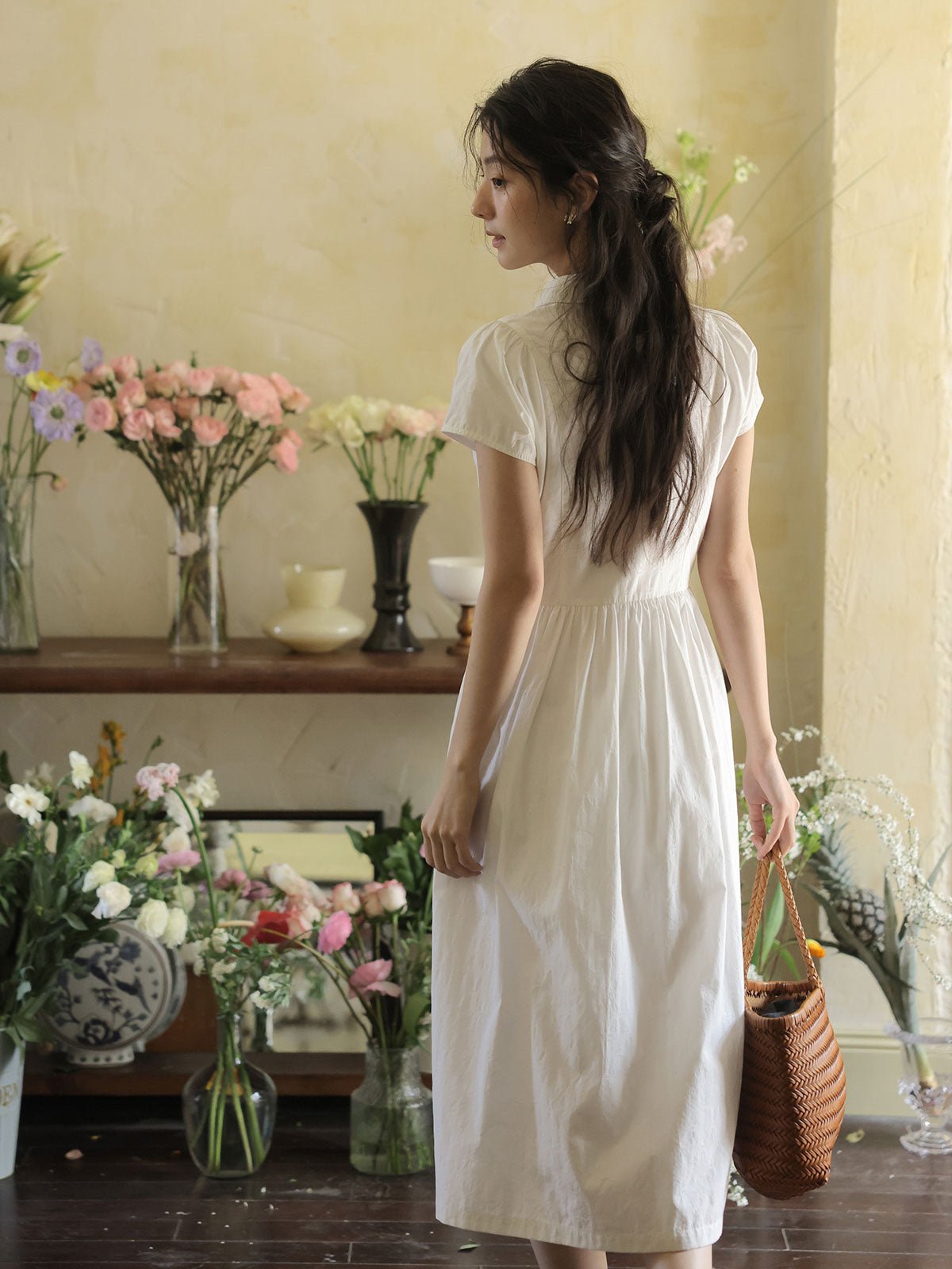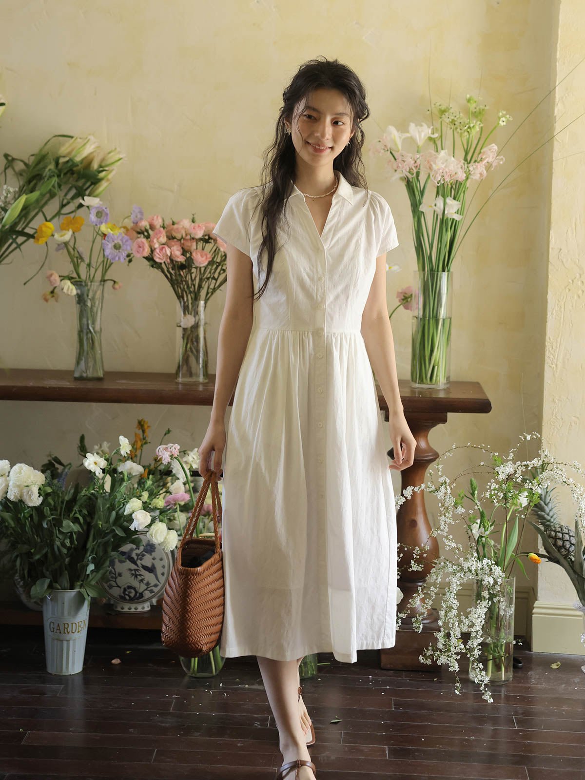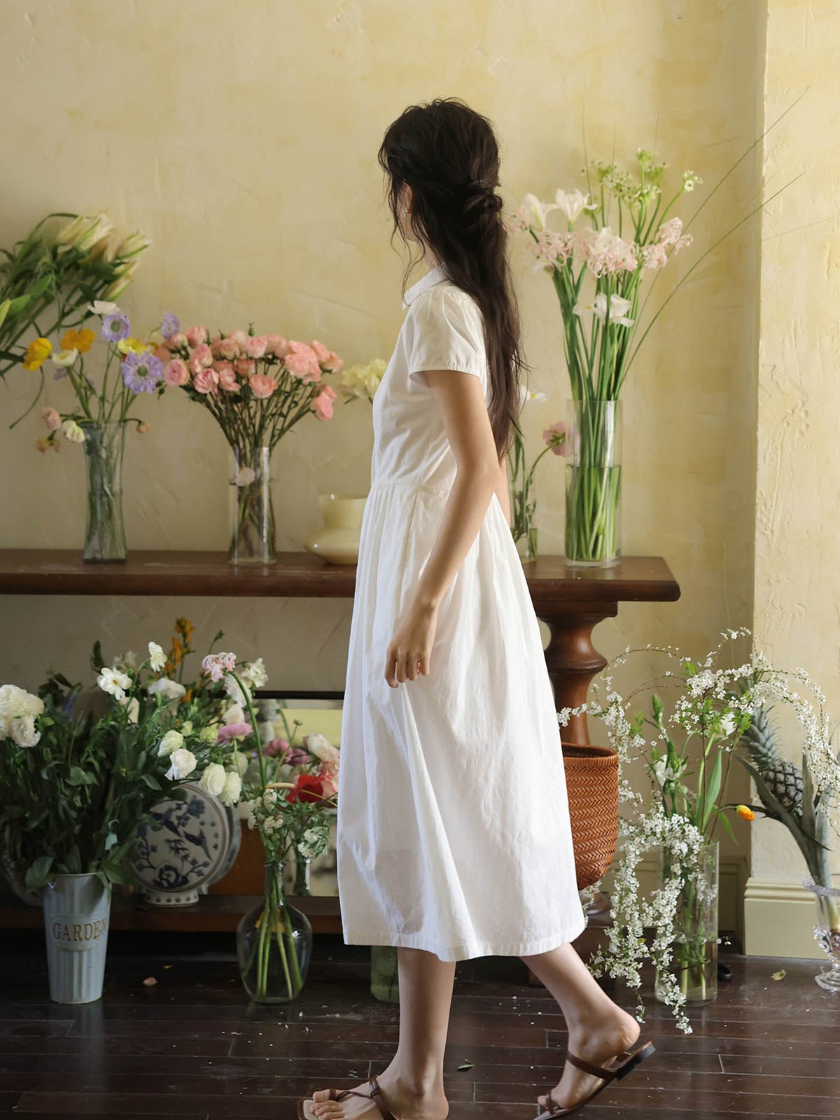 このフレンチレトロスタイルのロングワンピースは、100% コットン素材で作られており、快適さと通気性を提供します。Vネックと組み合わされたシャツカラーは洗練された印象を与え、ウエストのギャザーはさまざまな体型に美しくフィットします。ミディアム丈はさまざまな身長の人にも適しており、シェルボタン(白い色モデル)またはアンバーボタン(青い色モデル)がアクセントになっています。ウエストに施されたプリーツはスリムな見た目を強調し、ショートスリーブには軽いギャザーが加えられ、体型をカバーします。