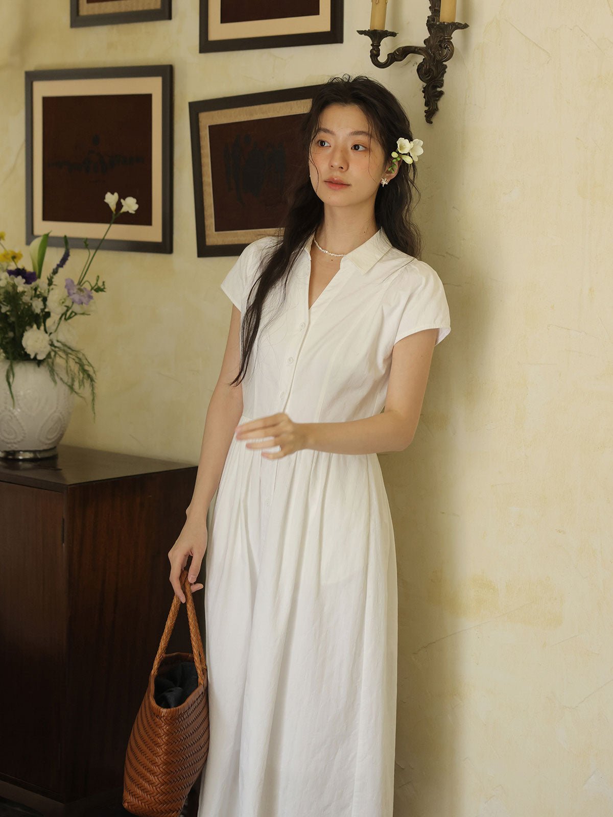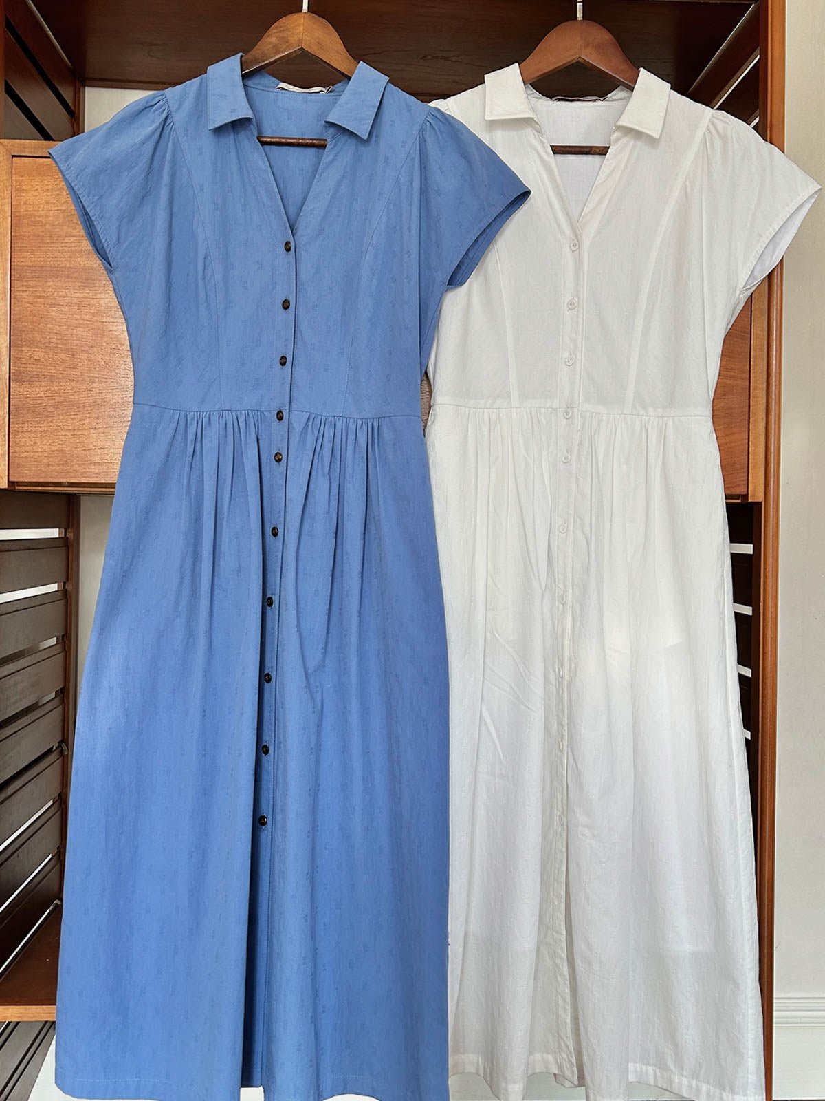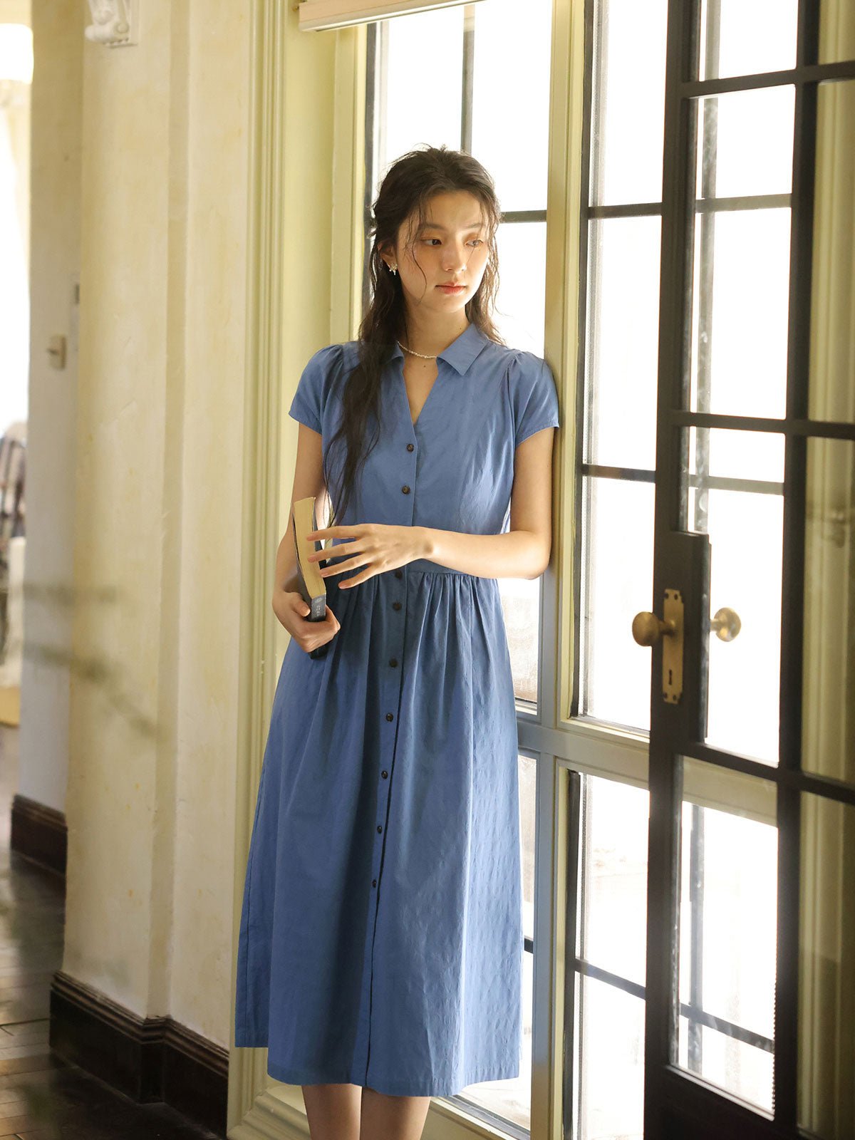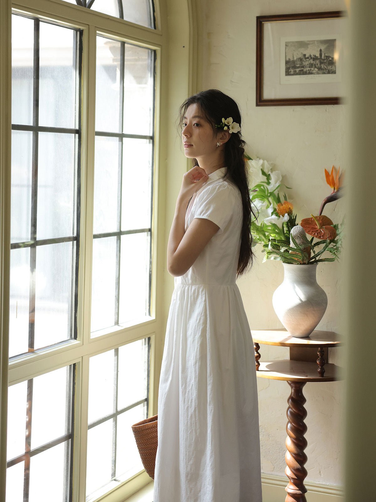 このフレンチレトロスタイルのロングワンピースは、100% コットン素材で作られており、快適さと通気性を提供します。Vネックと組み合わされたシャツカラーは洗練された印象を与え、ウエストのギャザーはさまざまな体型に美しくフィットします。ミディアム丈はさまざまな身長の人にも適しており、シェルボタン(白い色モデル)またはアンバーボタン(青い色モデル)がアクセントになっています。ウエストに施されたプリーツはスリムな見た目を強調し、ショートスリーブには軽いギャザーが加えられ、体型をカバーします。
