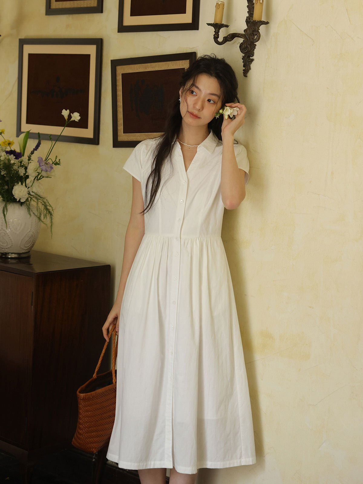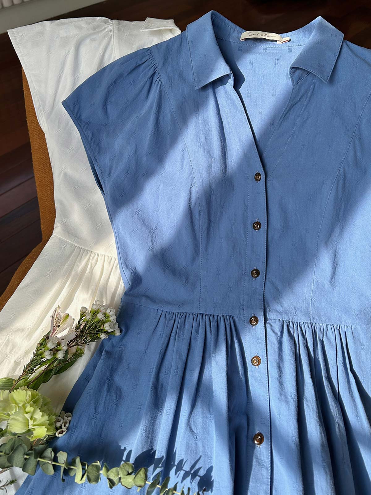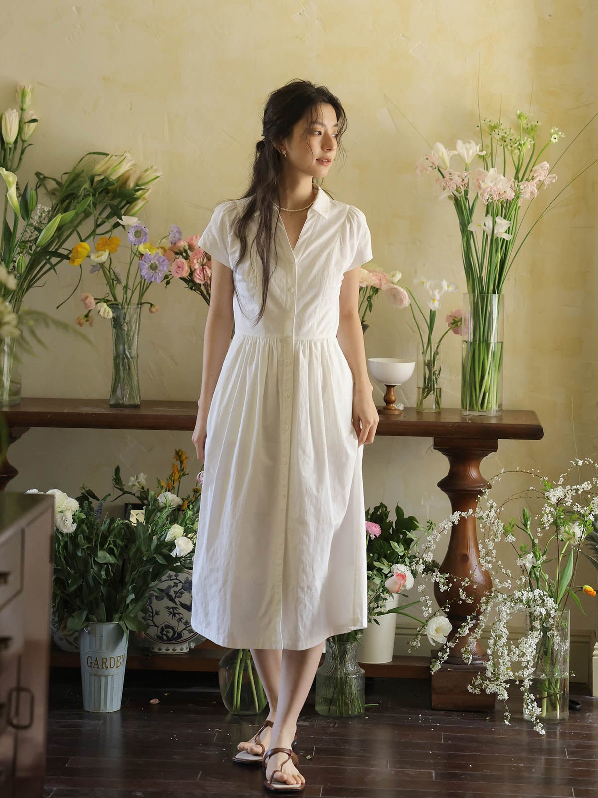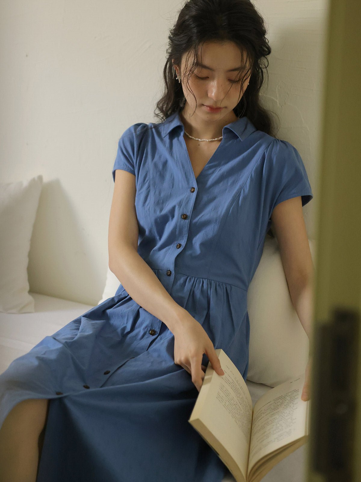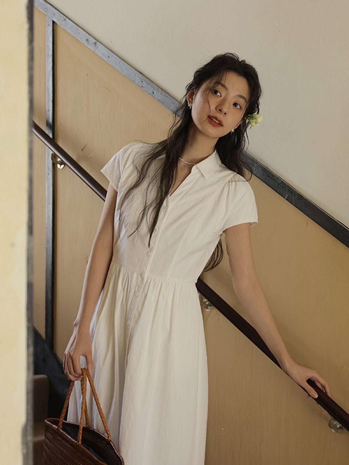 このフレンチレトロスタイルのロングワンピースは、100% コットン素材で作られており、快適さと通気性を提供します。Vネックと組み合わされたシャツカラーは洗練された印象を与え、ウエストのギャザーはさまざまな体型に美しくフィットします。ミディアム丈はさまざまな身長の人にも適しており、シェルボタン(白い色モデル)またはアンバーボタン(青い色モデル)がアクセントになっています。ウエストに施されたプリーツはスリムな見た目を強調し、ショートスリーブには軽いギャザーが加えられ、体型をカバーします。