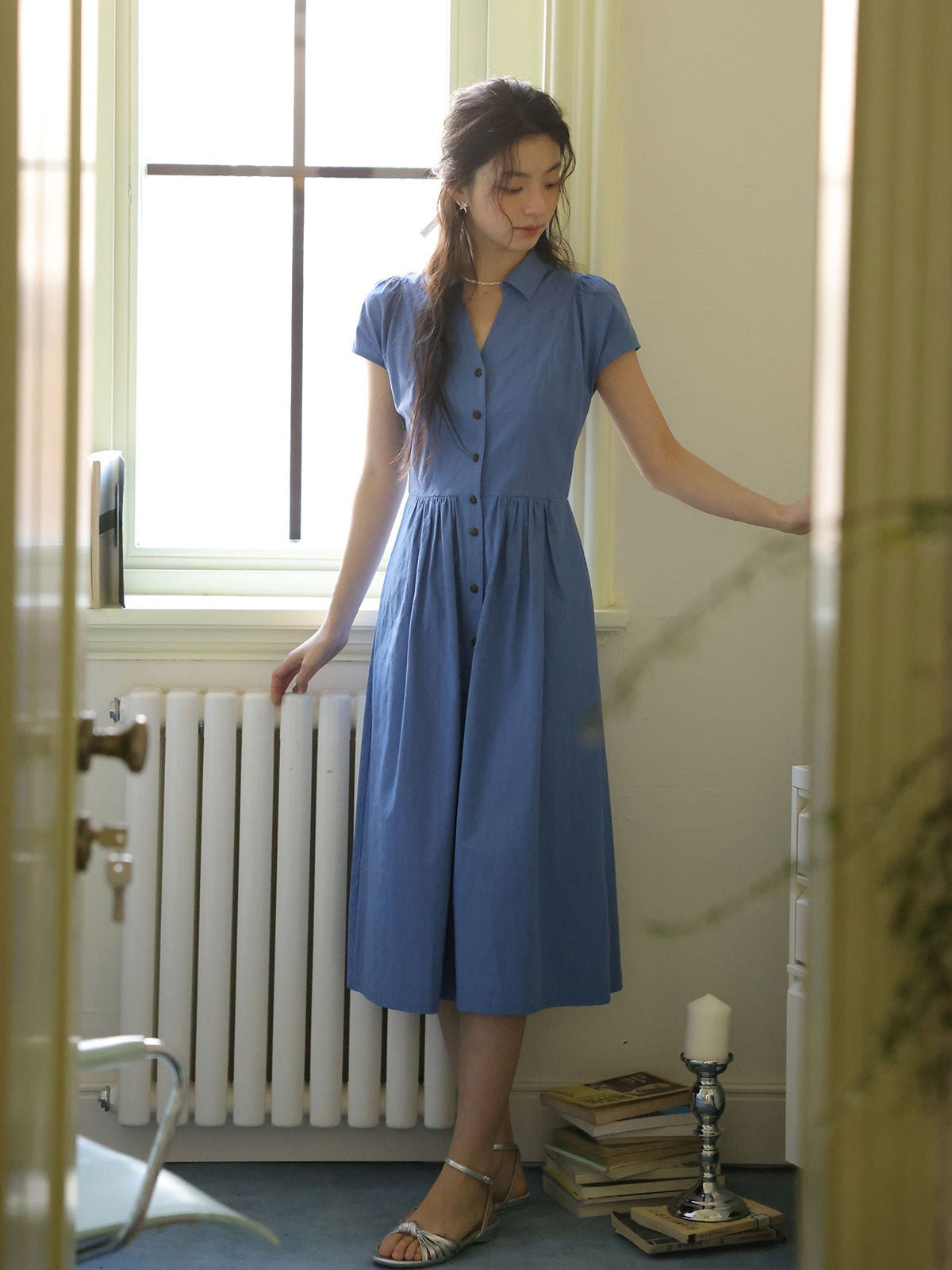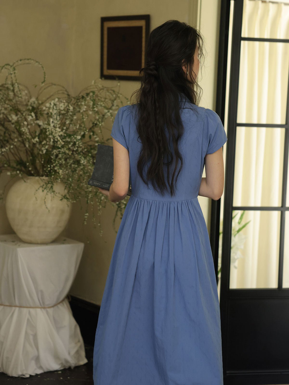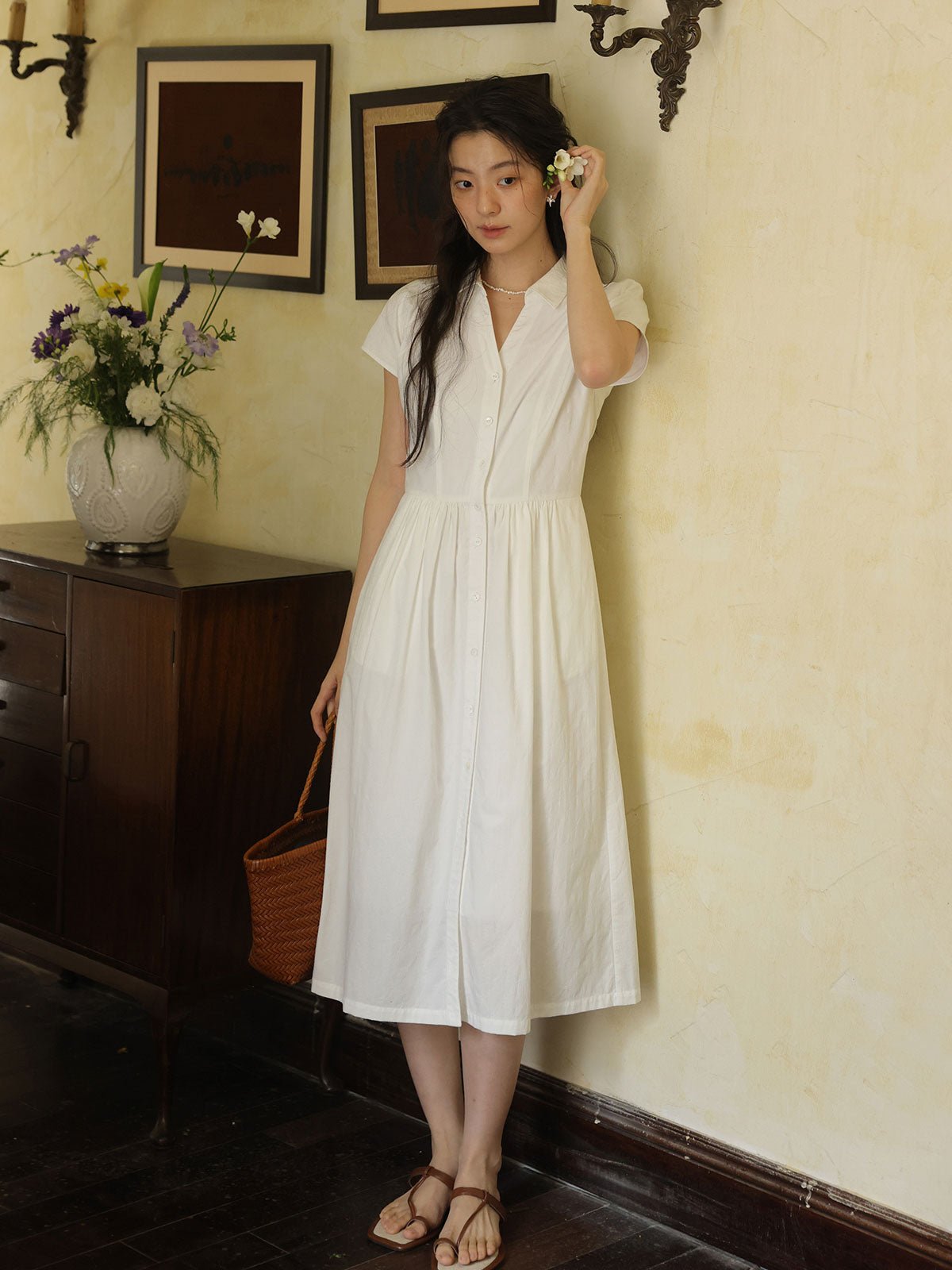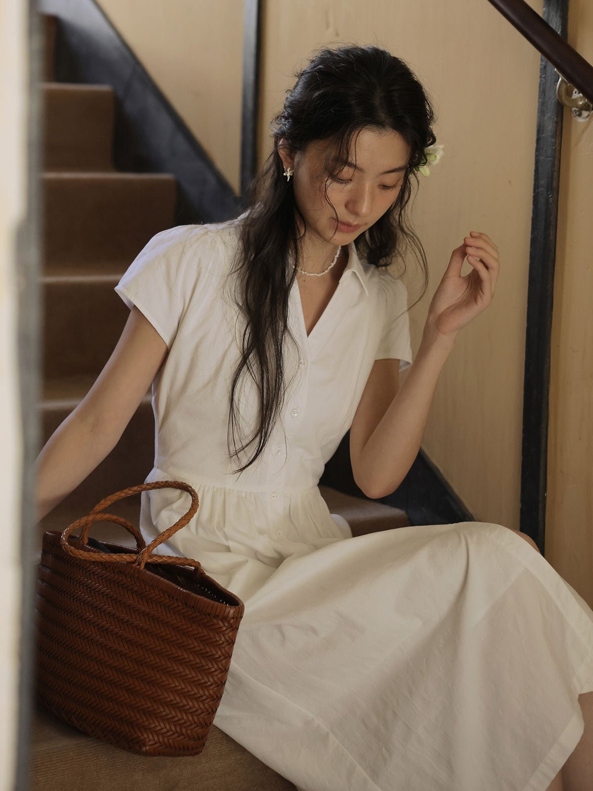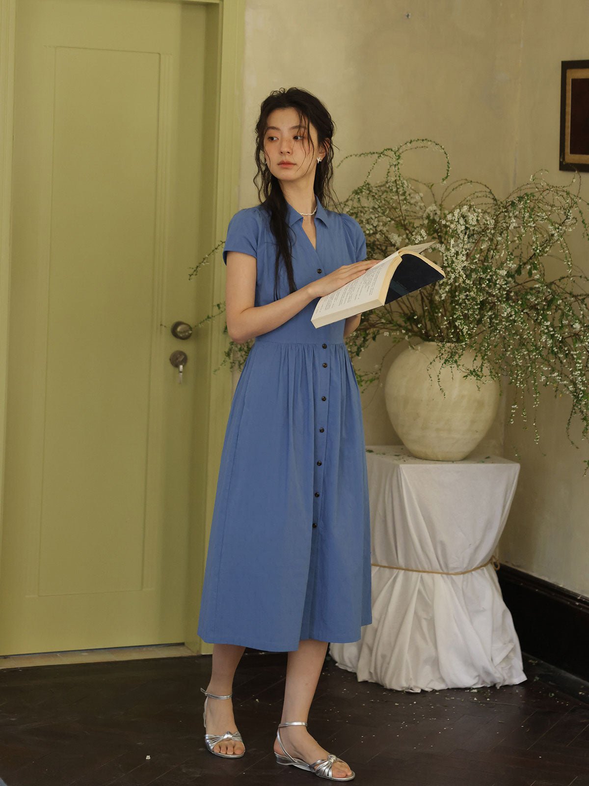 このフレンチレトロスタイルのロングワンピースは、100% コットン素材で作られており、快適さと通気性を提供します。Vネックと組み合わされたシャツカラーは洗練された印象を与え、ウエストのギャザーはさまざまな体型に美しくフィットします。ミディアム丈はさまざまな身長の人にも適しており、シェルボタン(白い色モデル)またはアンバーボタン(青い色モデル)がアクセントになっています。ウエストに施されたプリーツはスリムな見た目を強調し、ショートスリーブには軽いギャザーが加えられ、体型をカバーします。