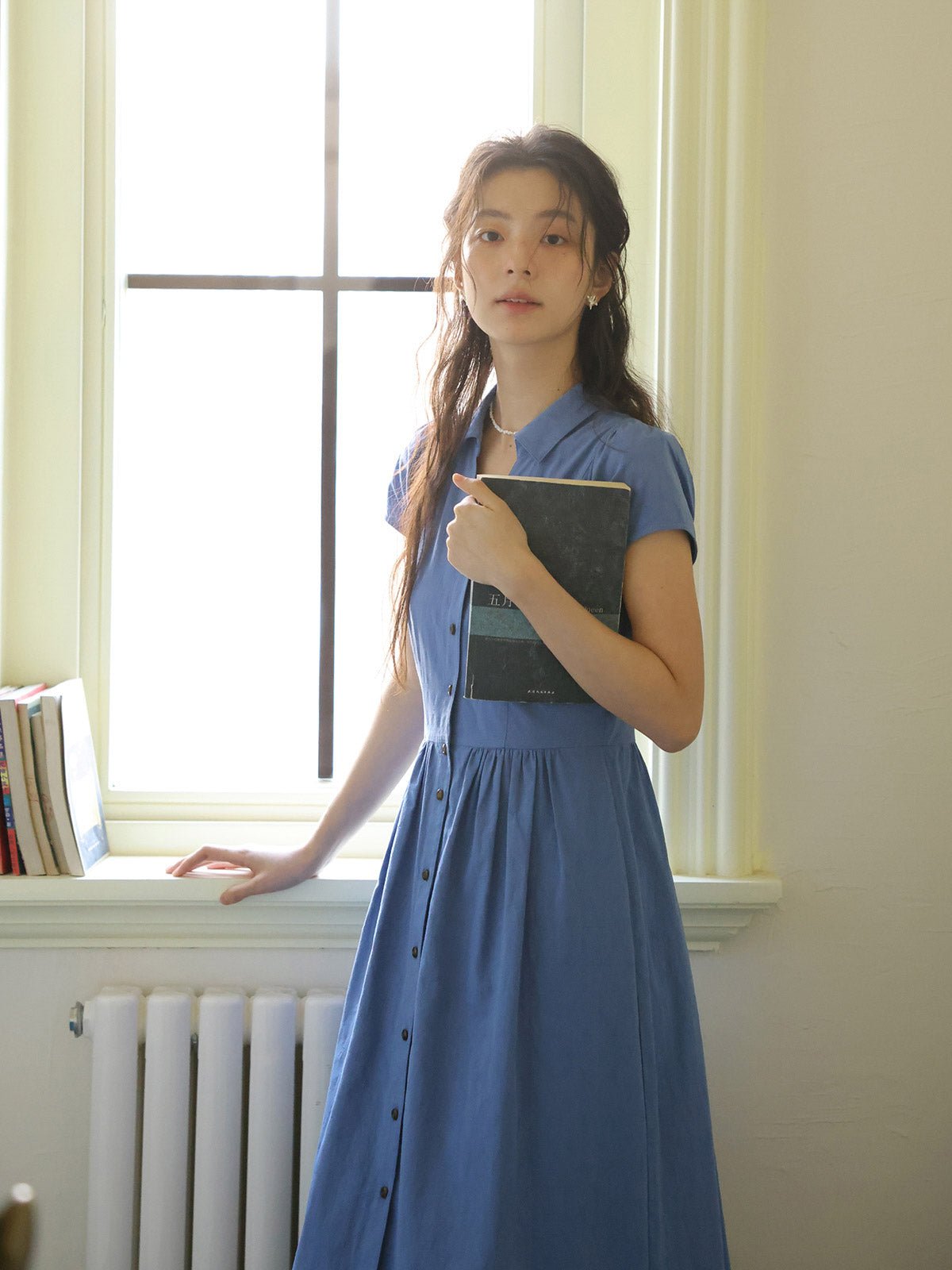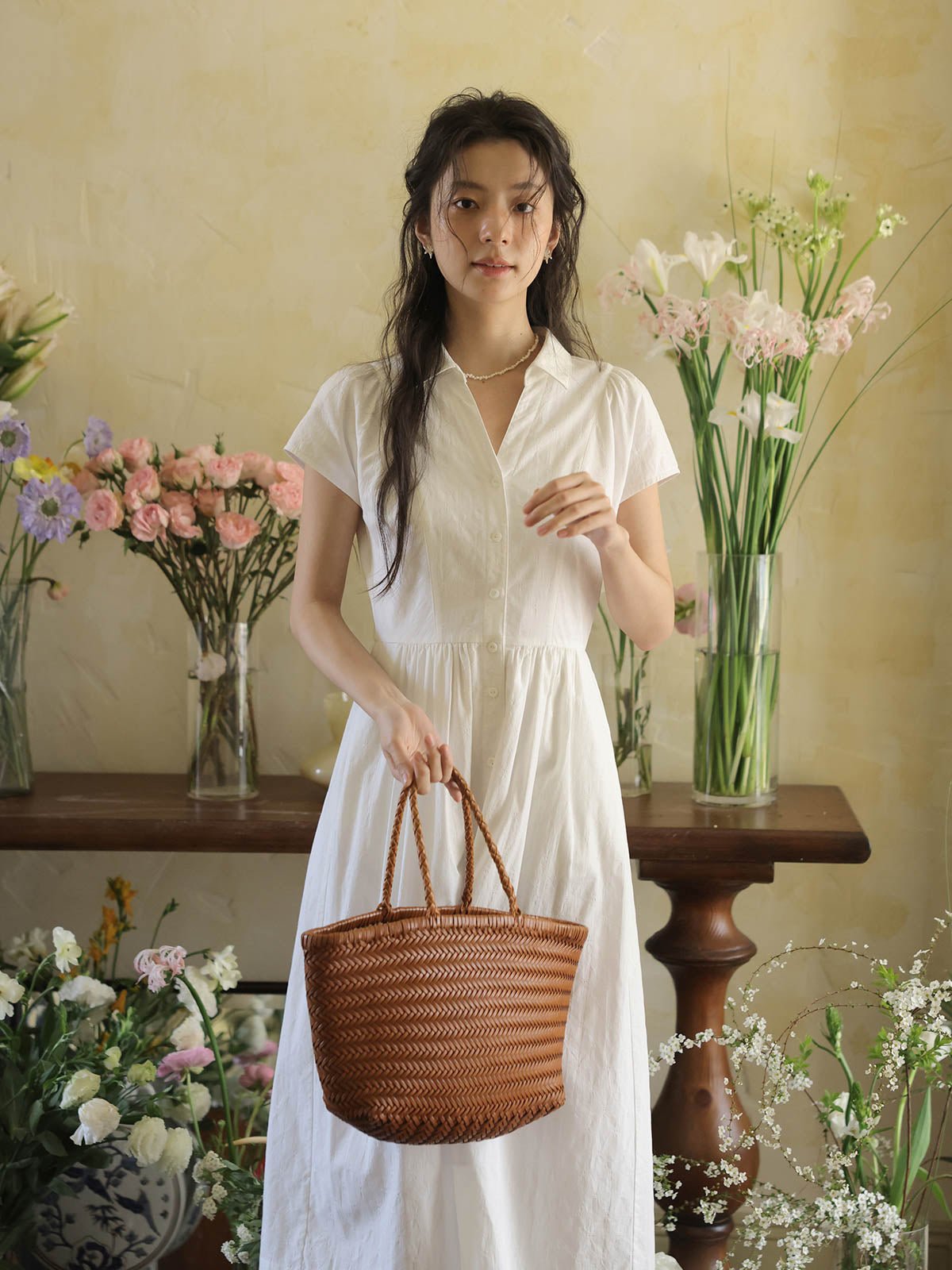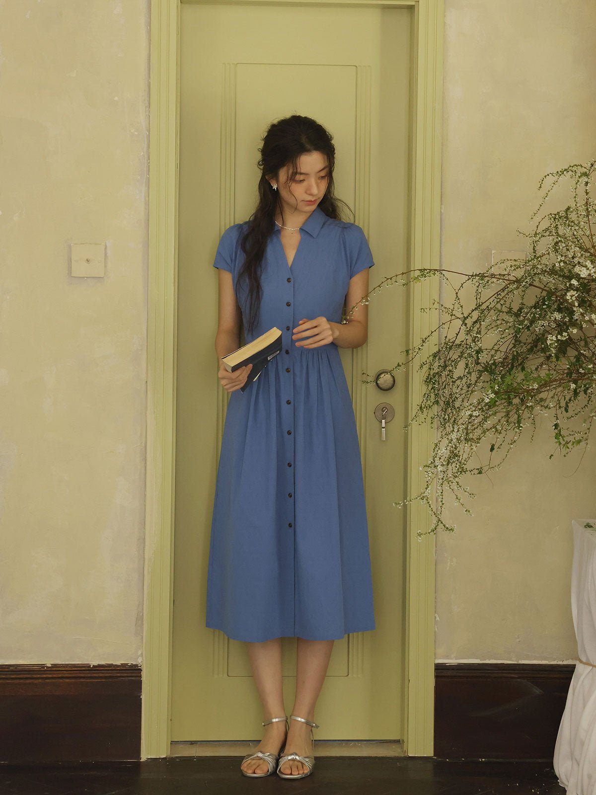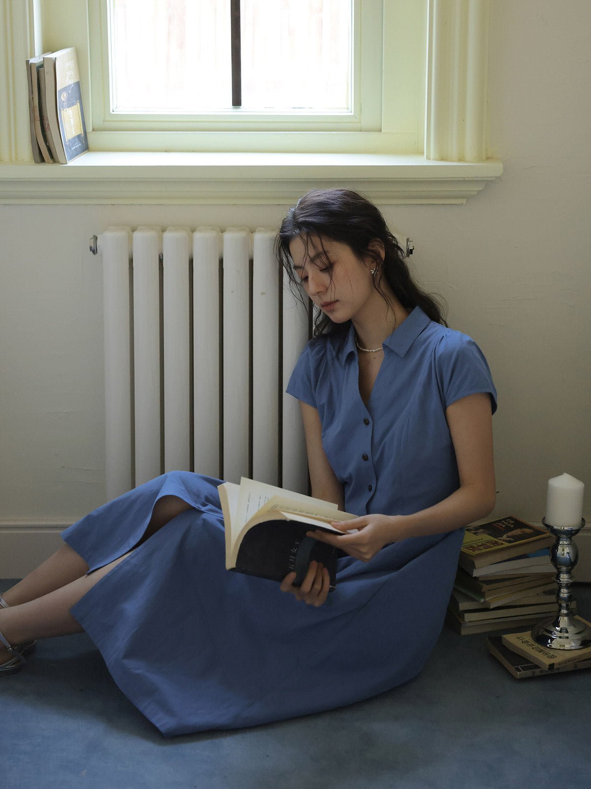 このフレンチレトロスタイルのロングワンピースは、100% コットン素材で作られており、快適さと通気性を提供します。Vネックと組み合わされたシャツカラーは洗練された印象を与え、ウエストのギャザーはさまざまな体型に美しくフィットします。ミディアム丈はさまざまな身長の人にも適しており、シェルボタン(白い色モデル)またはアンバーボタン(青い色モデル)がアクセントになっています。ウエストに施されたプリーツはスリムな見た目を強調し、ショートスリーブには軽いギャザーが加えられ、体型をカバーします。