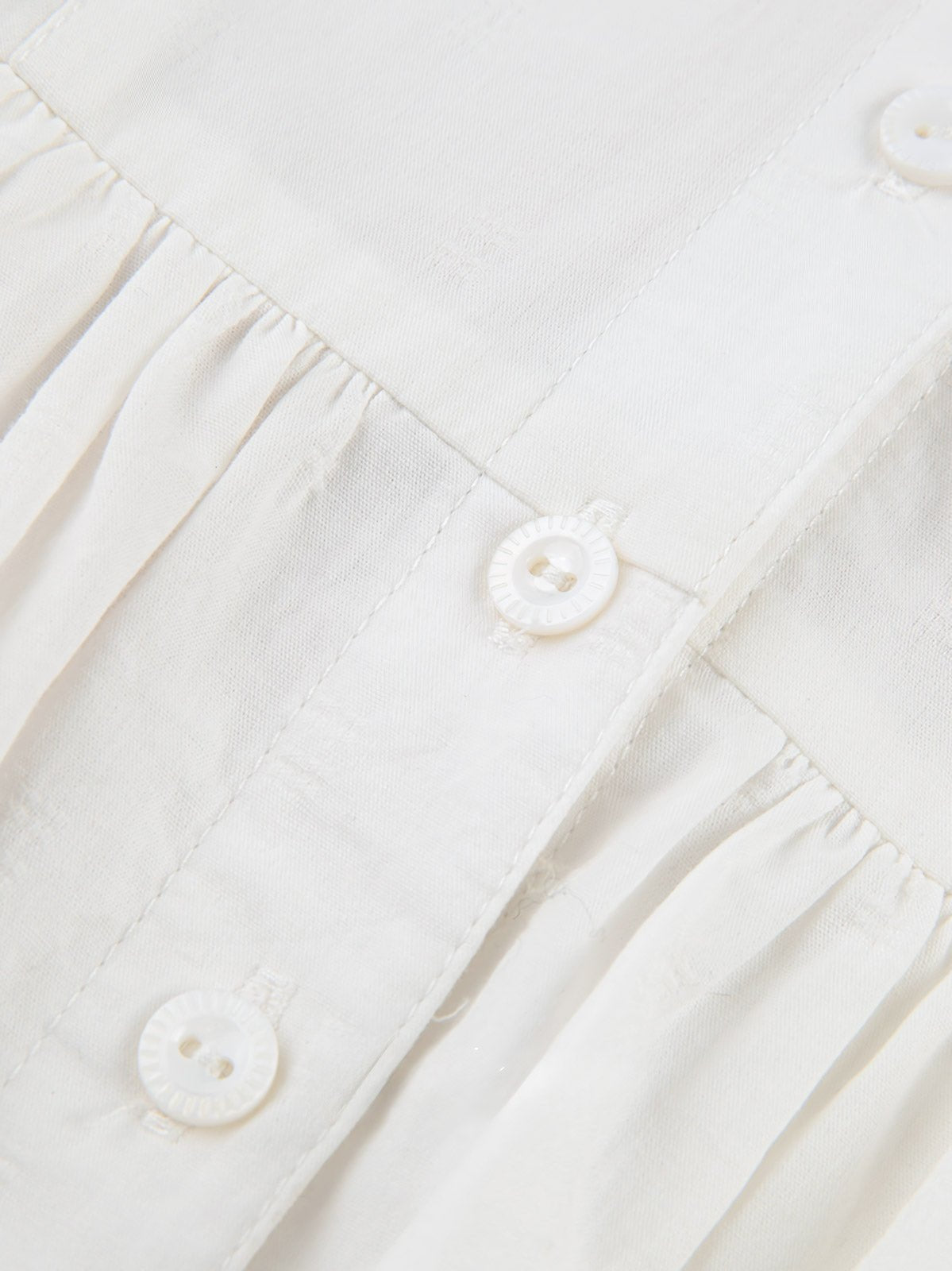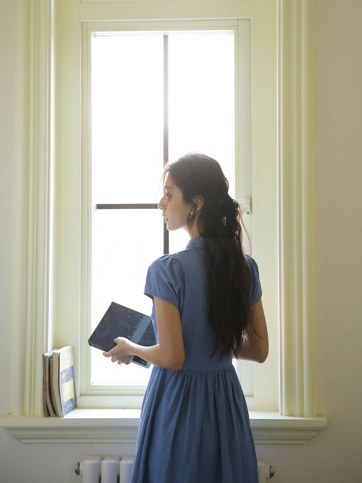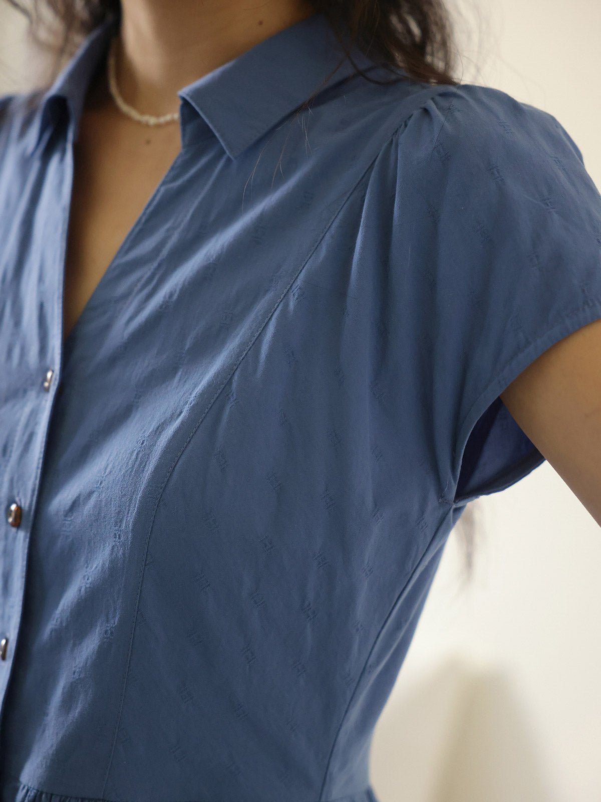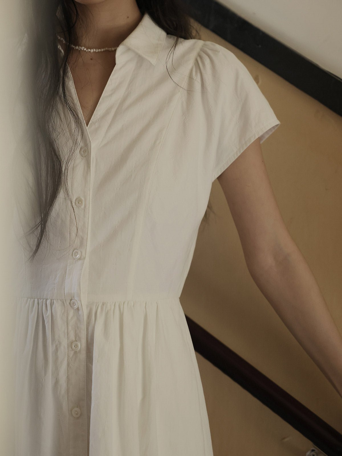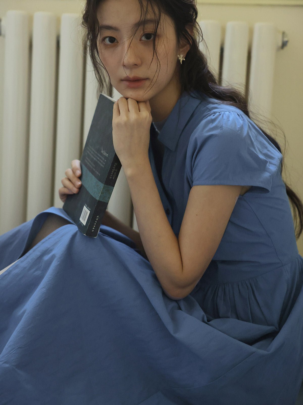 このフレンチレトロスタイルのロングワンピースは、100% コットン素材で作られており、快適さと通気性を提供します。Vネックと組み合わされたシャツカラーは洗練された印象を与え、ウエストのギャザーはさまざまな体型に美しくフィットします。ミディアム丈はさまざまな身長の人にも適しており、シェルボタン(白い色モデル)またはアンバーボタン(青い色モデル)がアクセントになっています。ウエストに施されたプリーツはスリムな見た目を強調し、ショートスリーブには軽いギャザーが加えられ、体型をカバーします。