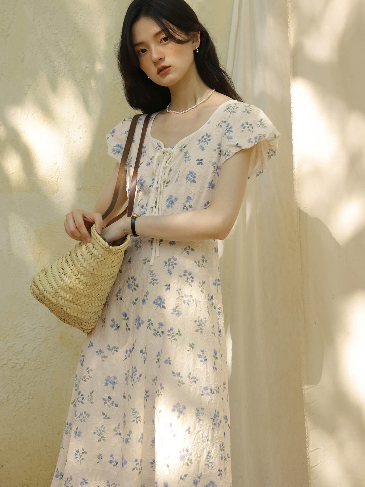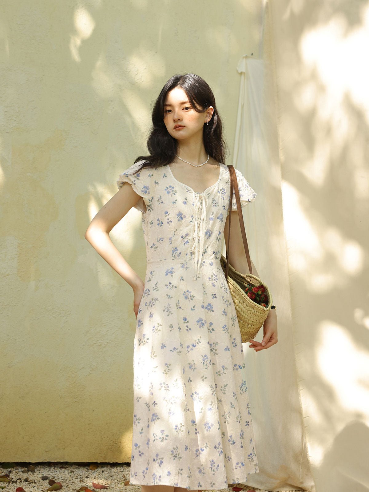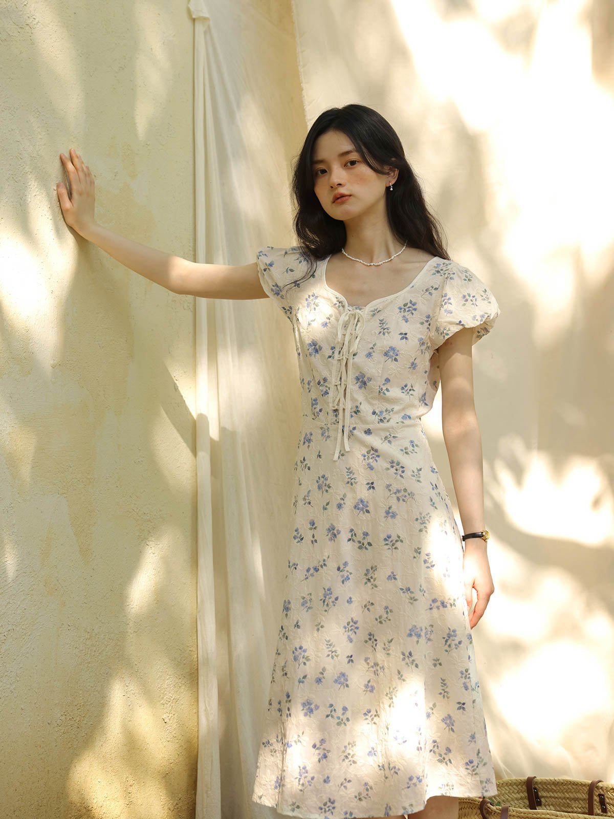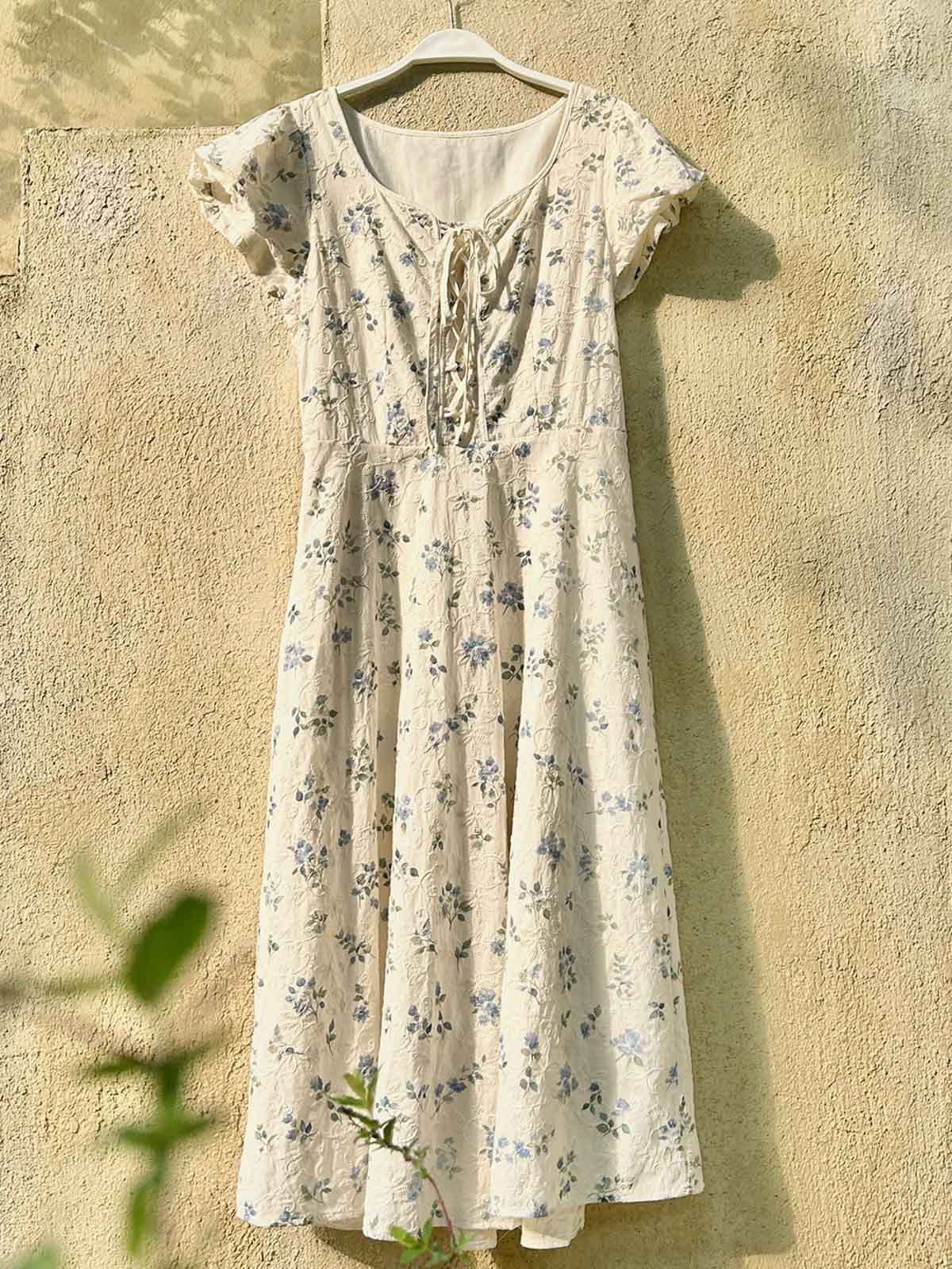 このワンピースは、100%コットン素材を使用しており、快適で通気性に優れています。Xラインのデザインにより、ウエストを絞り、腰のラインを整えてスリム見え効果を高めます。ミディ丈のシルエットは、身長を問わず、特に小柄な女性にもぴったりです。スクエア型のハートネックデザインが肩と首のラインを引き立て、女性らしい優美さをプラスします。半開きのフロントボタンと精巧なリボンデザインがディテールへのこだわりを感じさせます。サイドシームに隠れたジッパーで、着脱が簡単です。小さなパフスリーブは立体的で形が良く、エレガントでありながら洗練された印象を与えます。手の込んだ刺繍と精緻なカッティングが特徴で、夏の必須アイテムです。
