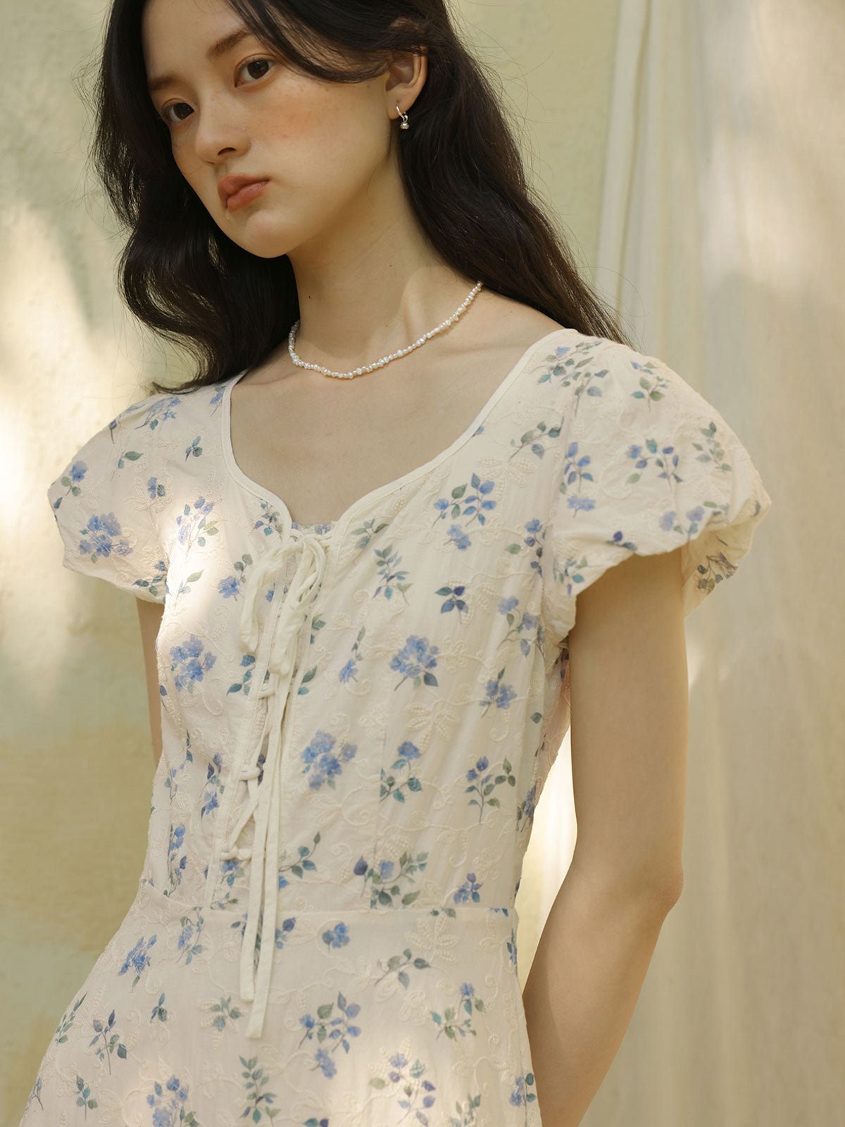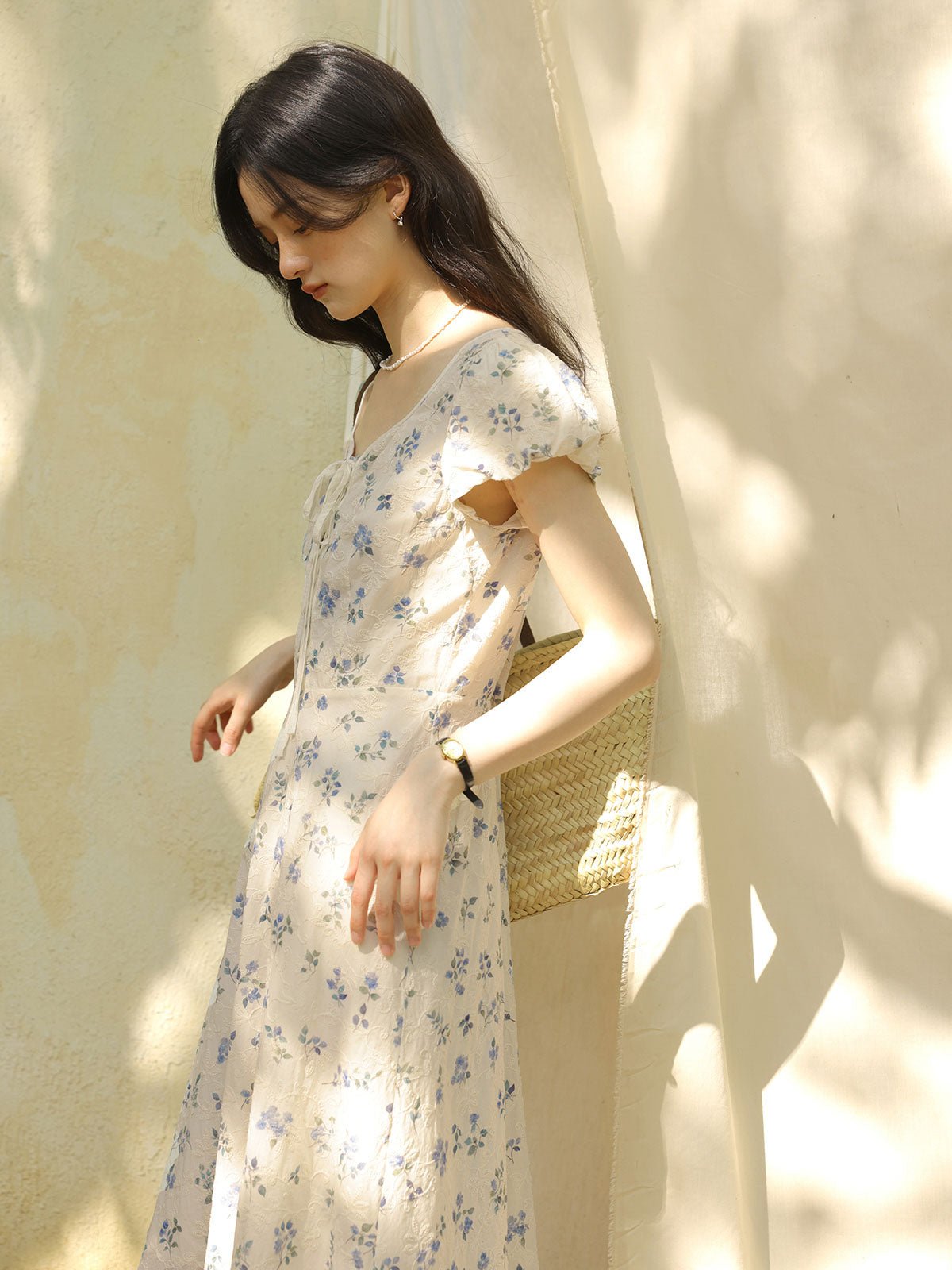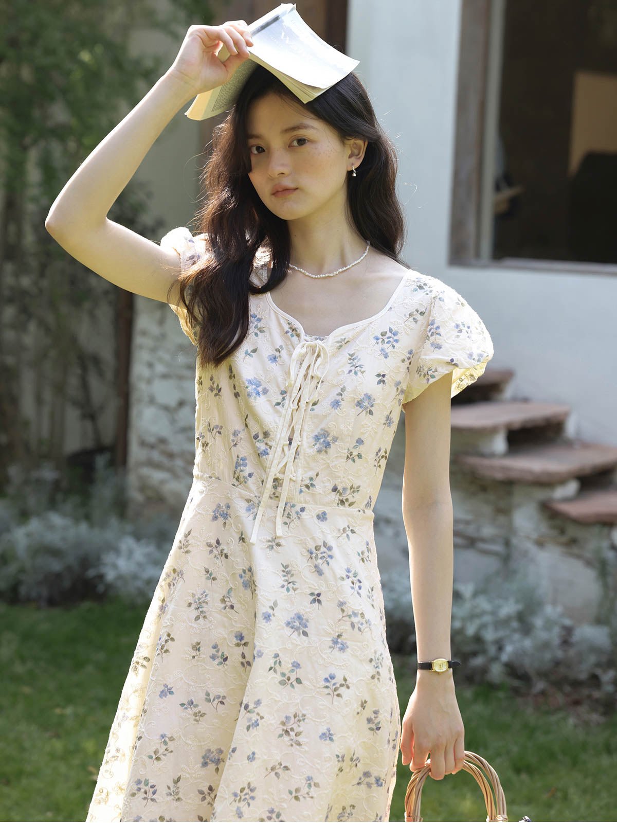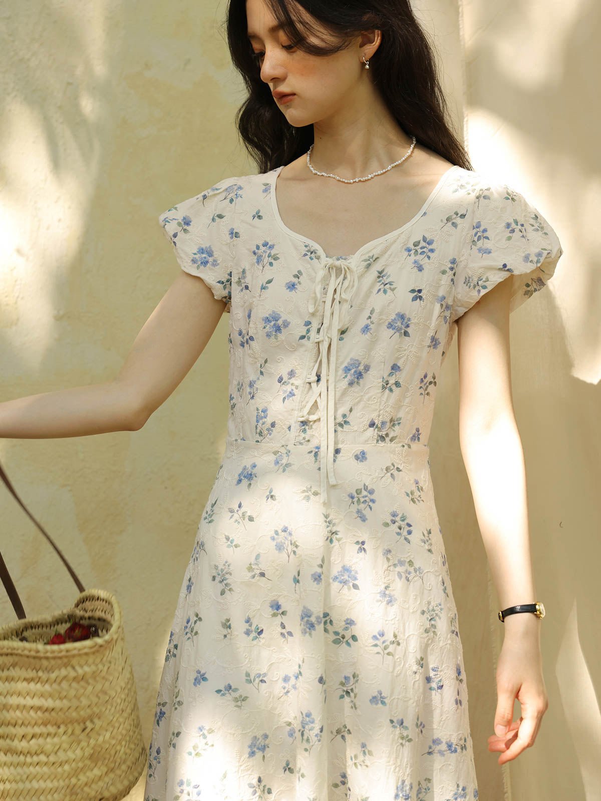 このワンピースは、100%コットン素材を使用しており、快適で通気性に優れています。Xラインのデザインにより、ウエストを絞り、腰のラインを整えてスリム見え効果を高めます。ミディ丈のシルエットは、身長を問わず、特に小柄な女性にもぴったりです。スクエア型のハートネックデザインが肩と首のラインを引き立て、女性らしい優美さをプラスします。半開きのフロントボタンと精巧なリボンデザインがディテールへのこだわりを感じさせます。サイドシームに隠れたジッパーで、着脱が簡単です。小さなパフスリーブは立体的で形が良く、エレガントでありながら洗練された印象を与えます。手の込んだ刺繍と精緻なカッティングが特徴で、夏の必須アイテムです。
