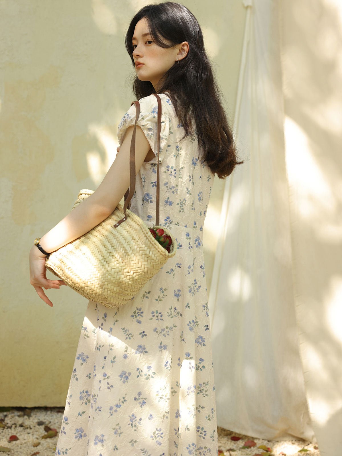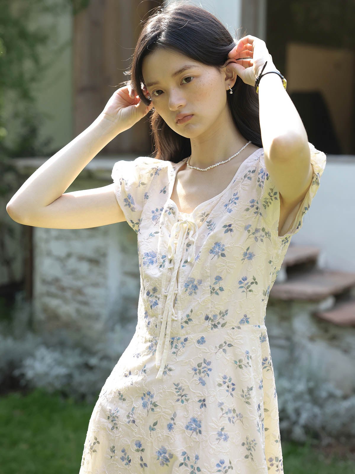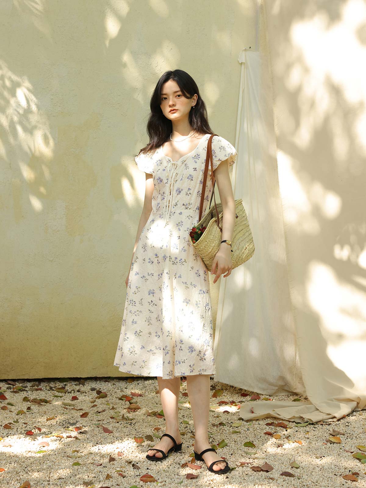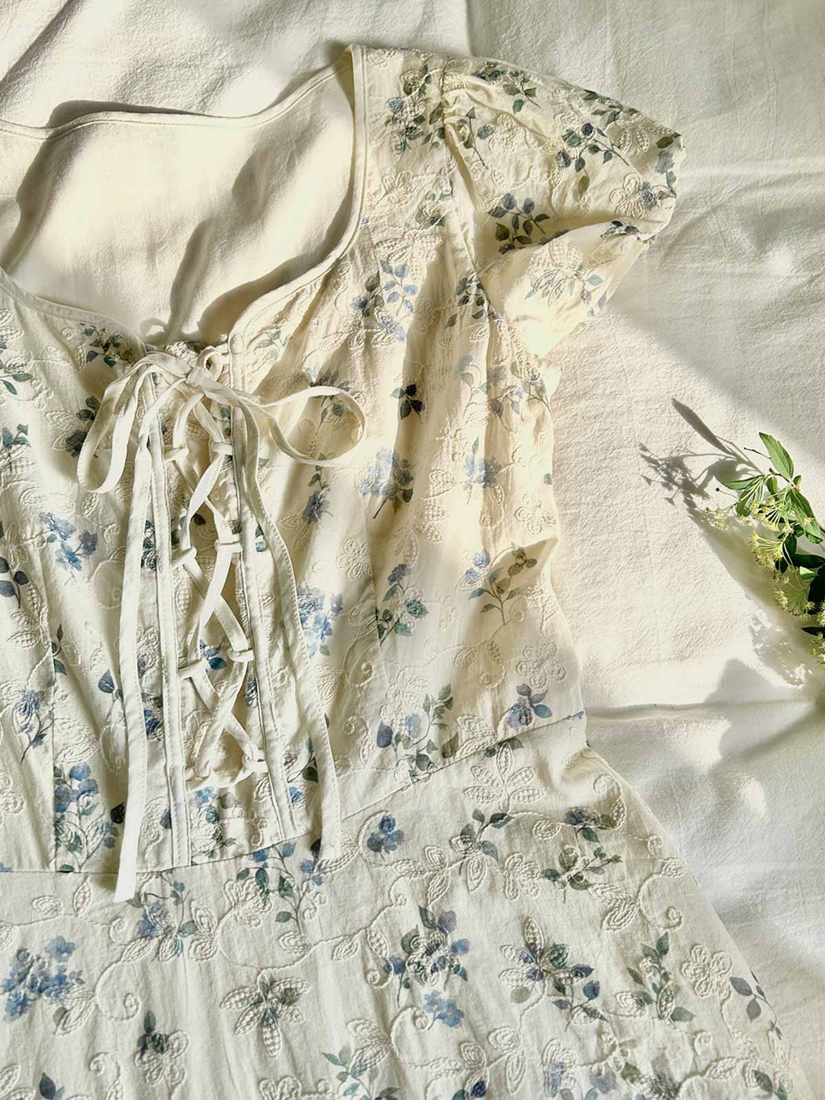 このワンピースは、100%コットン素材を使用しており、快適で通気性に優れています。Xラインのデザインにより、ウエストを絞り、腰のラインを整えてスリム見え効果を高めます。ミディ丈のシルエットは、身長を問わず、特に小柄な女性にもぴったりです。スクエア型のハートネックデザインが肩と首のラインを引き立て、女性らしい優美さをプラスします。半開きのフロントボタンと精巧なリボンデザインがディテールへのこだわりを感じさせます。サイドシームに隠れたジッパーで、着脱が簡単です。小さなパフスリーブは立体的で形が良く、エレガントでありながら洗練された印象を与えます。手の込んだ刺繍と精緻なカッティングが特徴で、夏の必須アイテムです。