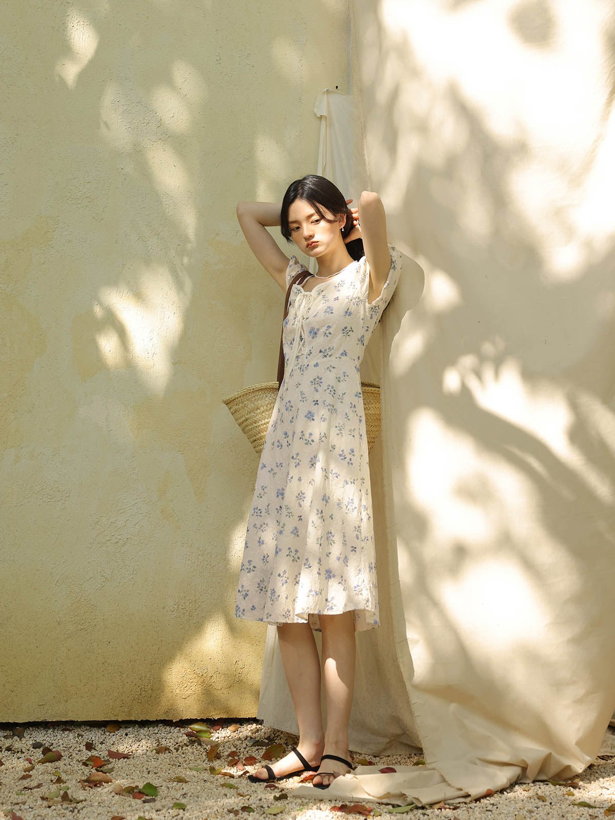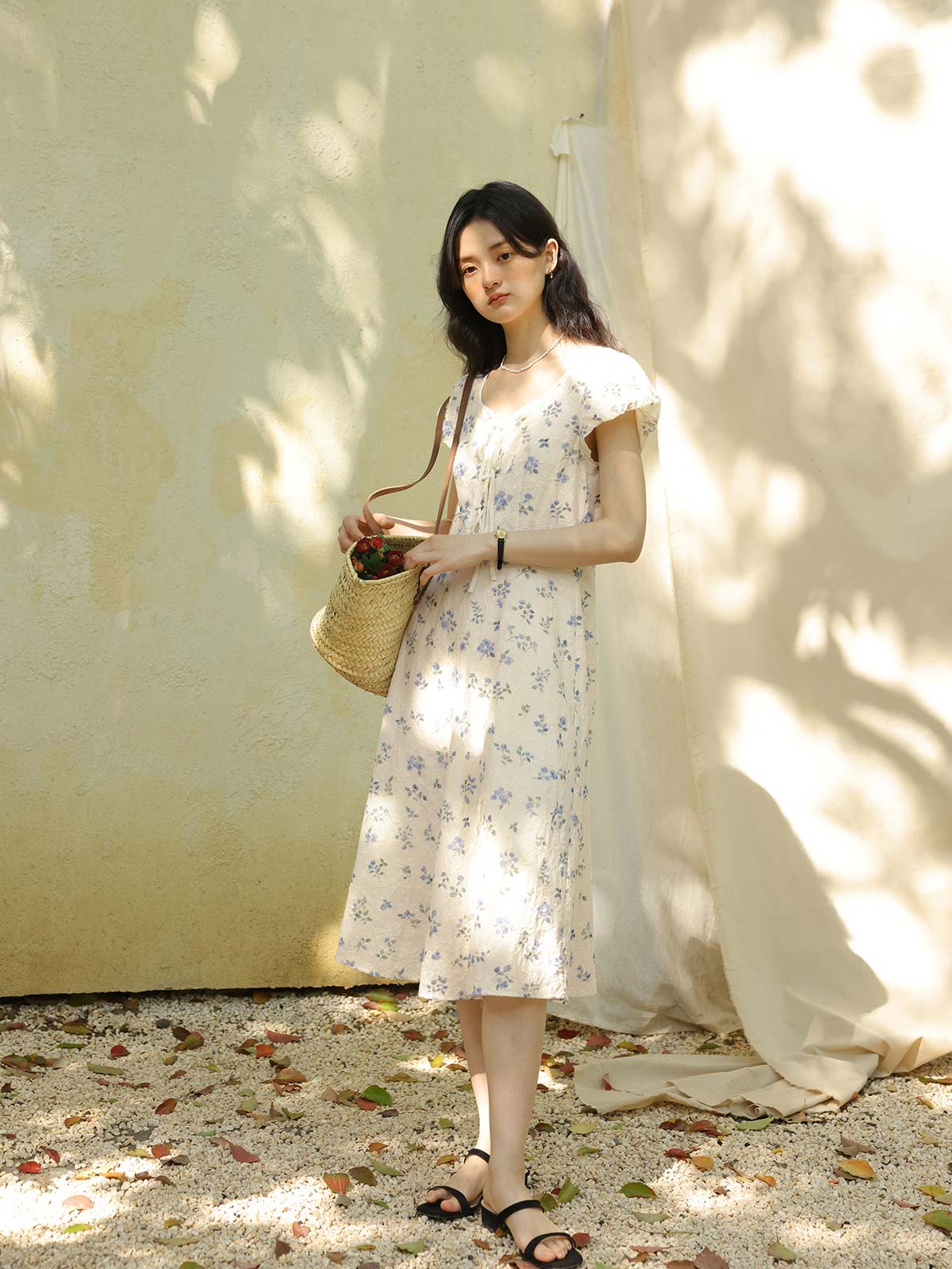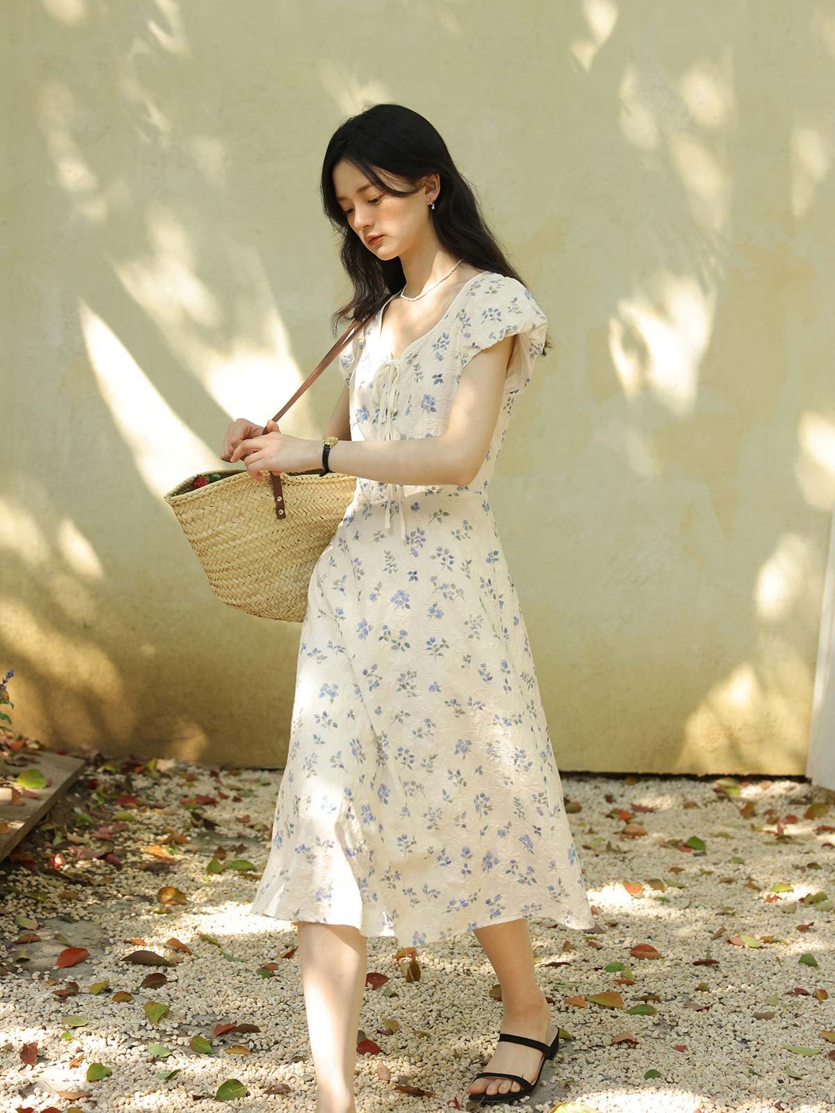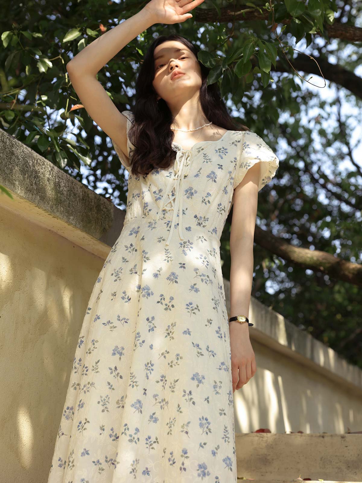 このワンピースは、100%コットン素材を使用しており、快適で通気性に優れています。Xラインのデザインにより、ウエストを絞り、腰のラインを整えてスリム見え効果を高めます。ミディ丈のシルエットは、身長を問わず、特に小柄な女性にもぴったりです。スクエア型のハートネックデザインが肩と首のラインを引き立て、女性らしい優美さをプラスします。半開きのフロントボタンと精巧なリボンデザインがディテールへのこだわりを感じさせます。サイドシームに隠れたジッパーで、着脱が簡単です。小さなパフスリーブは立体的で形が良く、エレガントでありながら洗練された印象を与えます。手の込んだ刺繍と精緻なカッティングが特徴で、夏の必須アイテムです。
