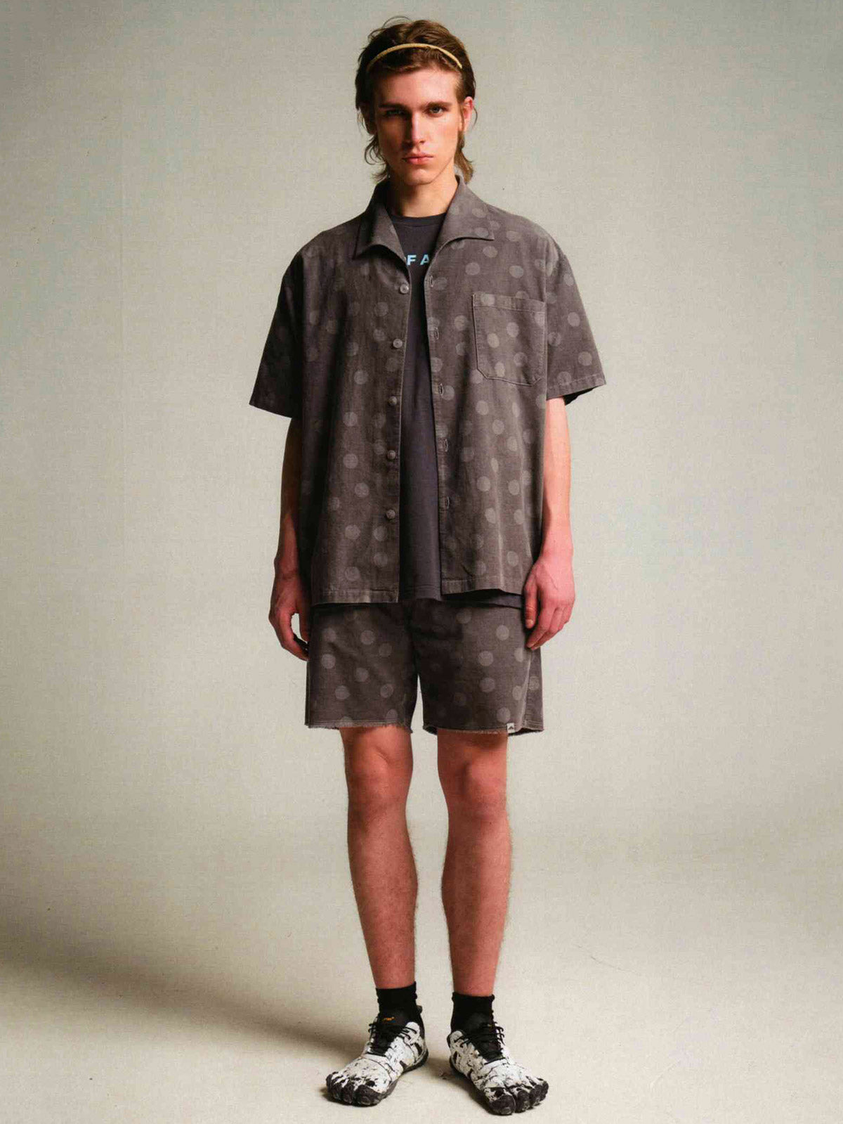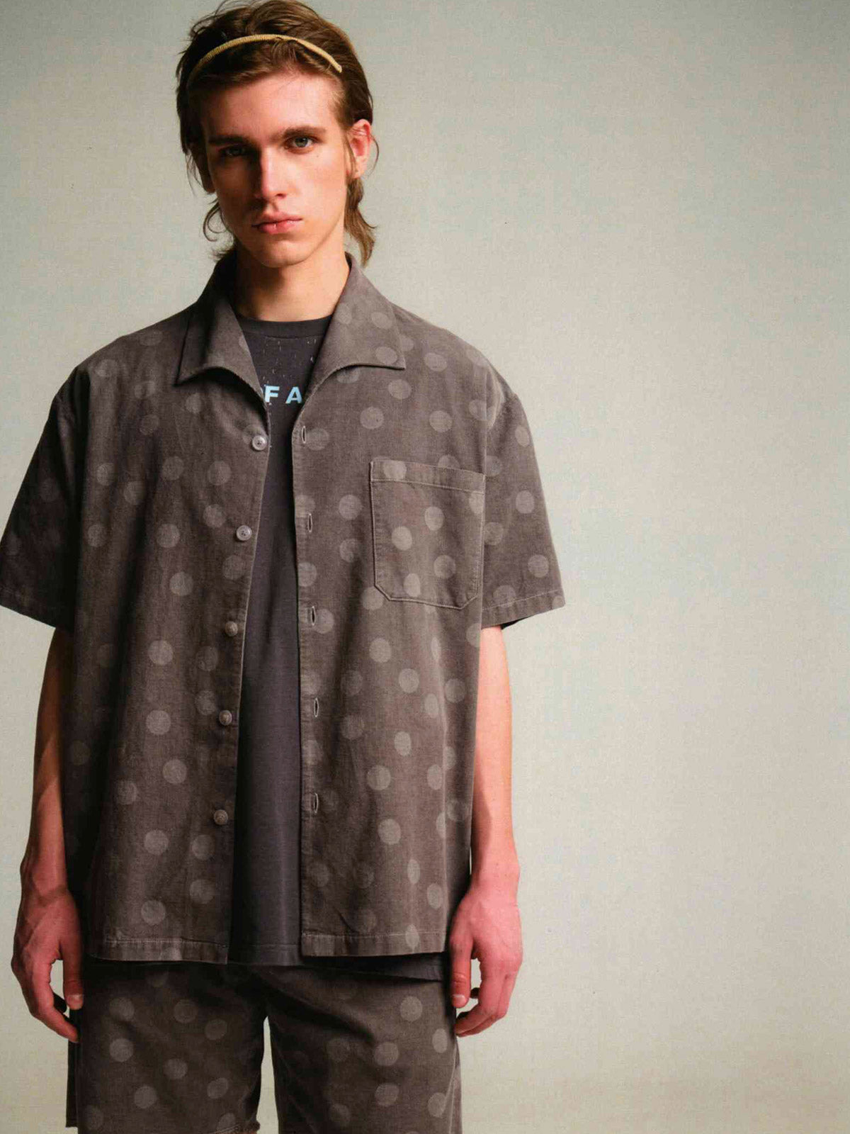 手描きドットの焦げ跡デザイン、エコフレンドリーなコーデュロイ素材。