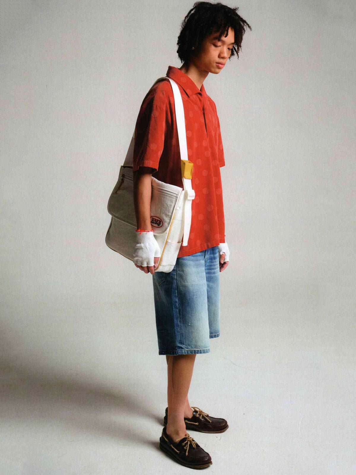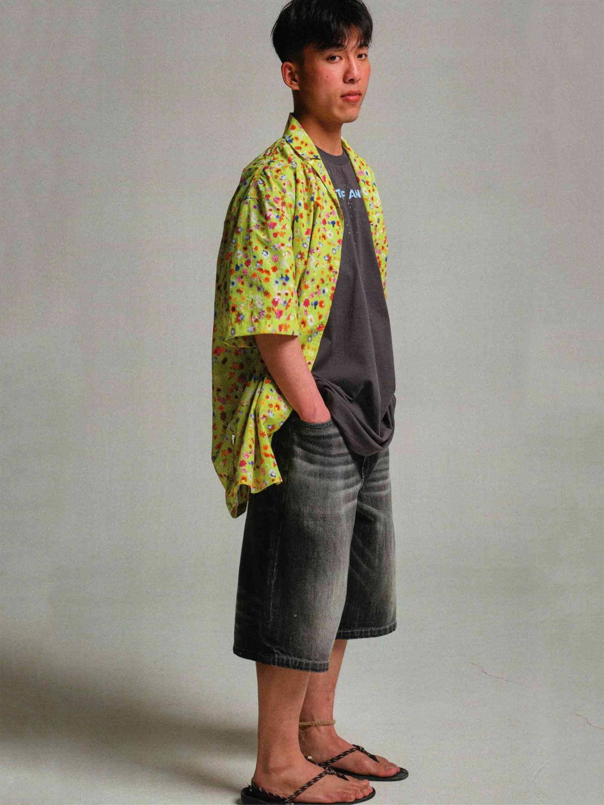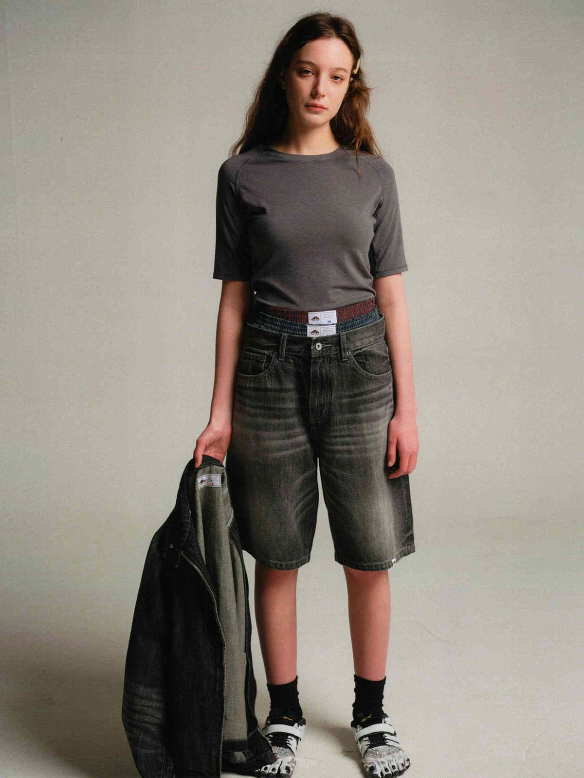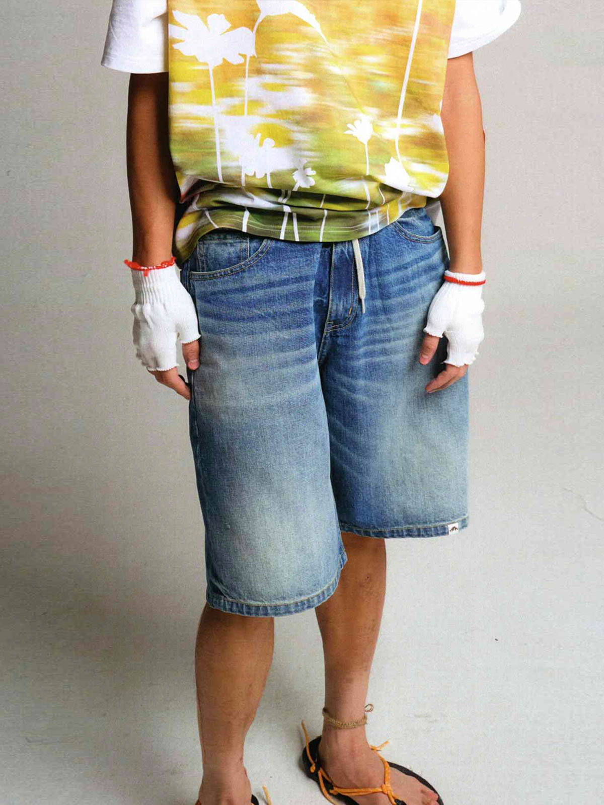 この50年代風ワイドウォッシュデニムショートパンツは、ヴィンテージ感のある竹節織デニム生地を使用し、100%コットン素材で快適かつ耐久性に優れています。デザインのインスピレーションは50年代に由来し、ハイウエストとワイドレッグのシルエットが特徴です。ジップフライデザインで着脱が容易で、5つのポケットが実用性を高めています。背面のポケットにはクラシックな山脈ラインの刺繍が施され、細部にこだわった品質が伺えます。パンツは複数回のダメージ加工とウォッシュ加工が施されており、自然な色落ちがヴィンテージ感を演出します。同じシリーズのトップスと合わせて、クラシックなコーディネートを楽しめます。