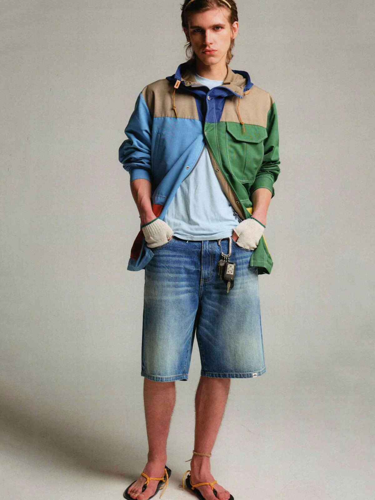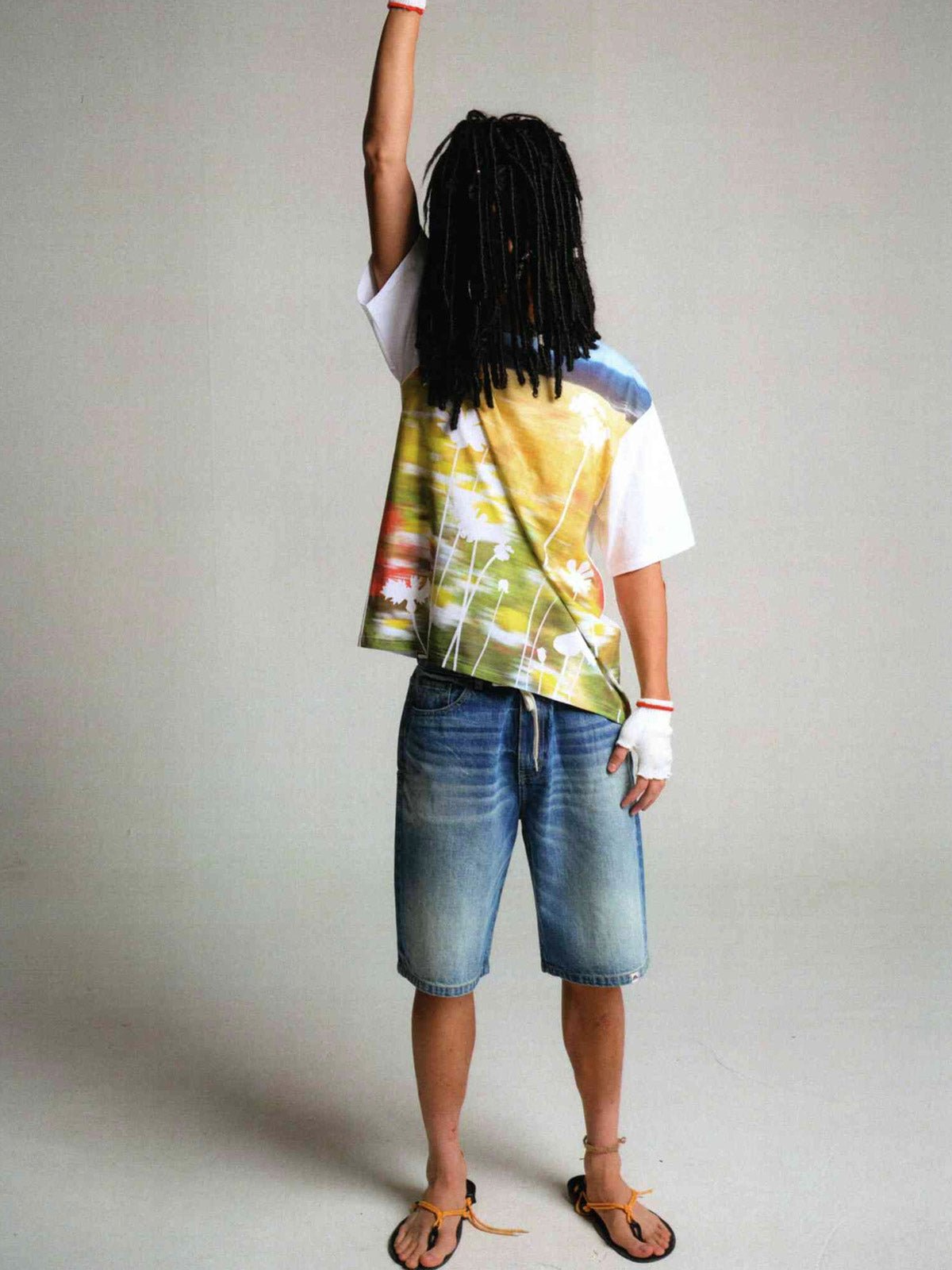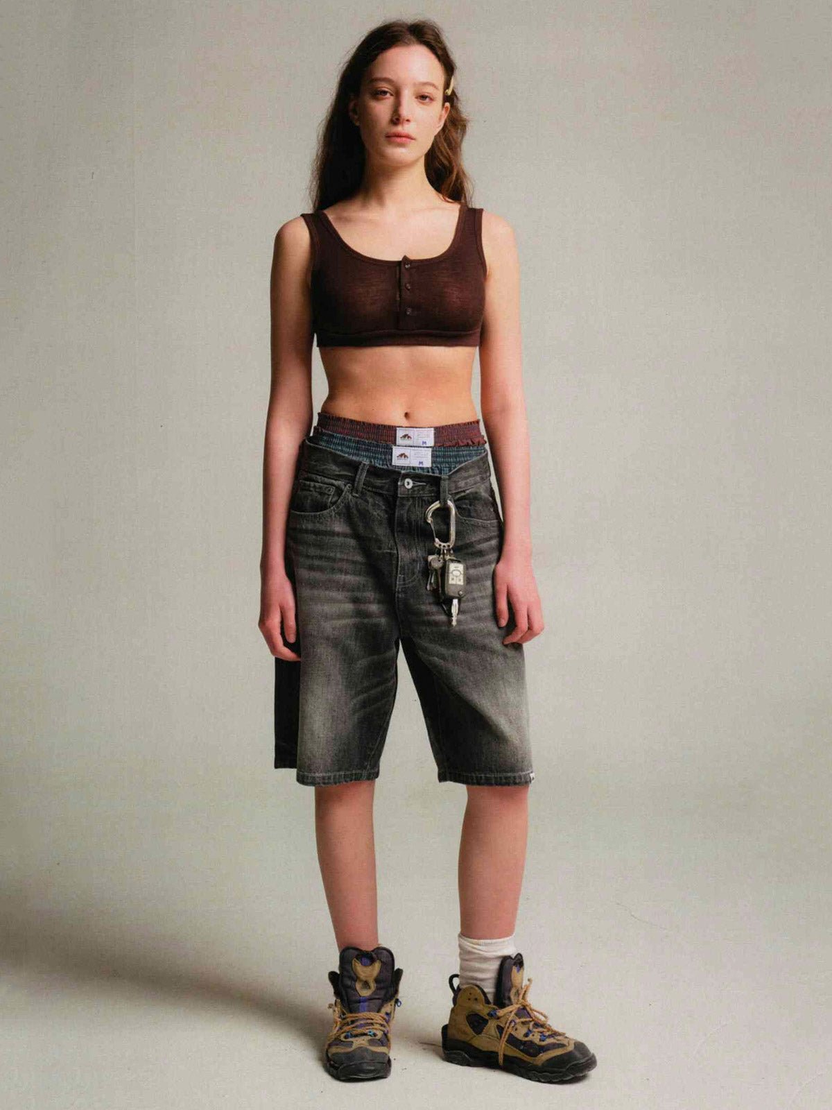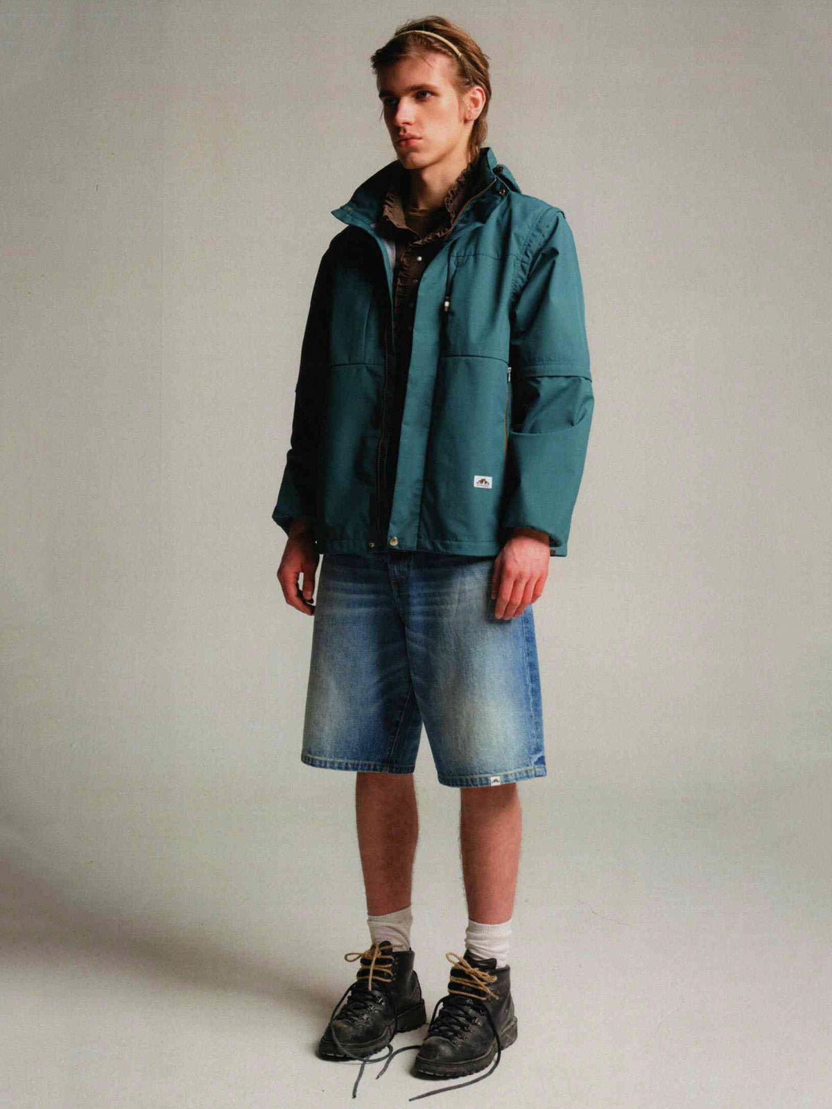 この50年代風ワイドウォッシュデニムショートパンツは、ヴィンテージ感のある竹節織デニム生地を使用し、100%コットン素材で快適かつ耐久性に優れています。デザインのインスピレーションは50年代に由来し、ハイウエストとワイドレッグのシルエットが特徴です。ジップフライデザインで着脱が容易で、5つのポケットが実用性を高めています。背面のポケットにはクラシックな山脈ラインの刺繍が施され、細部にこだわった品質が伺えます。パンツは複数回のダメージ加工とウォッシュ加工が施されており、自然な色落ちがヴィンテージ感を演出します。同じシリーズのトップスと合わせて、クラシックなコーディネートを楽しめます。