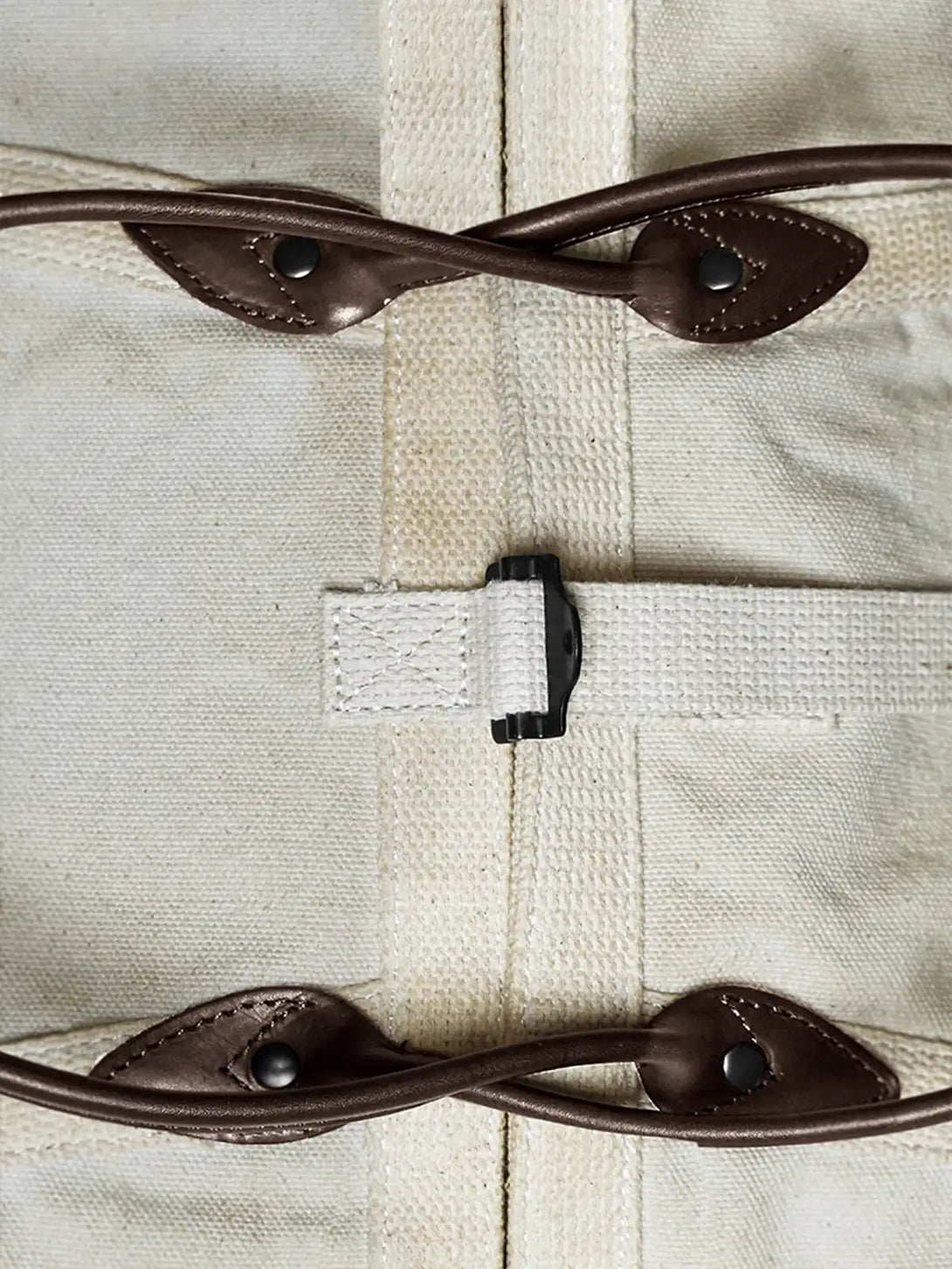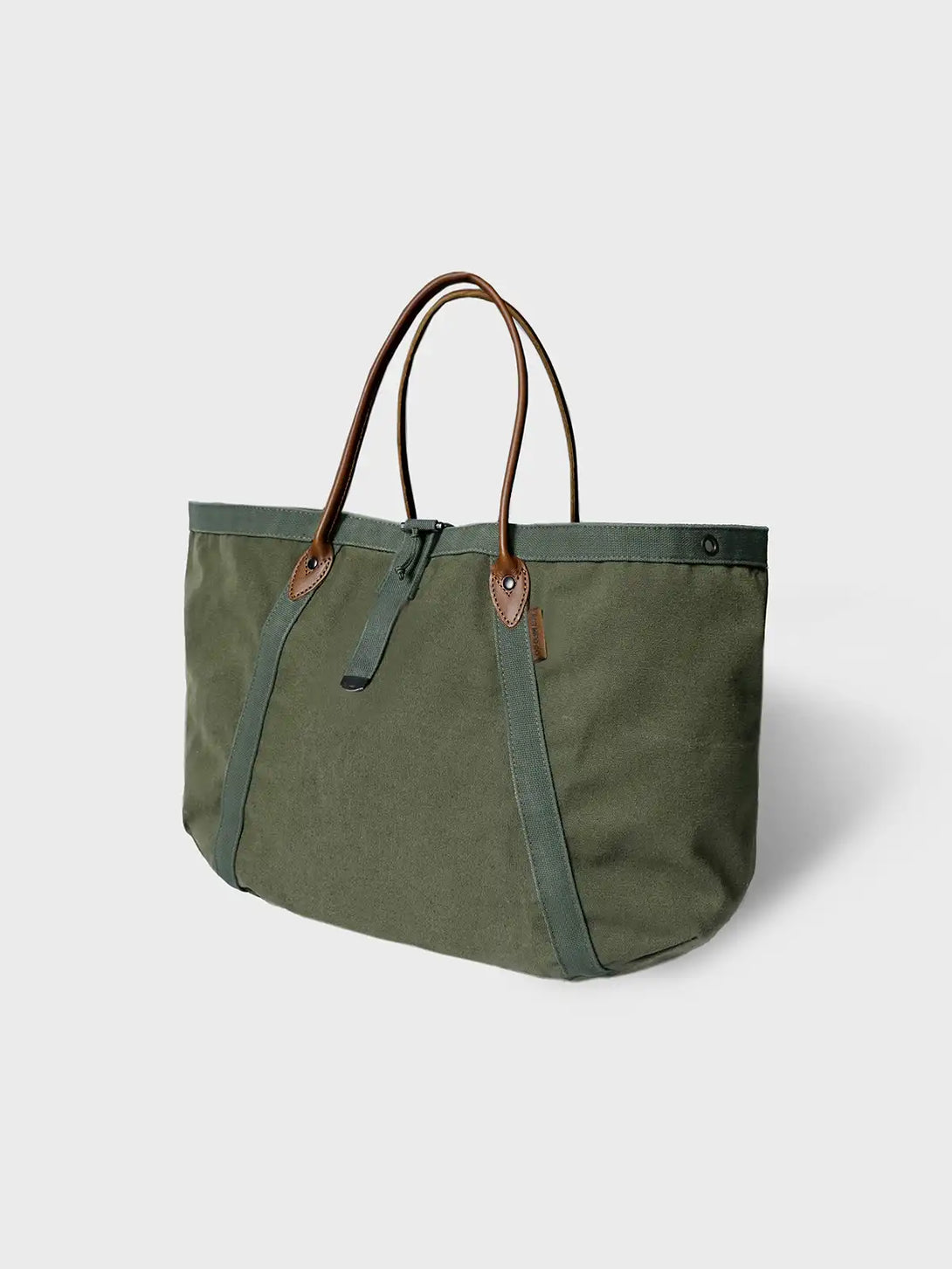 創業100年以上のアメリカンワークウェアに着想を得たこのトートは、通常のキャンバスよりも密度を高めたヘビーキャンバスを採用し、織帯で外側を補強することで抜群の耐久性を実現。口元は贅沢なレザーハンドルと真鍮製の留め具で仕上げ、出し入れのたびにヴィンテージの風合いを味わえます。約30Lのワイドな収納力はアウトドアギアから通勤スタイルまで幅広く対応し、素材の持つ経年変化が唯一無二の表情を生み出すため、長く使うほどに愛着が深まります。
