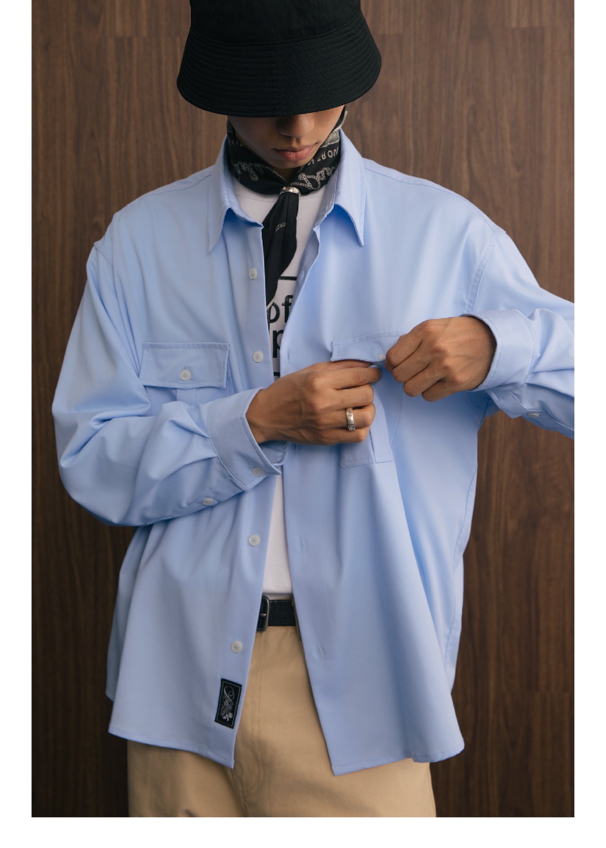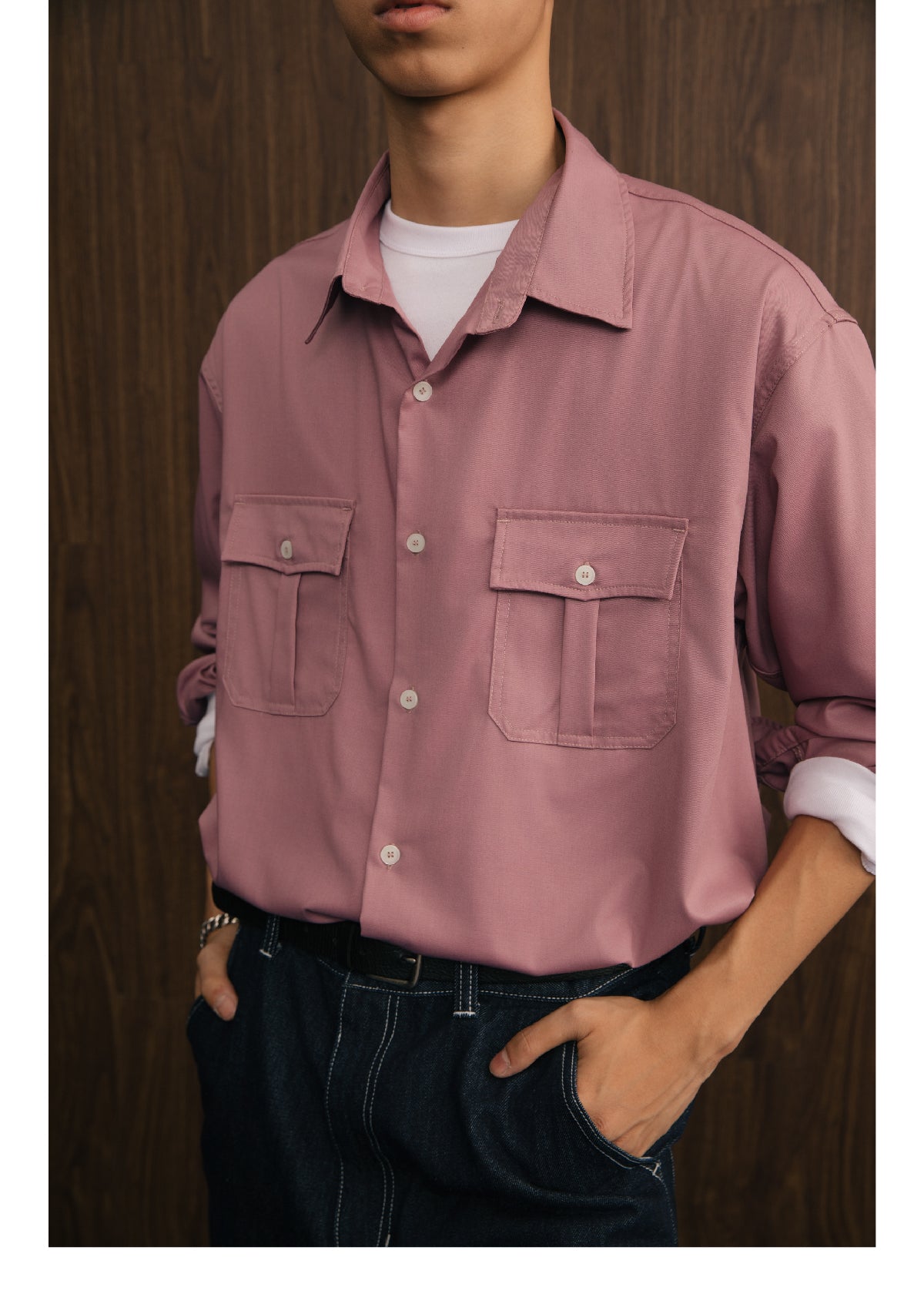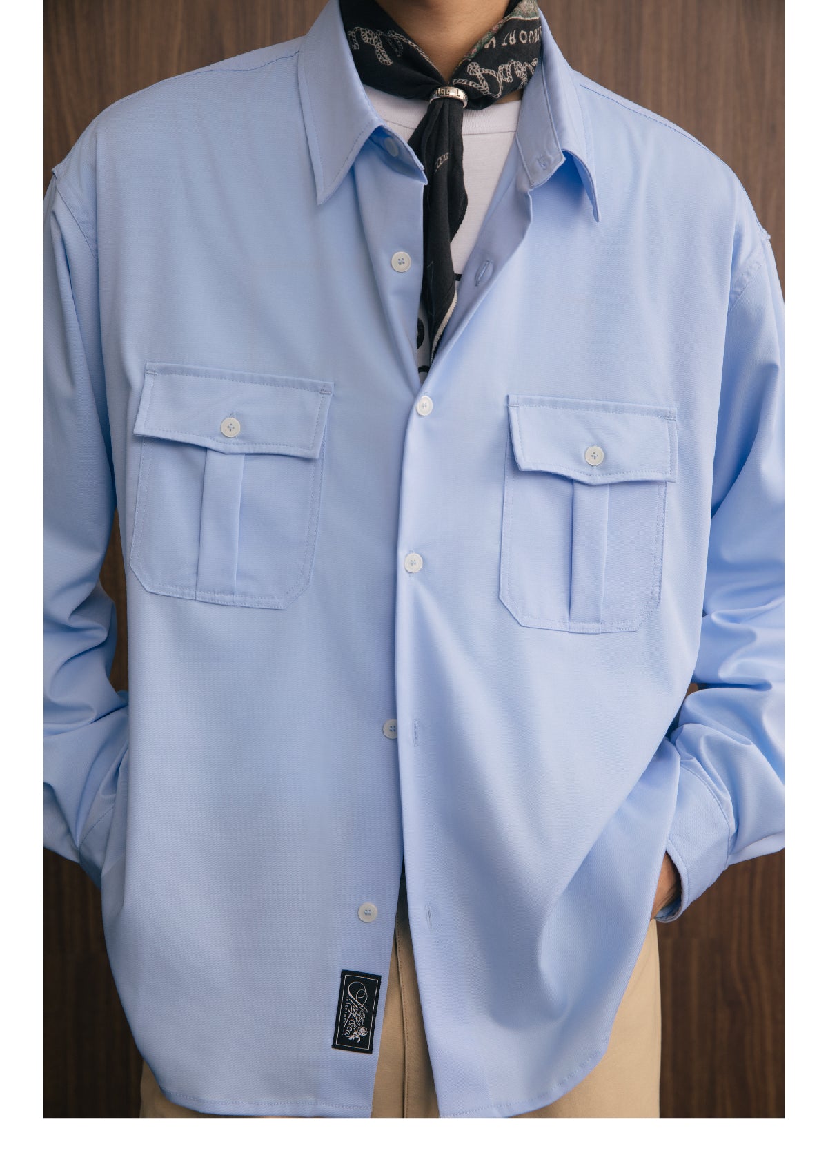 アメリカンヴィンテージスタイルのダブルポケットデザインとモダール素材の滑らかな手触りが融合し、機能性とスタイリッシュさを兼ね備えた長袖シャツ。