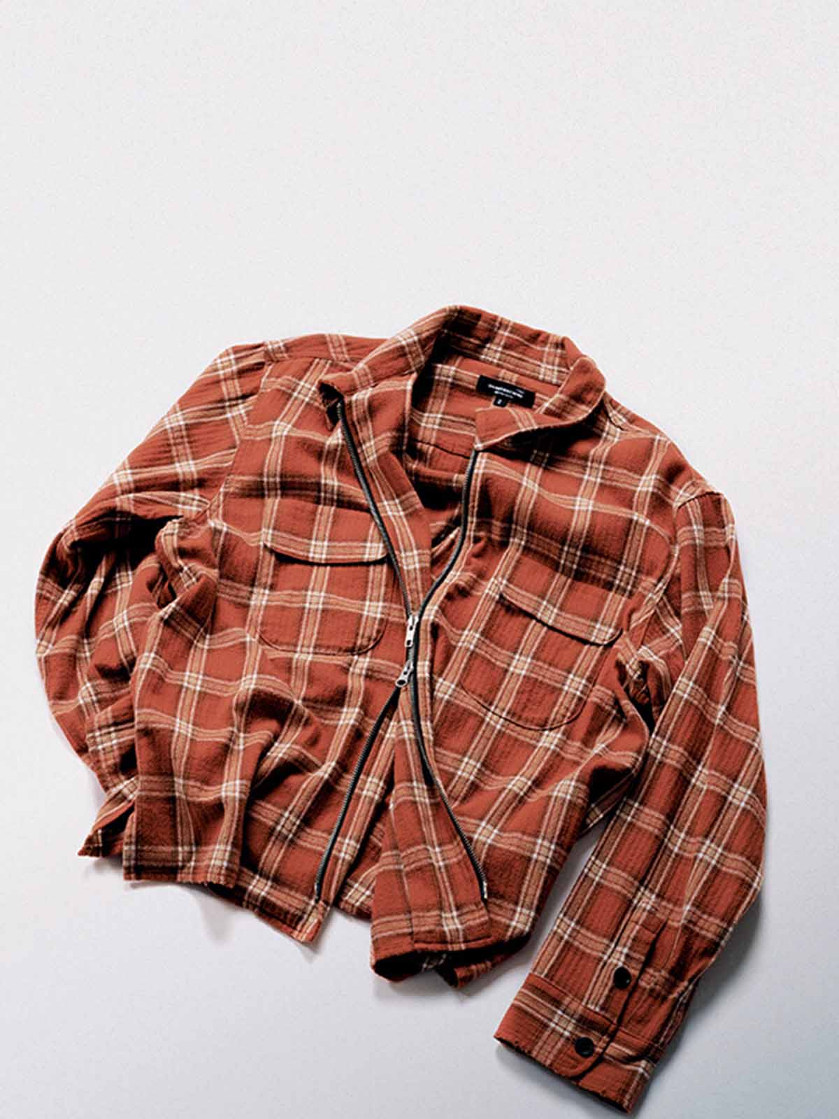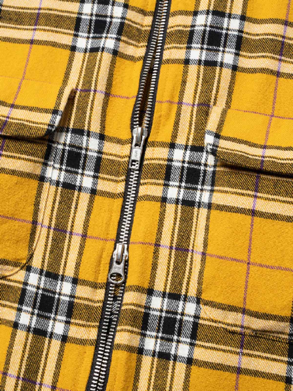 アメリカンヴィンテージにインスパイアされたデザインで、ジッパー付きフロントとダメージ加工ディテールが個性的なチェックシャツを実現しています。