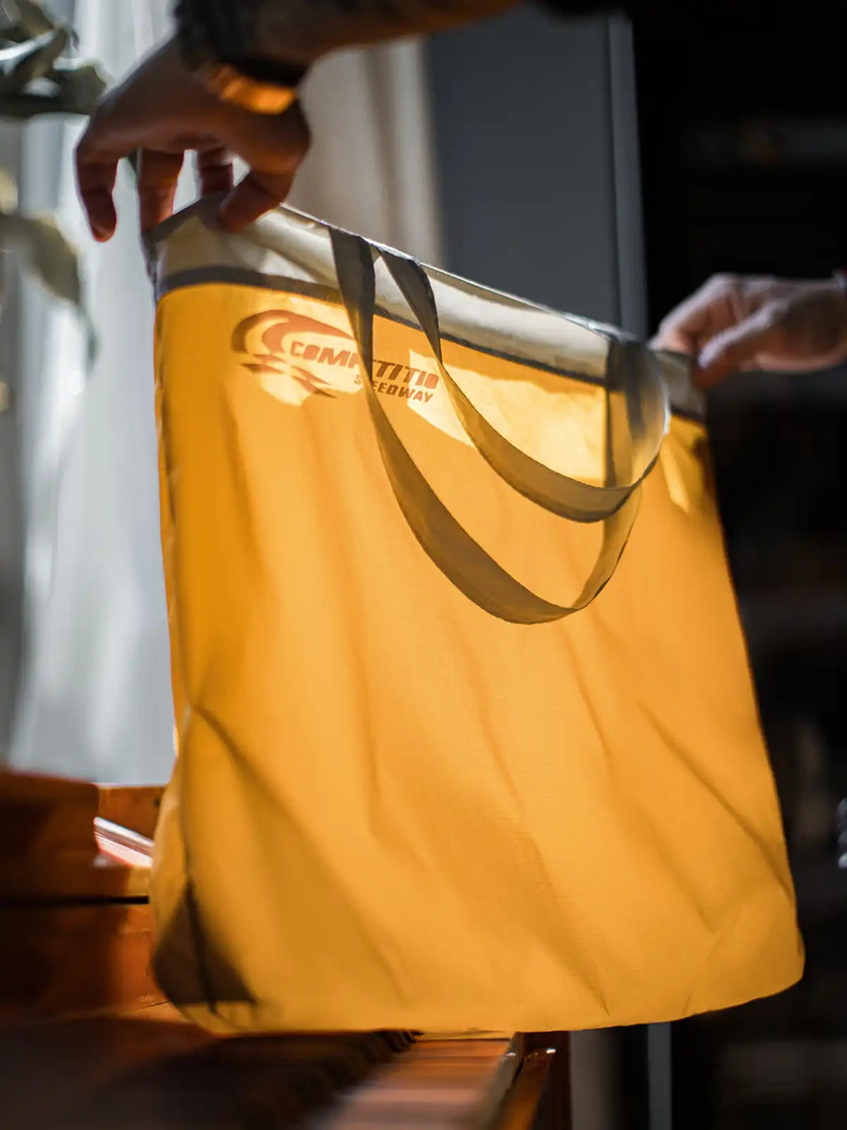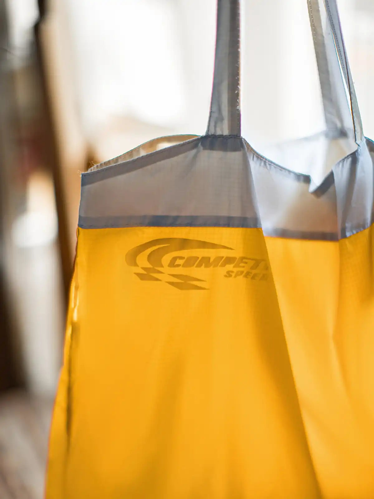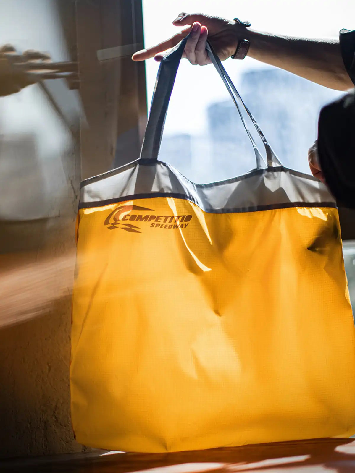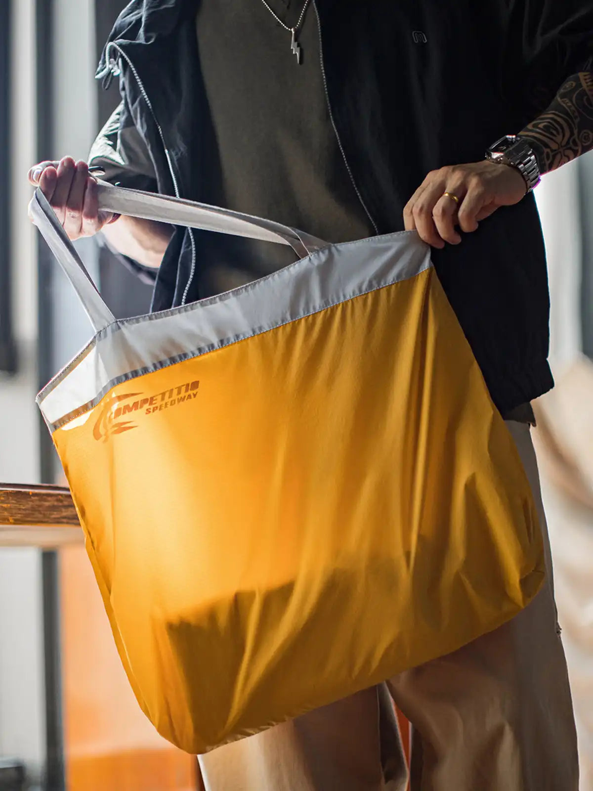 レーストラックの疾走感を纏う超軽量15L折りたたみトートバッグ。