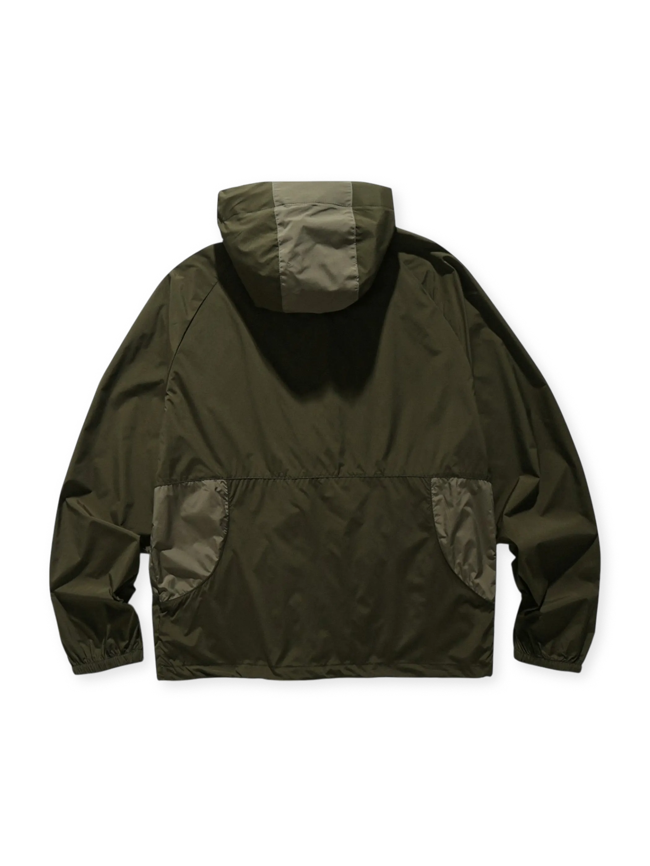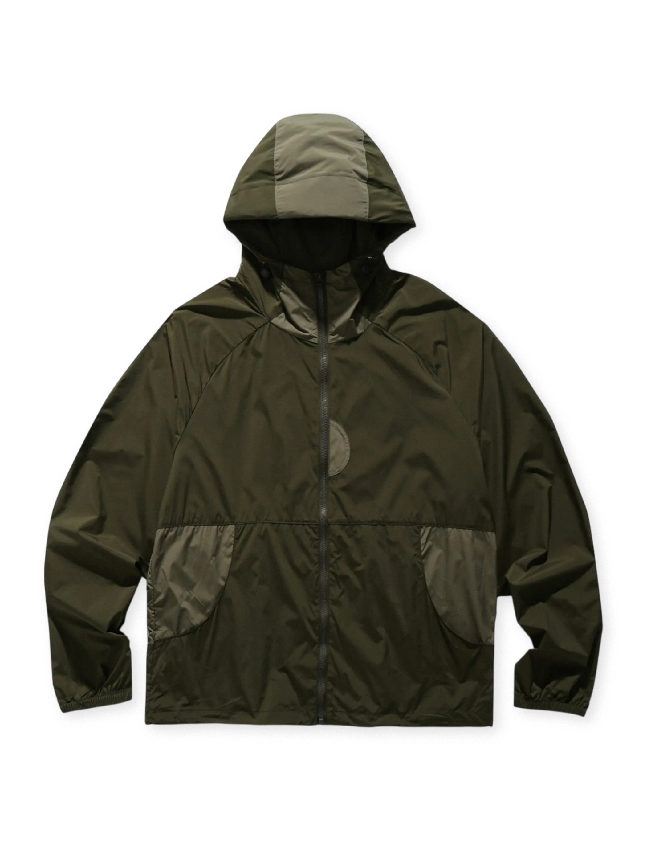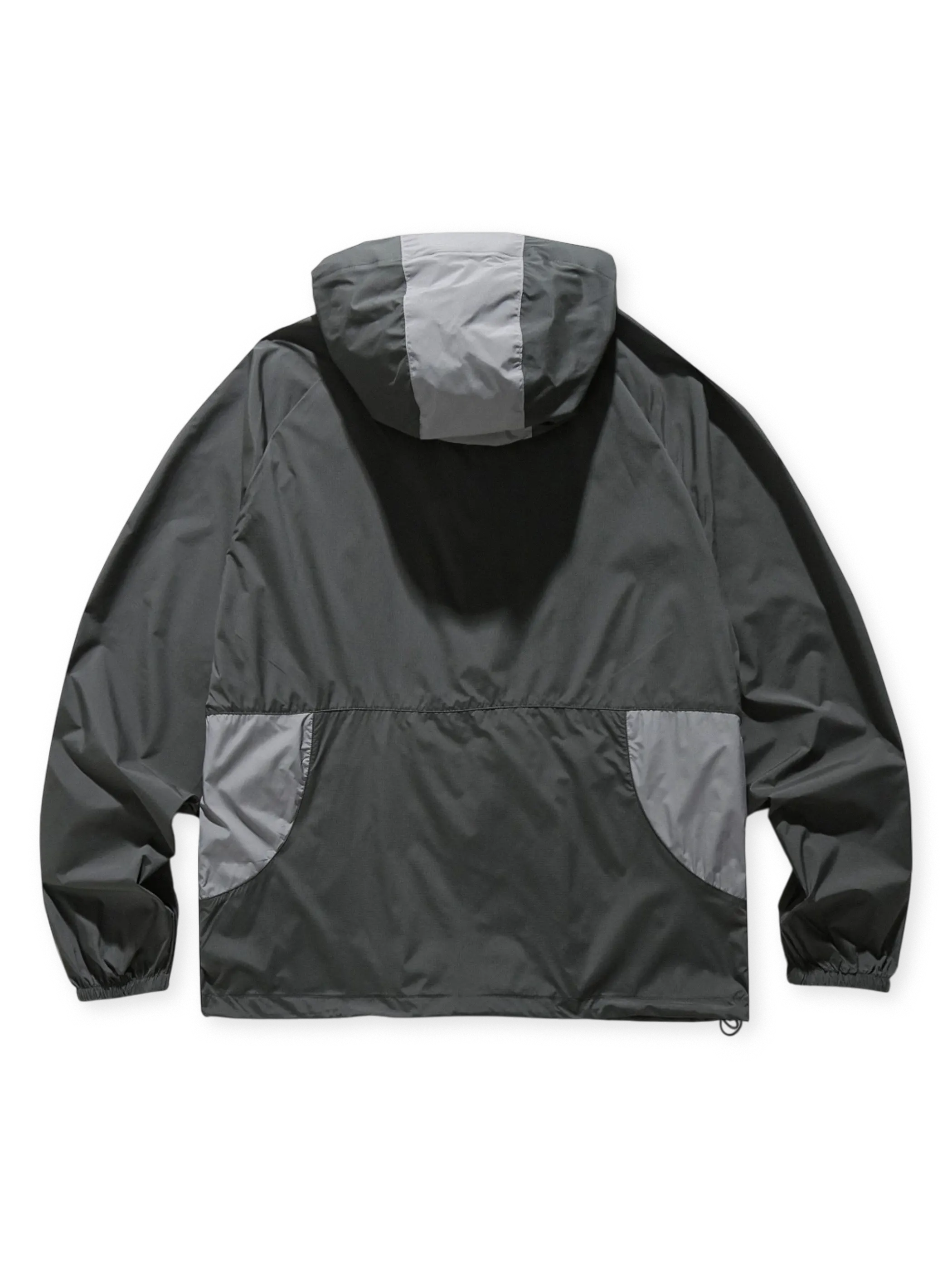 防滴機能と軽量性を兼ね備えた100%ポリエステル生地を使用し、カラーブロックの配色とドローコード付きフードでアウトドアとタウンユースの両方に対応する、一着です。