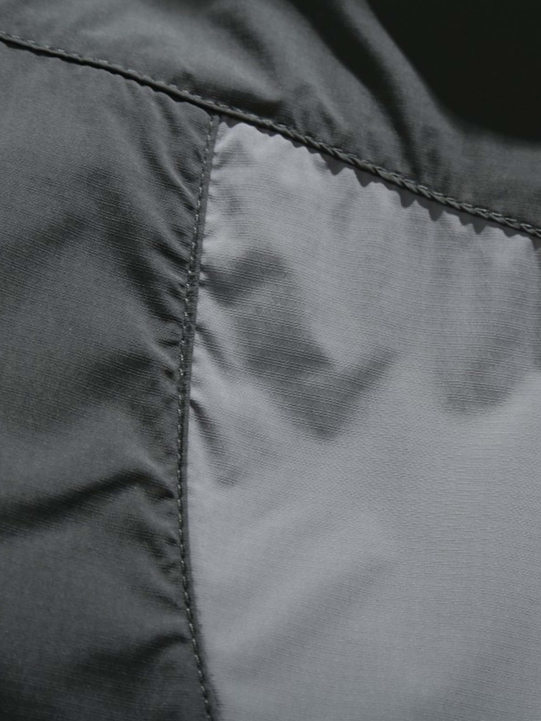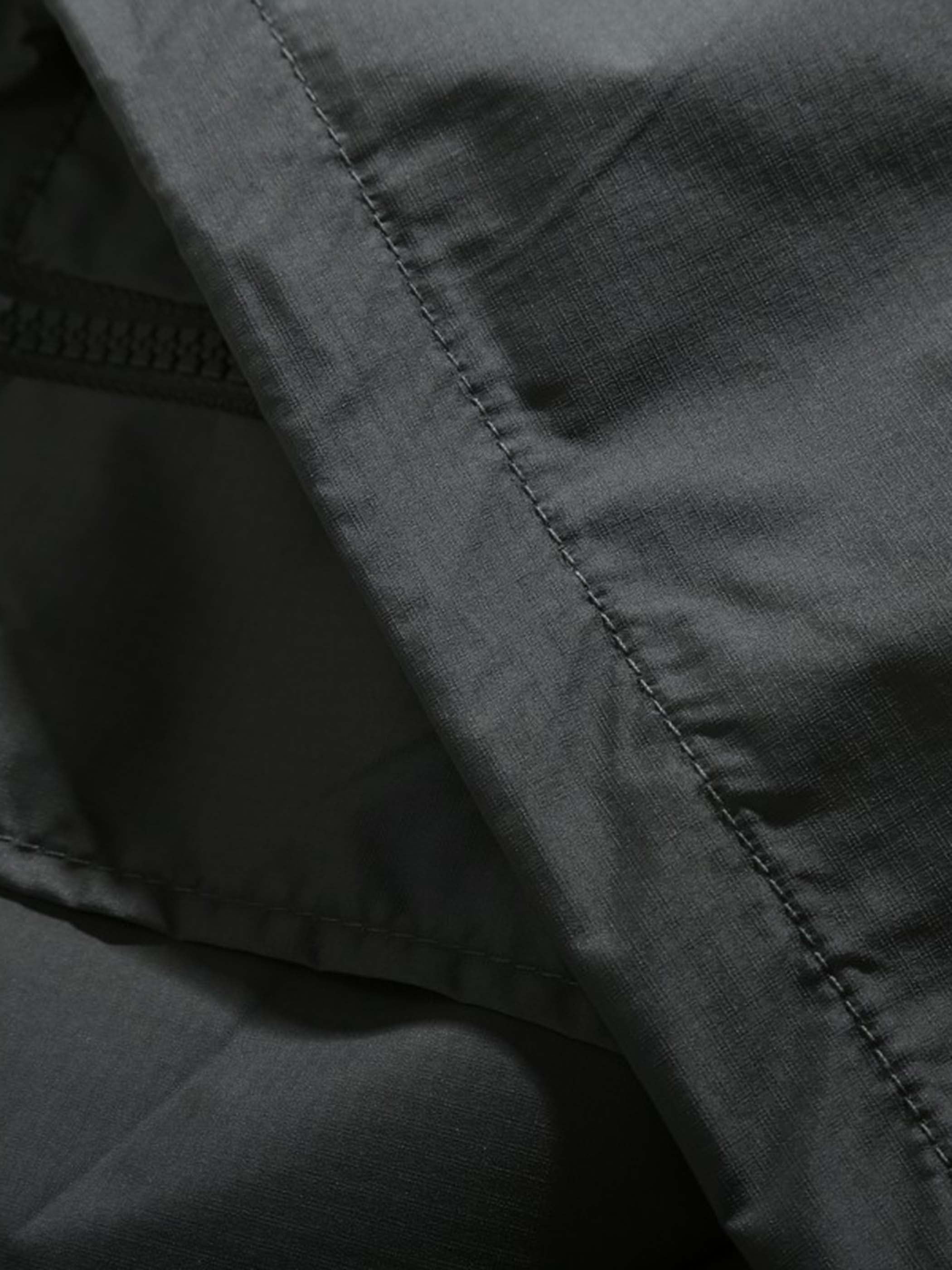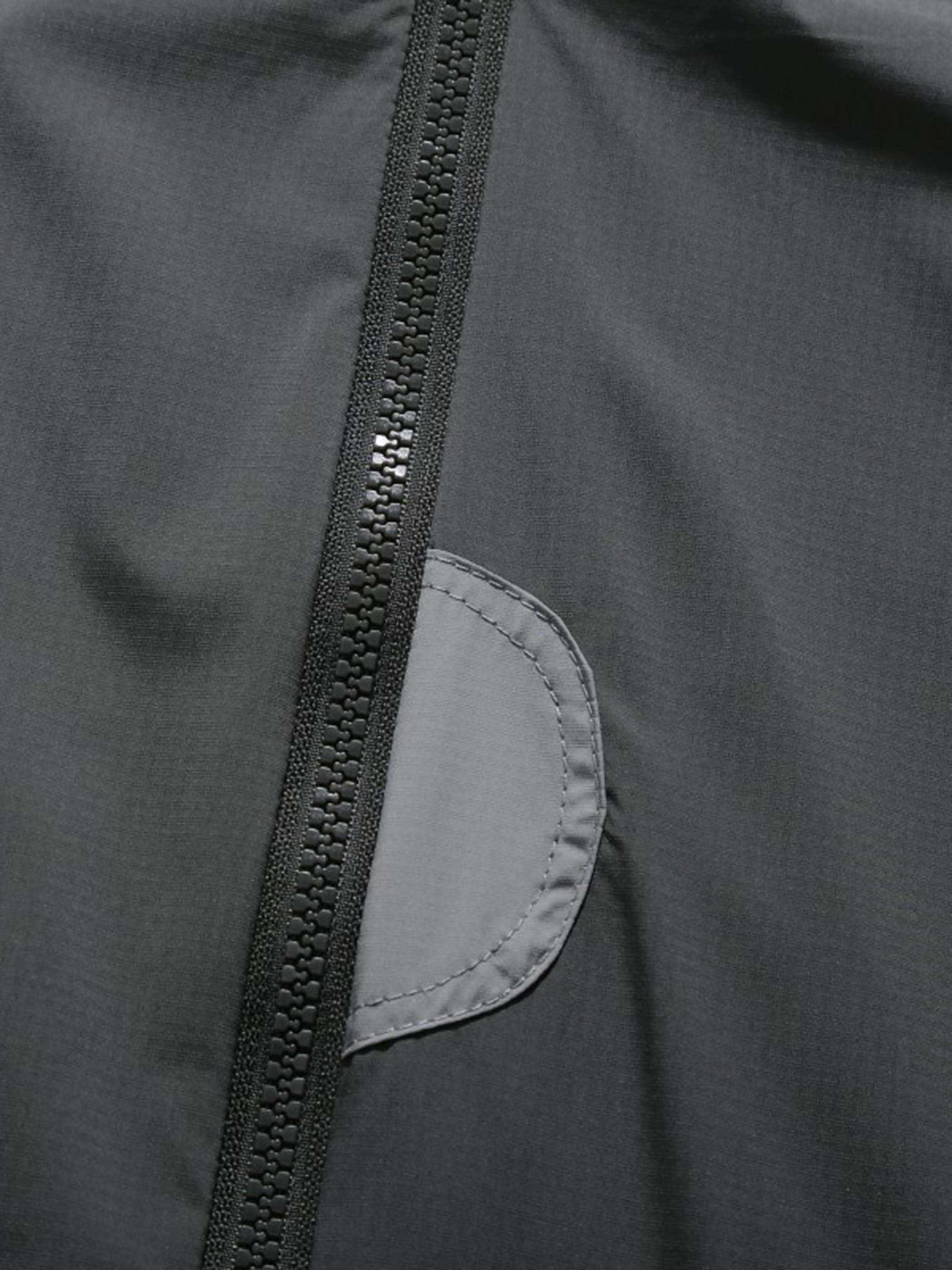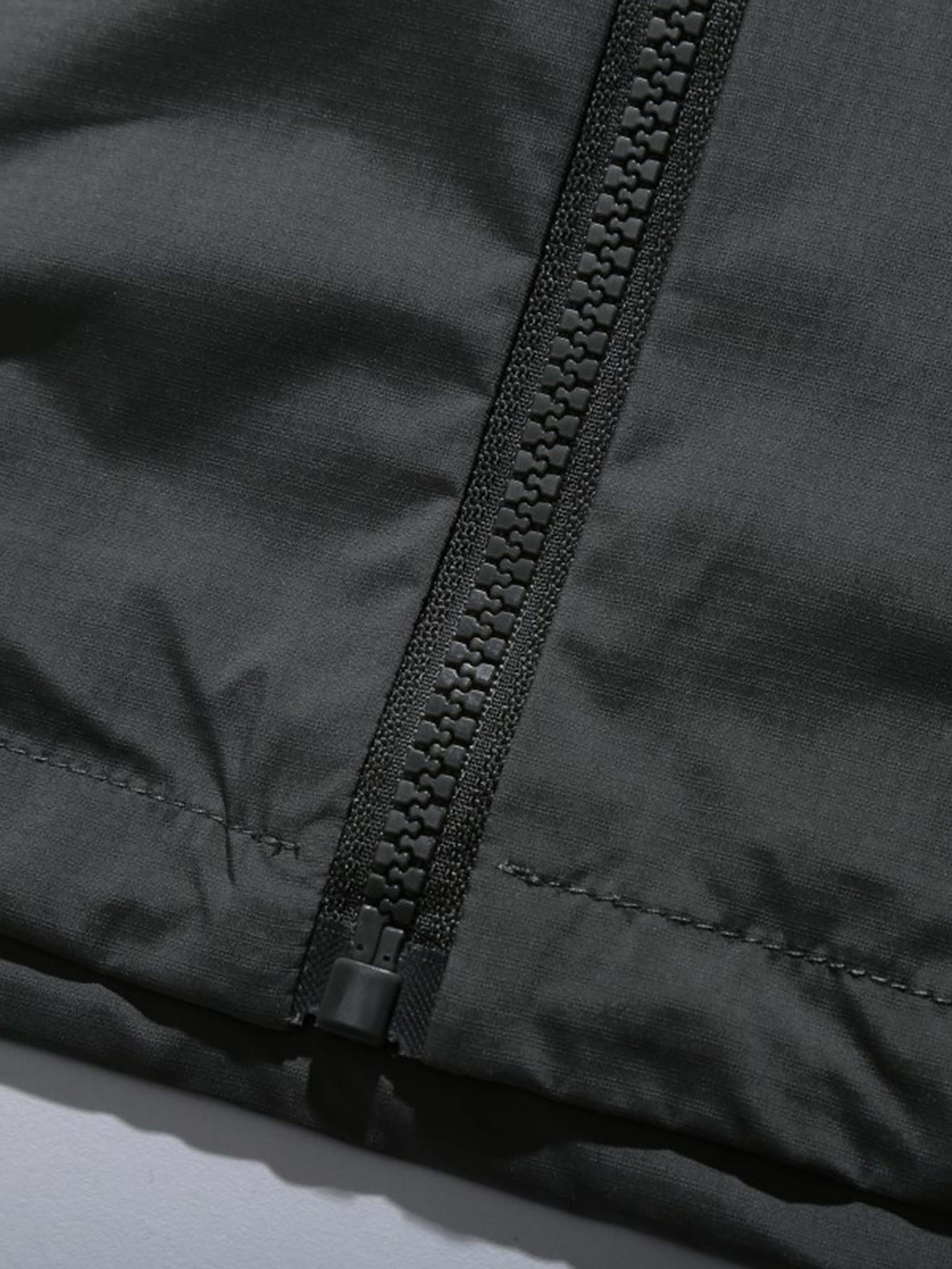 防滴機能と軽量性を兼ね備えた100%ポリエステル生地を使用し、カラーブロックの配色とドローコード付きフードでアウトドアとタウンユースの両方に対応する、一着です。