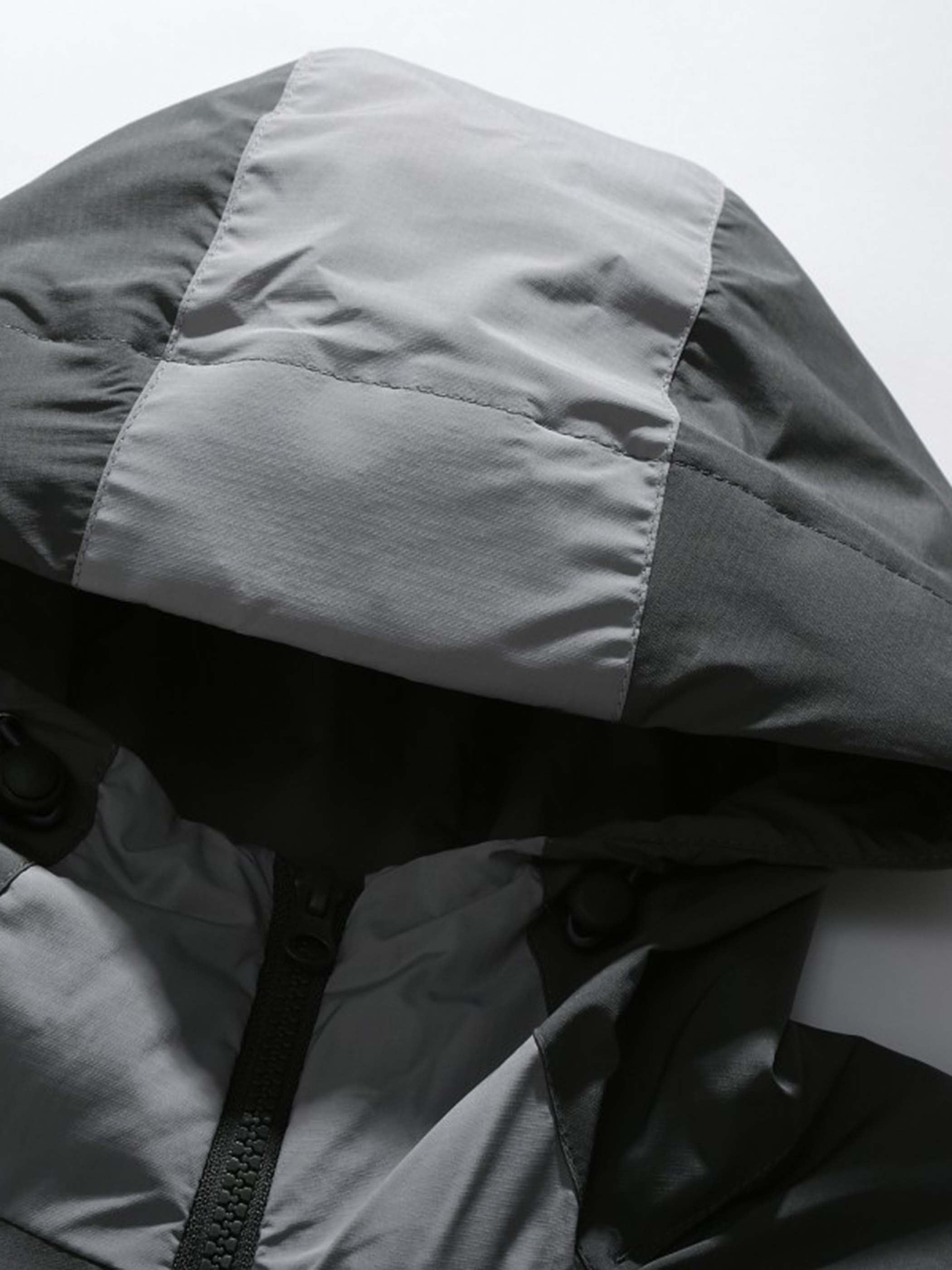 このフーデッドジャケットは、耐久性と防滴性に優れた100%ポリエステル素材を使用しており、雨や風の日でも安心して着用できます。カラーブロックのデザインがモダンな印象を与え、フードと裾に配置されたドローコードにより、シルエットを自由に調整可能。大容量ポケットが実用性を高め、スマートフォンや財布などの日常アイテムをしっかり収納できるため、キャンプやハイキングなどのアウトドアシーンはもちろん、タウンユースや通勤にも最適です。ルーズフィットで動きやすく、快適な着心地を提供する、機能性とスタイルを両立した逸品です。