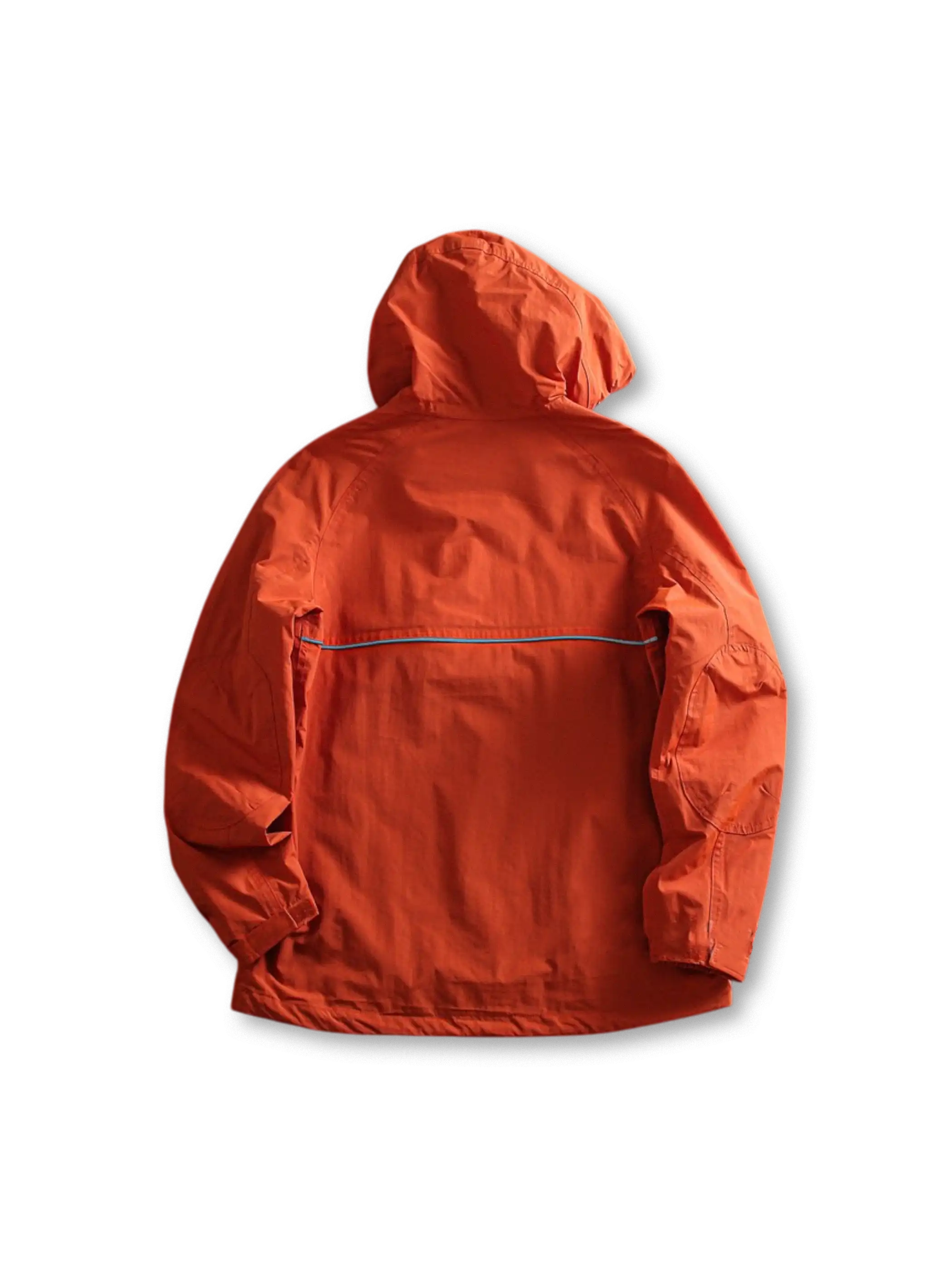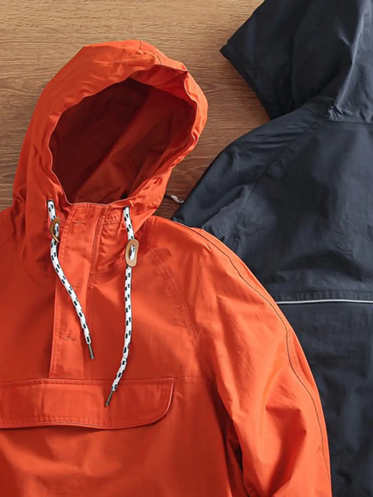 ハーフジップ仕様のフード付きプルオーバーデザインで、着脱がスムーズ。フロントにはカンガルーポケットを配置し、収納力とデザイン性を両立。防風・防水加工が施され、急な天候変化にも対応可能。袖口と裾はゴムやドローコードで調整でき、スポーティな見た目と機能性を同時に楽しめる。シンプルながら存在感のあるデザインで、アウトドアから普段使いまで幅広いシーンで着用可能。