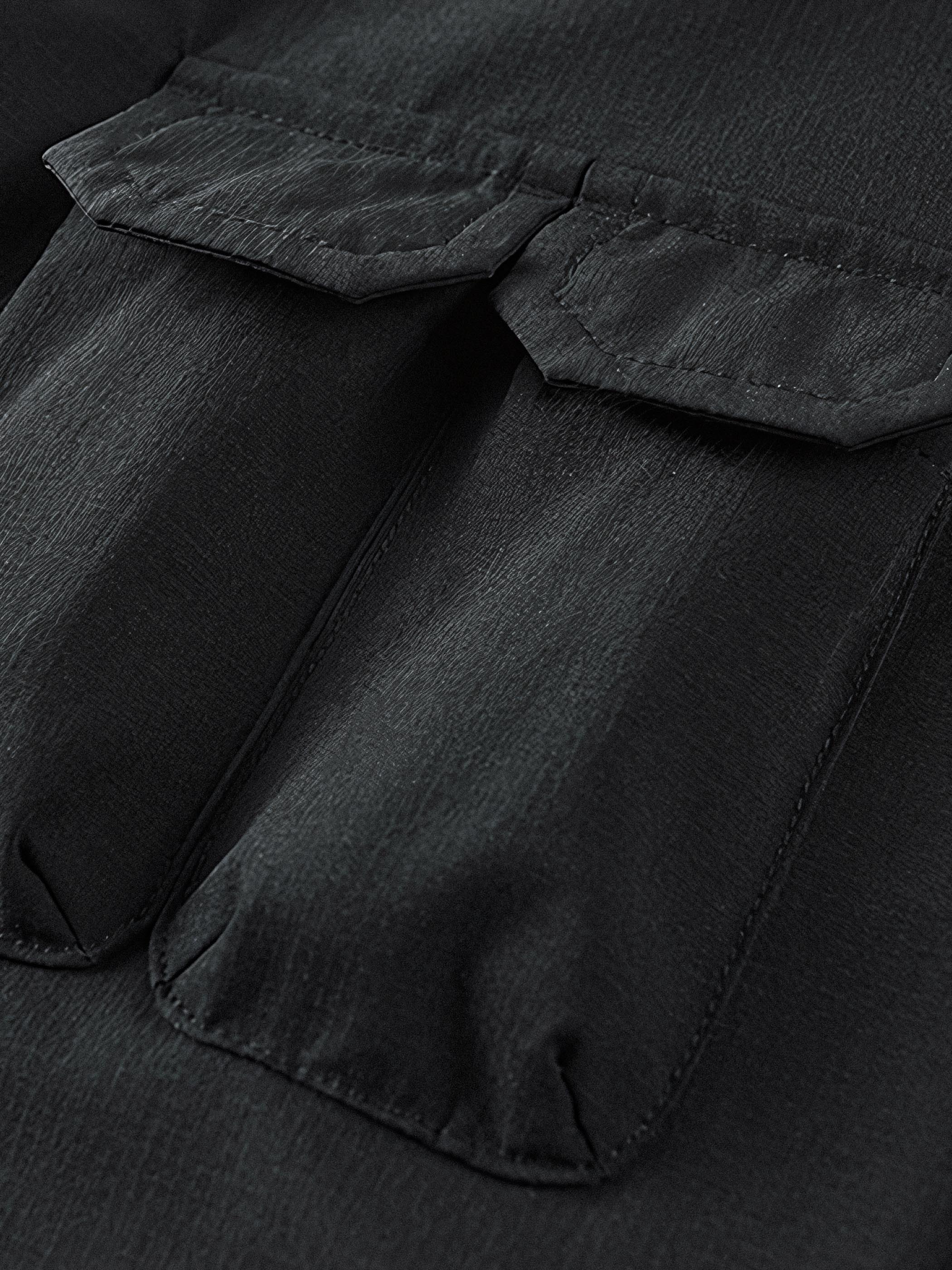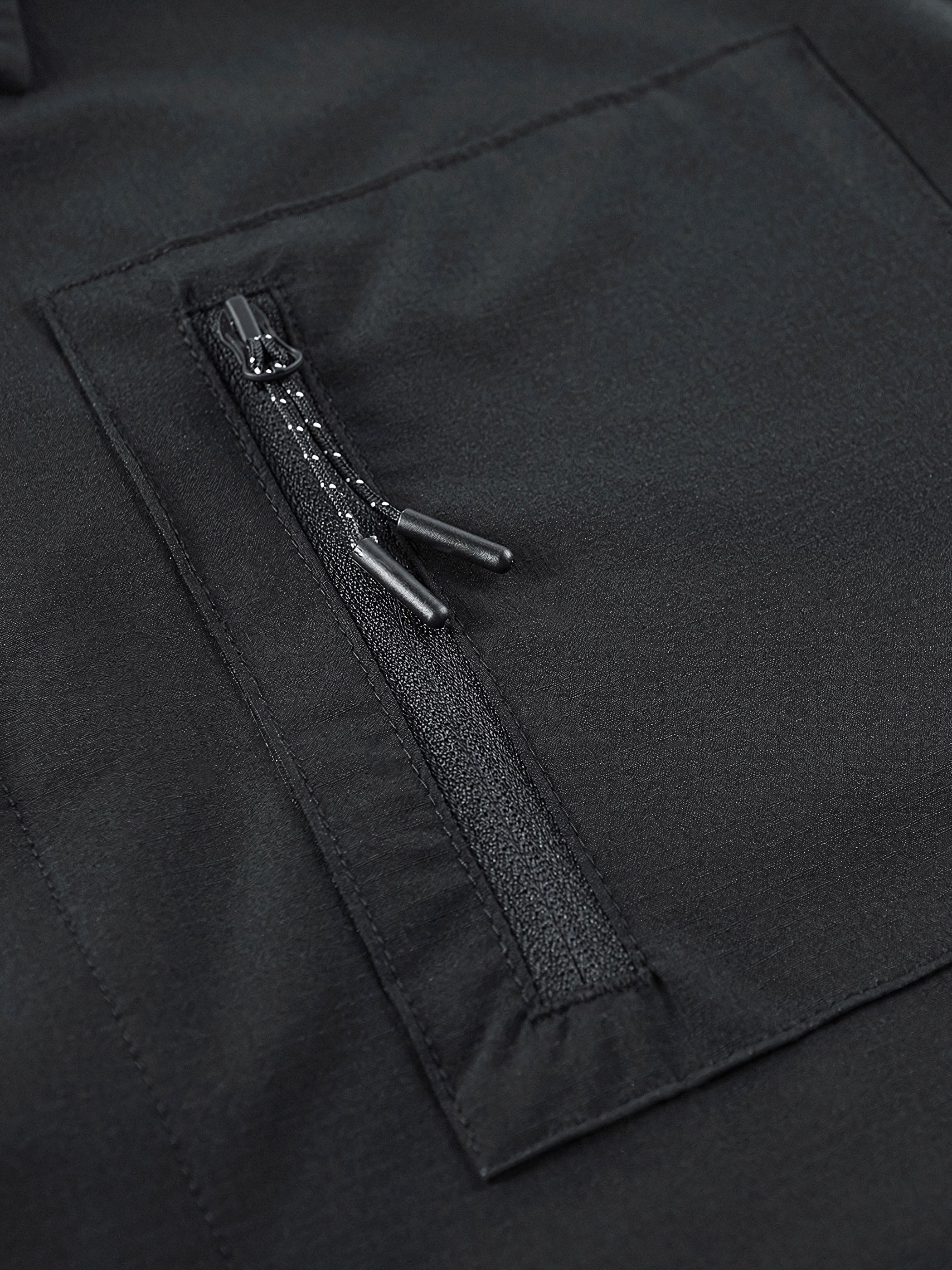 フロントには5つのポケットが特徴で、大容量のジップポケットも装備されており、小物を落とす心配はありません。遊び心と快適さを重視し、多様なスタイルを楽しめるピュアでモードなデザインシャツです。