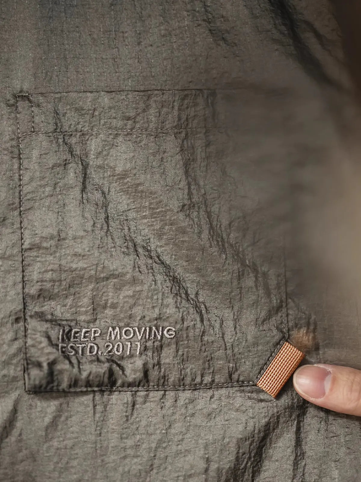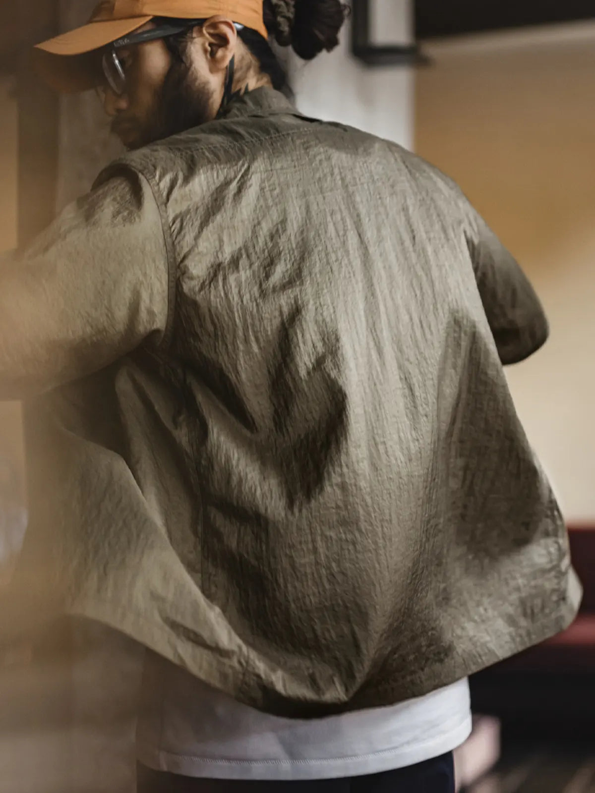 超軽量42g/m²のクランク加工ナイロンとヴィンテージグリーンが、都市とアウトドアを自在に行き来させる一着。
