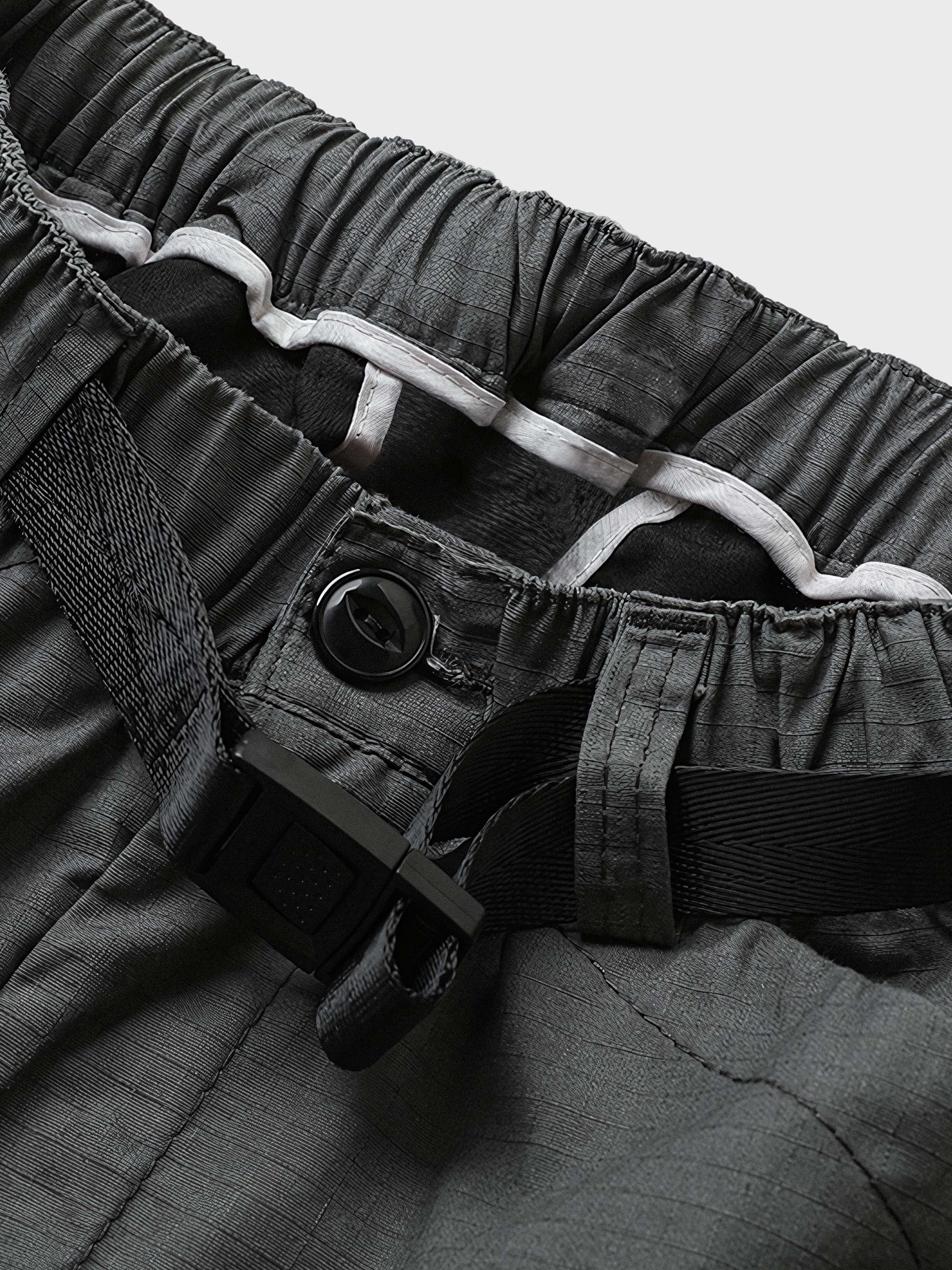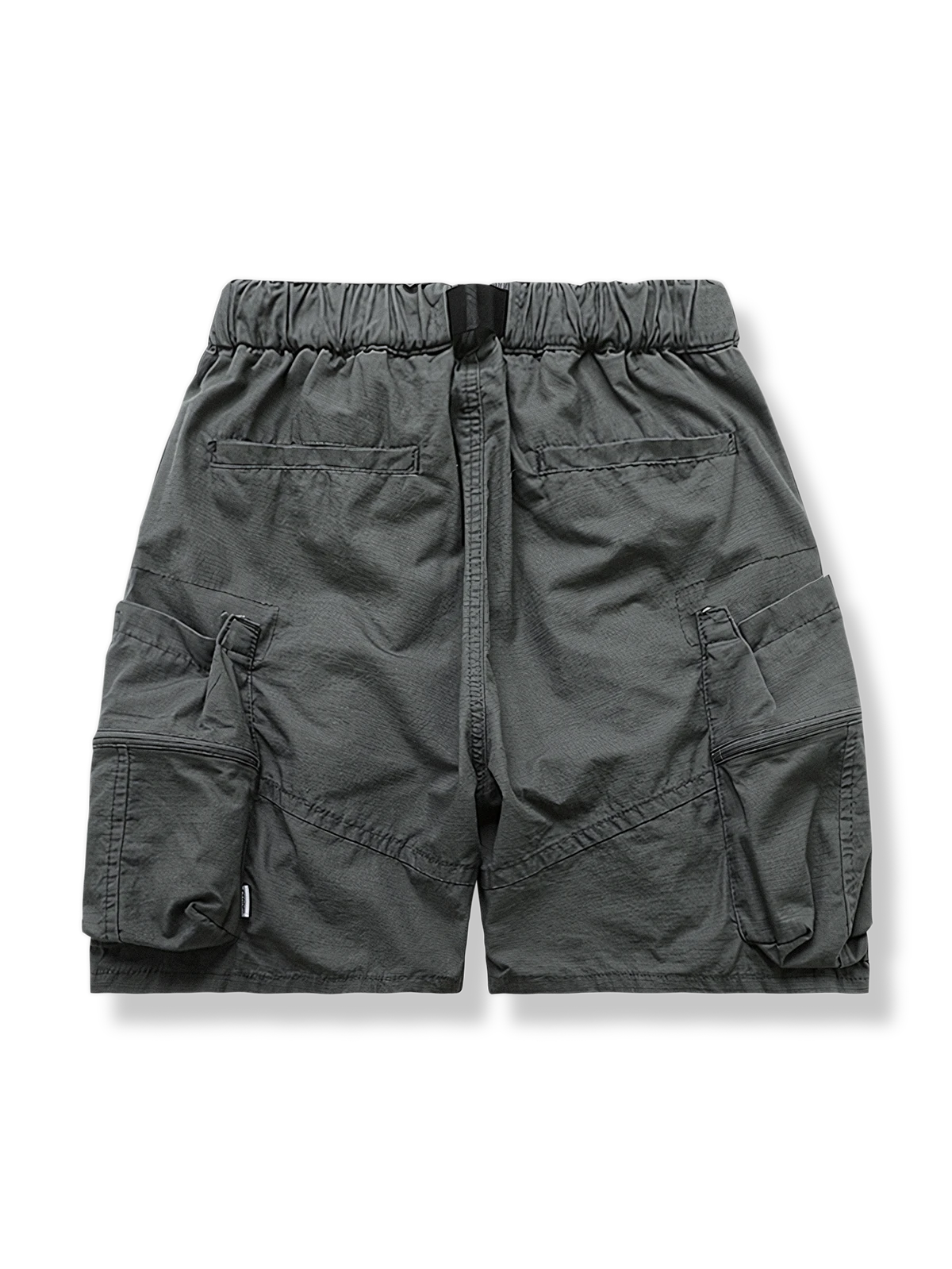 ゴム入りウエストベルトのデザインとバックルベルトが組み合わされ、機能性の高いスタイルを演出しています。ショーツにはさまざまなポケットが配置され、小物を便利に収納できます。
