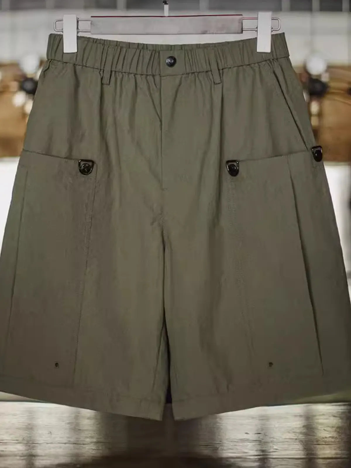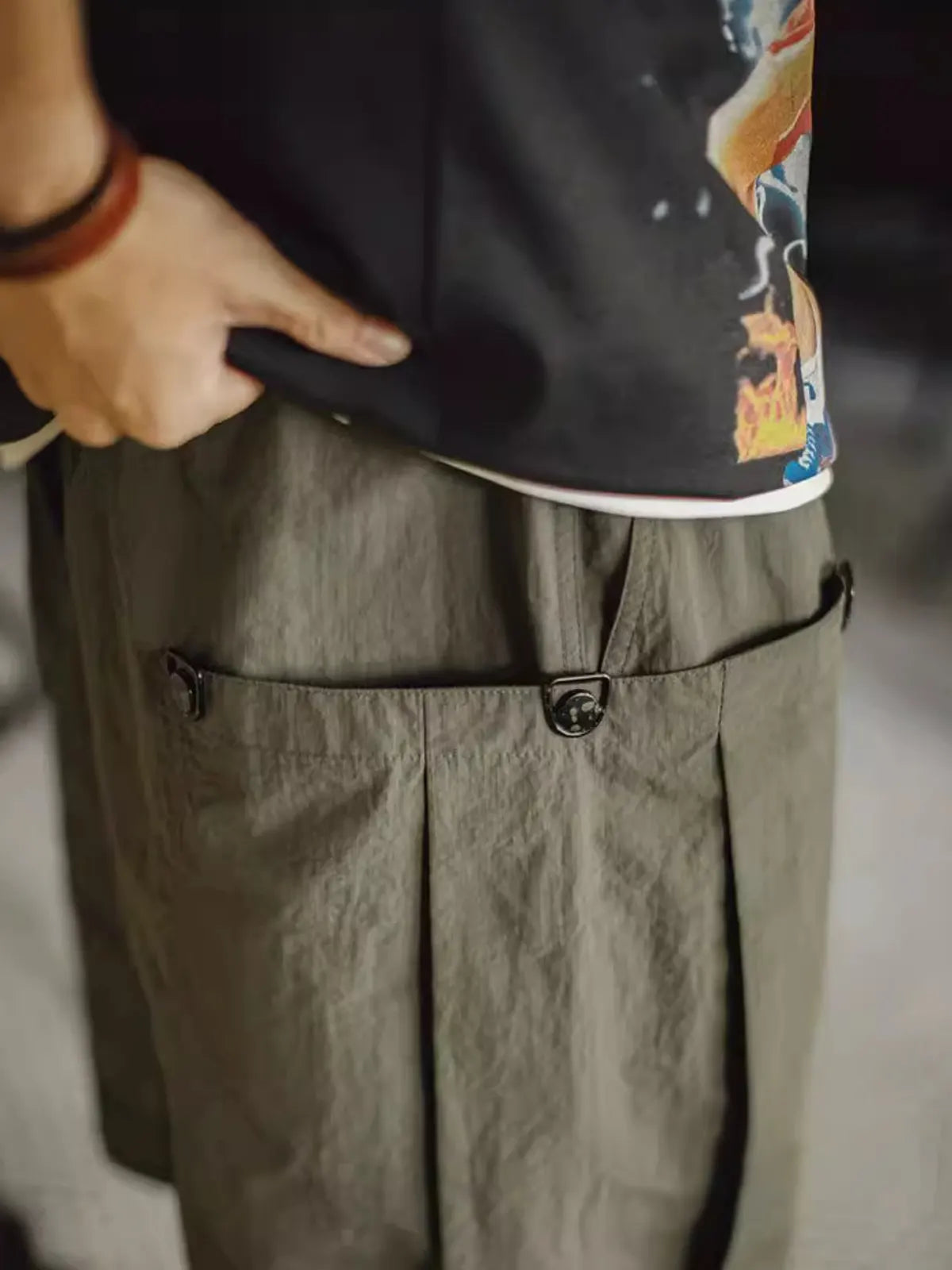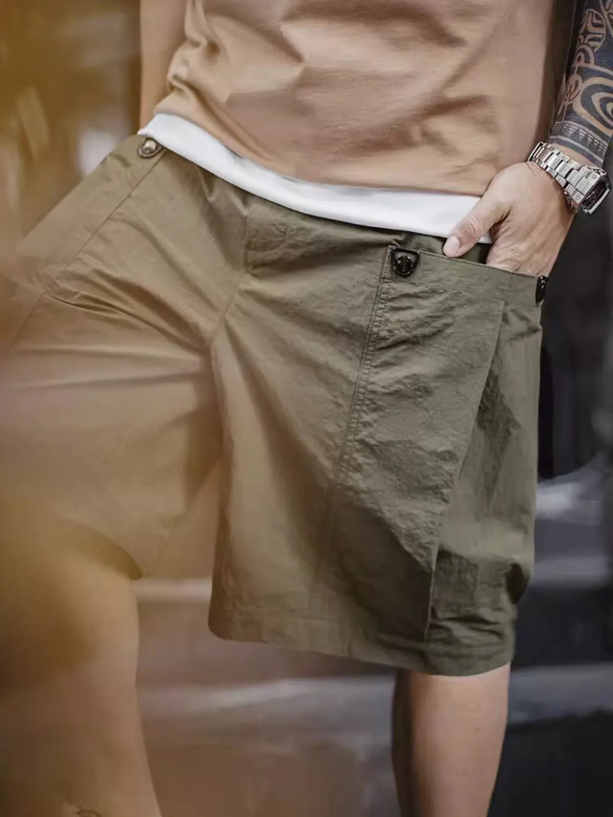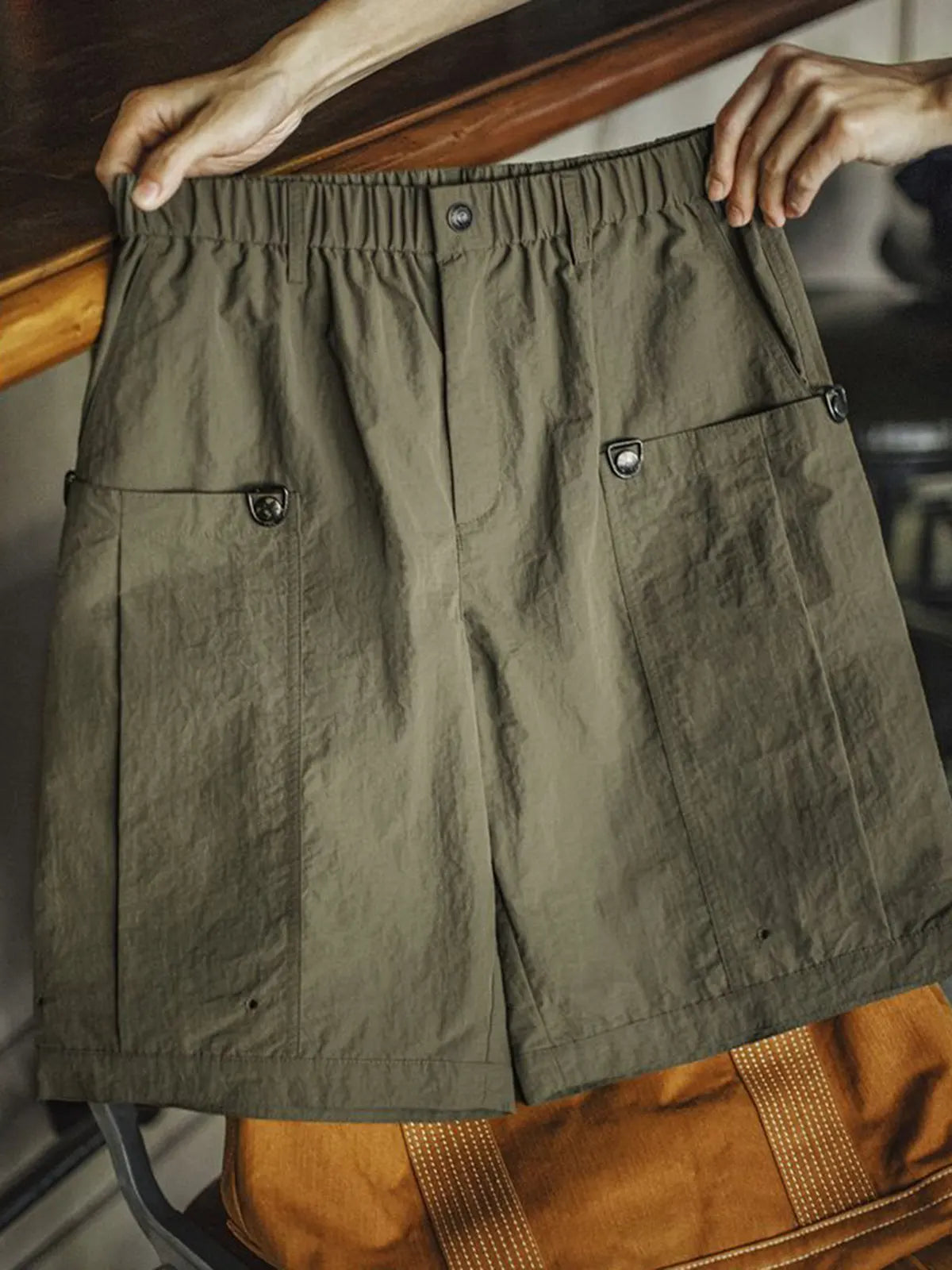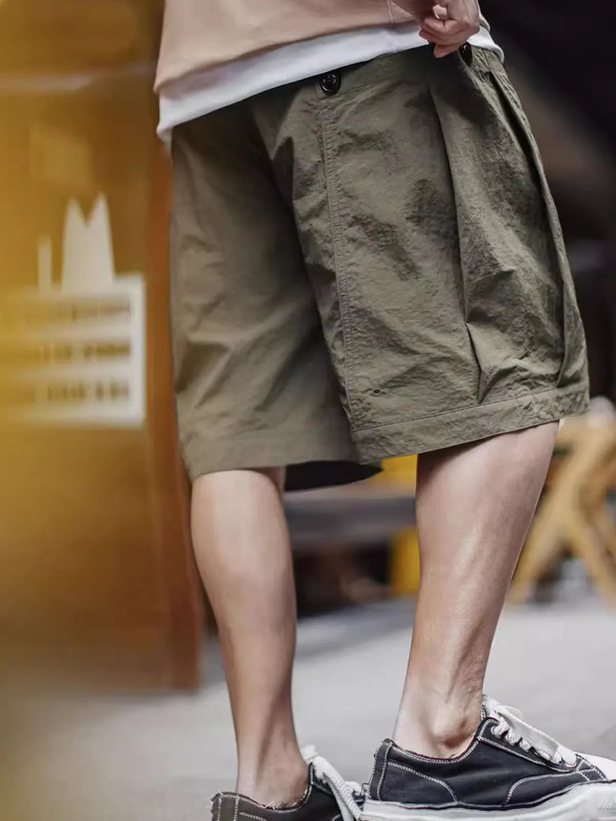 このショーツは19世紀のミリタリーカーゴパンツ由来の風琴ポケットを再現し、軽量タフタで夏の外出に最適な機能性を備えています。