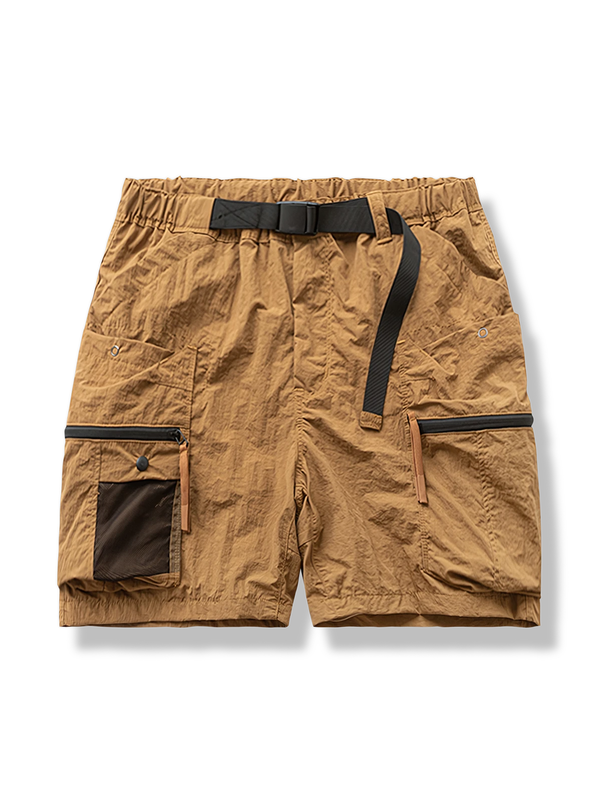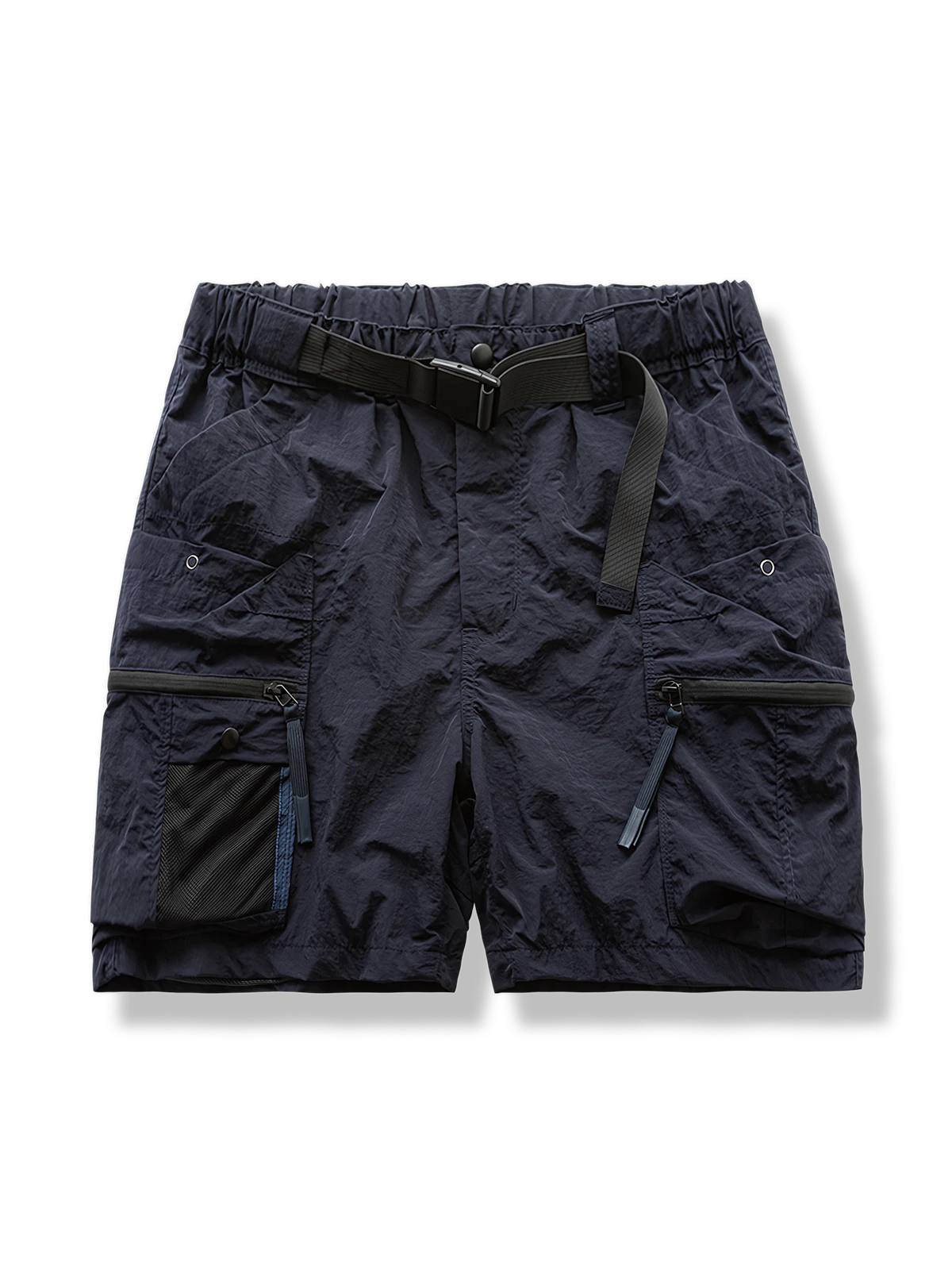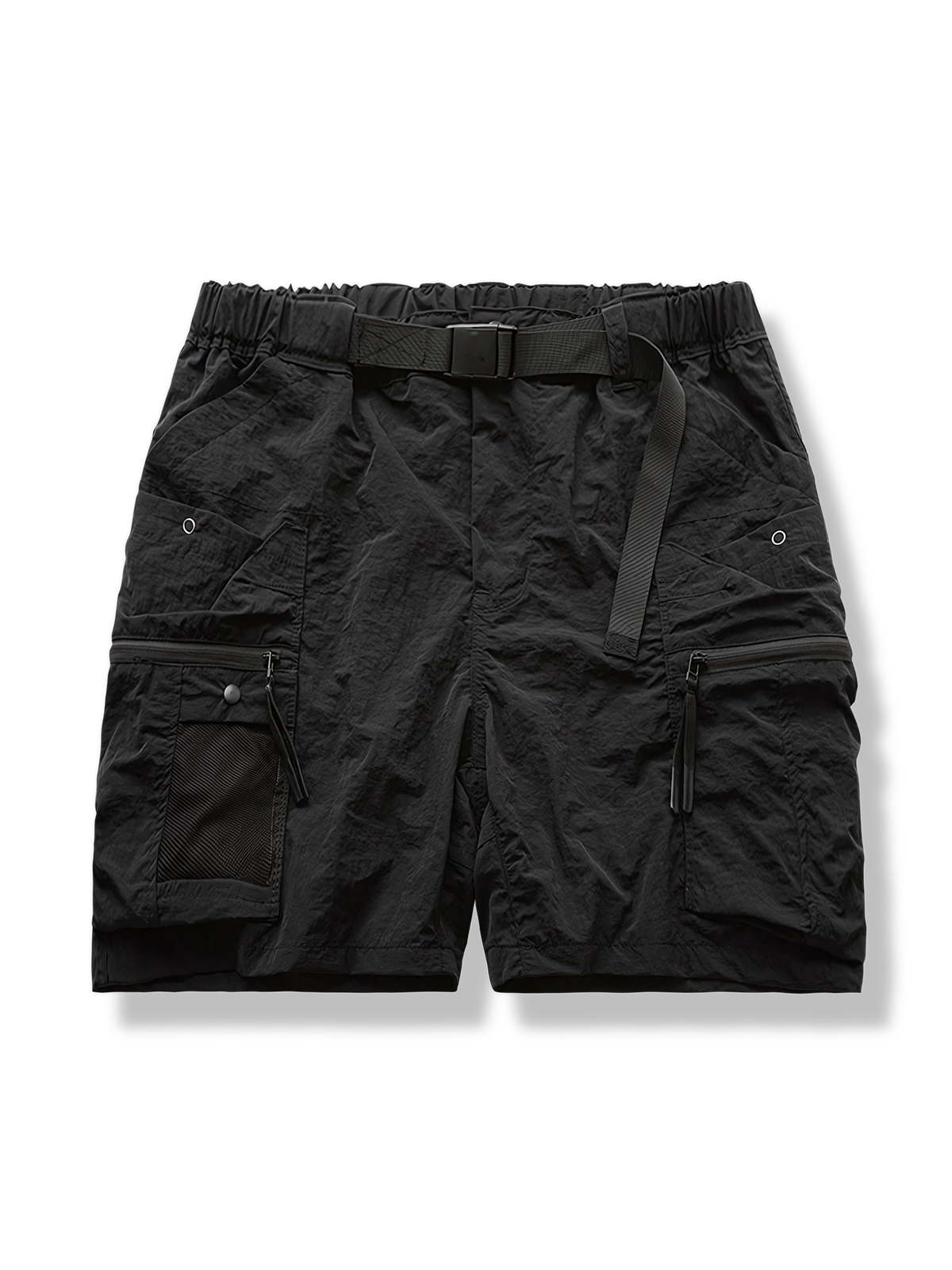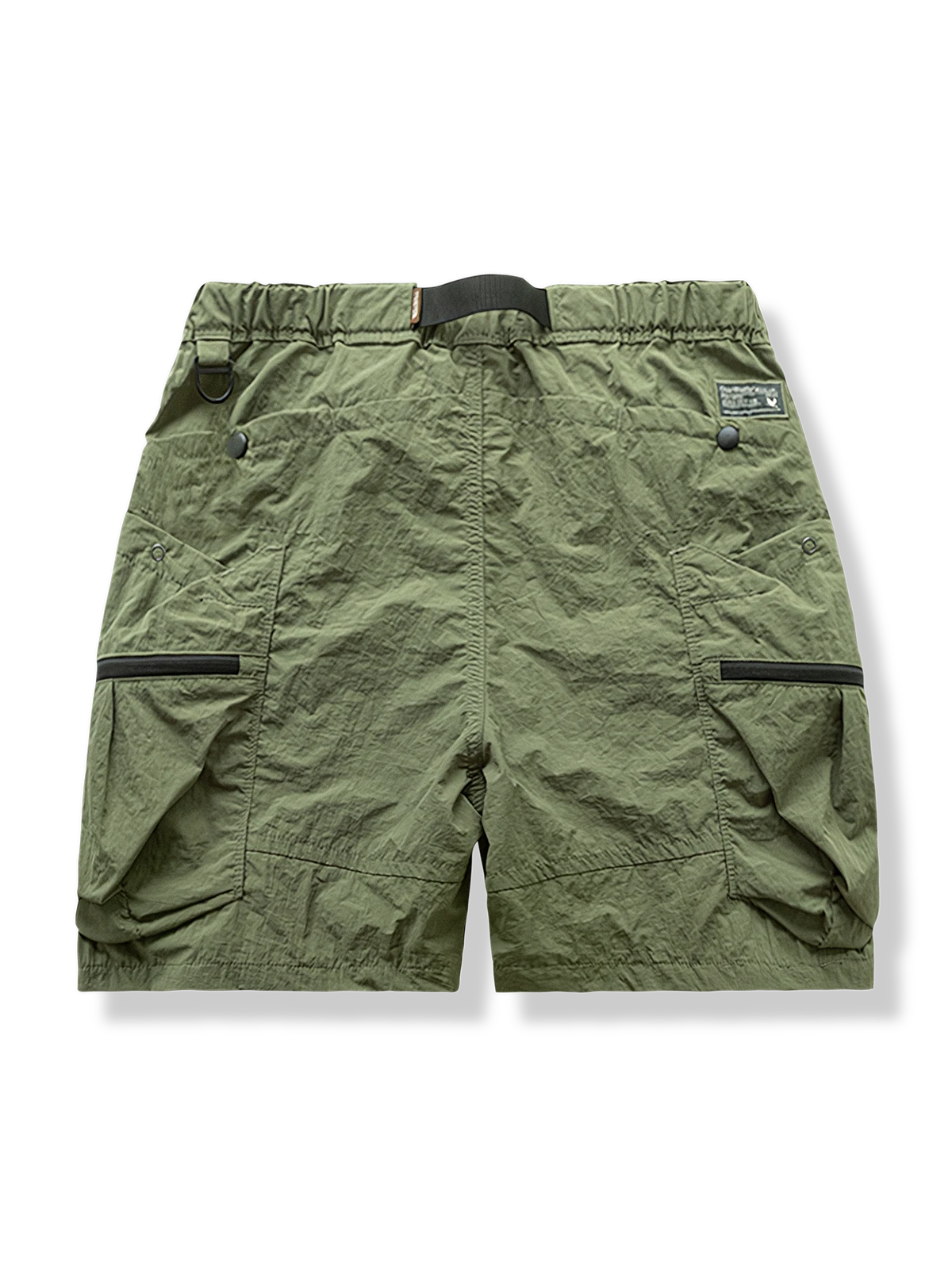 ゴム入りウエストベルトのデザインとバックルベルトが組み合わされ、機能性の高いスタイルを演出しています。ショーツにはさまざまなポケットが配置され、小物を便利に収納できます。