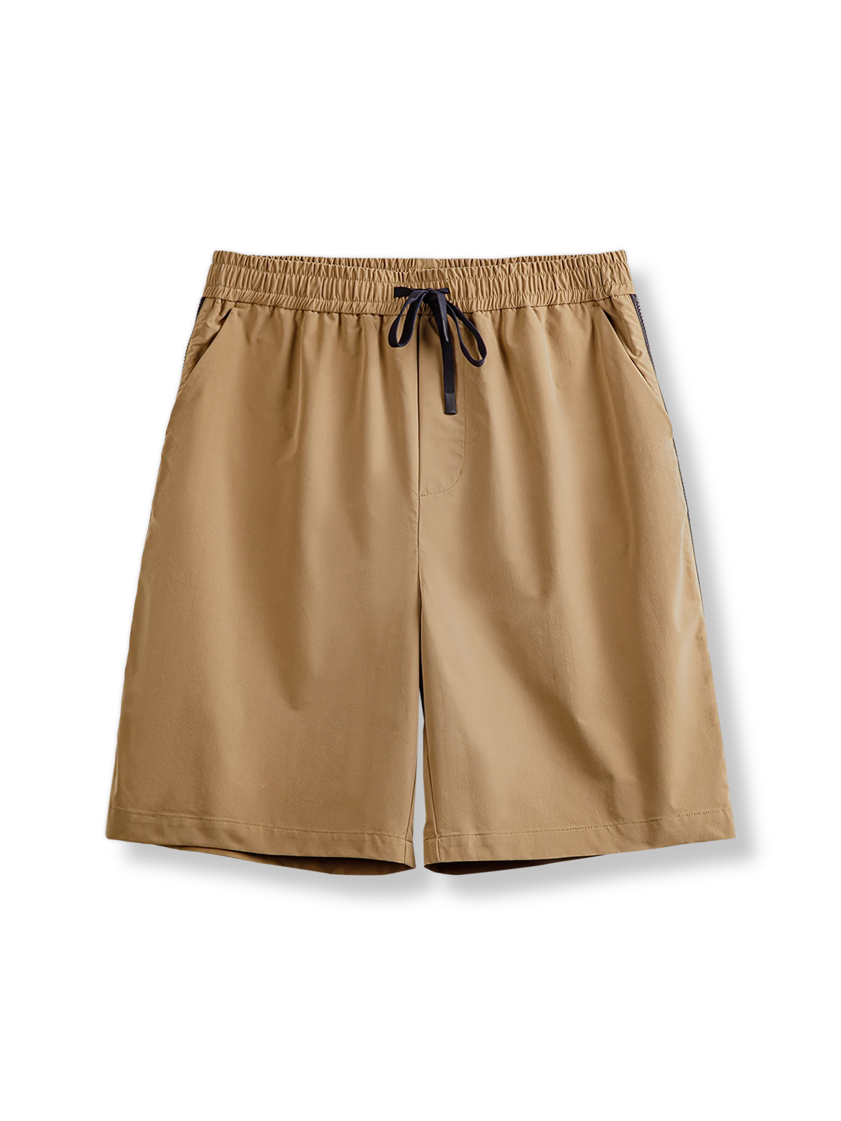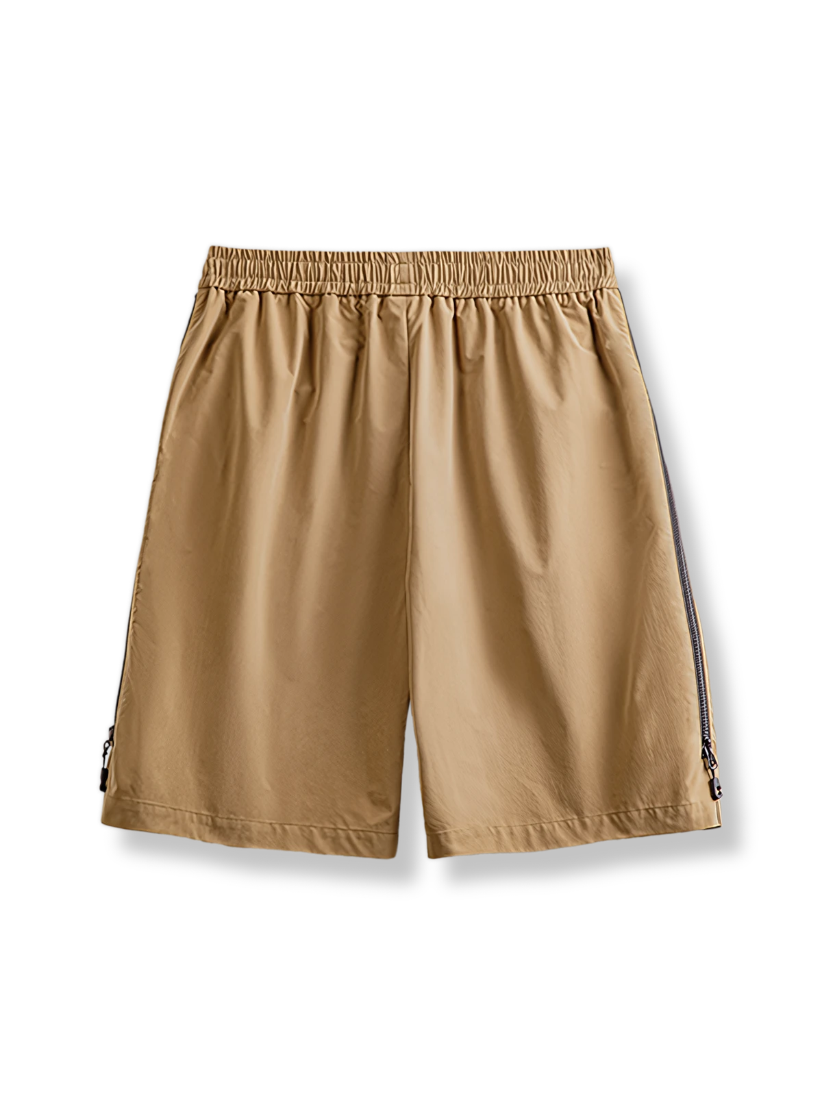 機能性とファッション性を融合させたこのショートパンツは、アウトドア用装備としての起源を持ち、カジュアルトレンドにも対応しています。カラーブロックのジップデザインは、ライトブラウンとダークカラージッパーの鮮やかなコントラストを生み出し、視覚的な層とダイナミズムを加えています。
