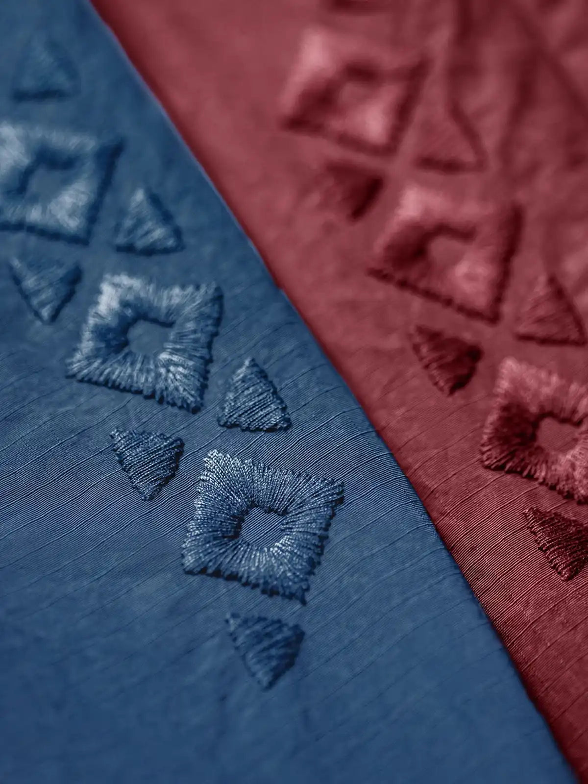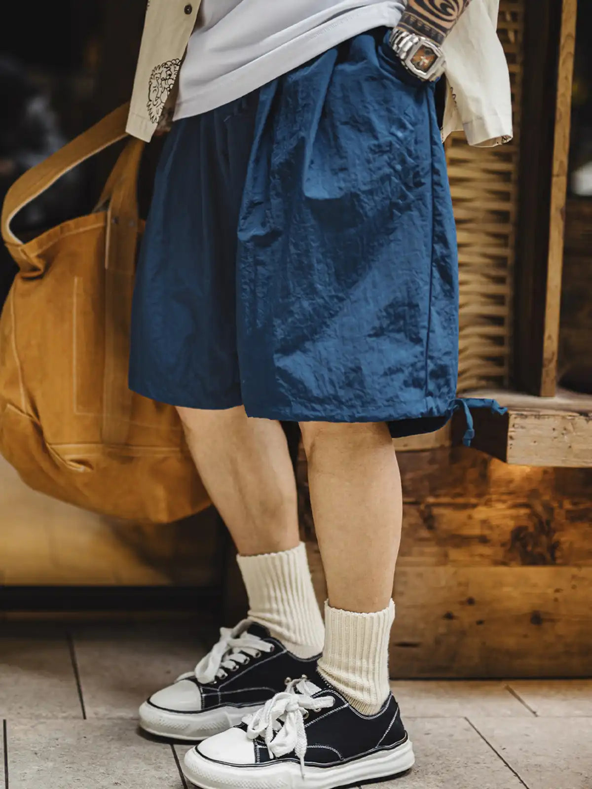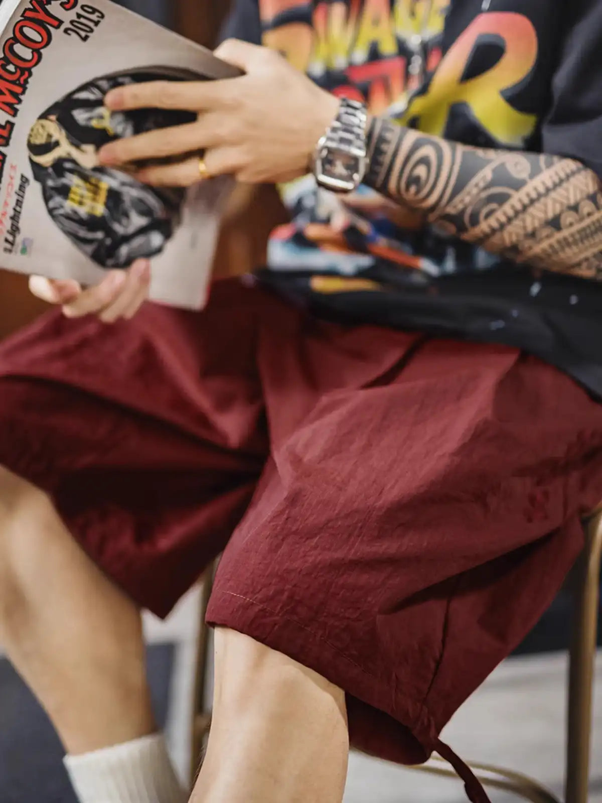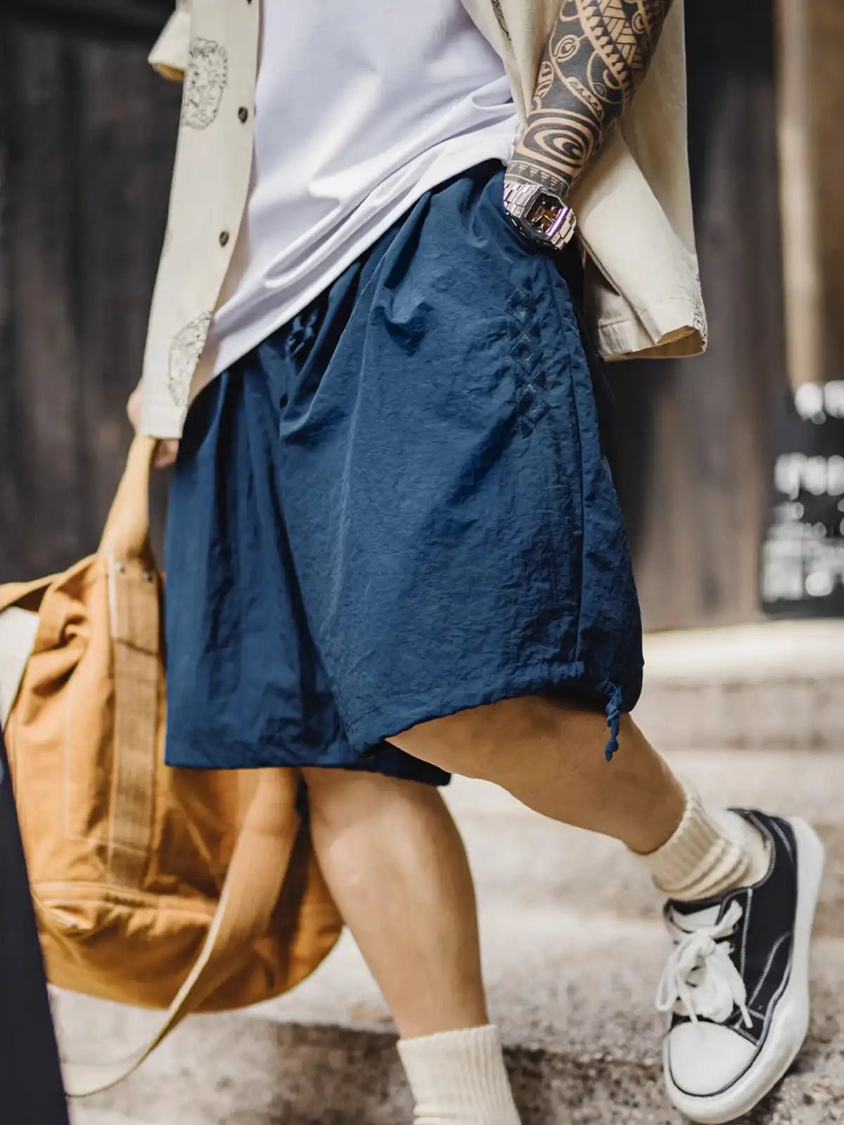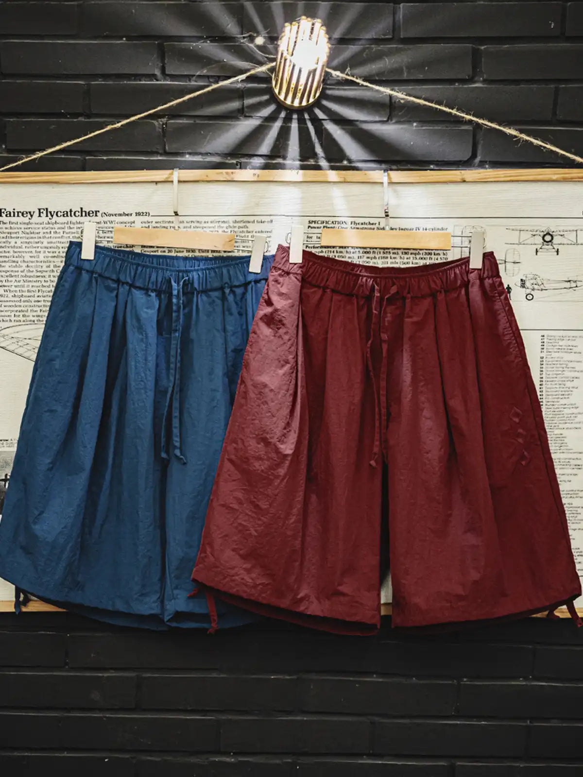 ナバホ文化の深海ブルーと夕焼けレッドを幾何学パターンで再構成した4500針の精緻な刺繍が立体的に浮かび上がり、日常とリゾートをシームレスに繋ぐ。130g/m²の超軽量ナイロン素材は通気性とドライタッチを両立し、ウエストはドローストリングでワンタッチ調節、裾のドローコードでシルエットを自在に変化させる二面性を備えています。ヴィンテージライクな微細なシワ感がナチュラルな風合いを引き立て、シンプルなカットソーとの組み合わせで夏のスタイルにリッチなアクセントを添えます。
