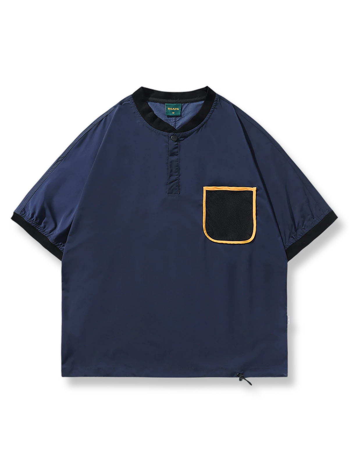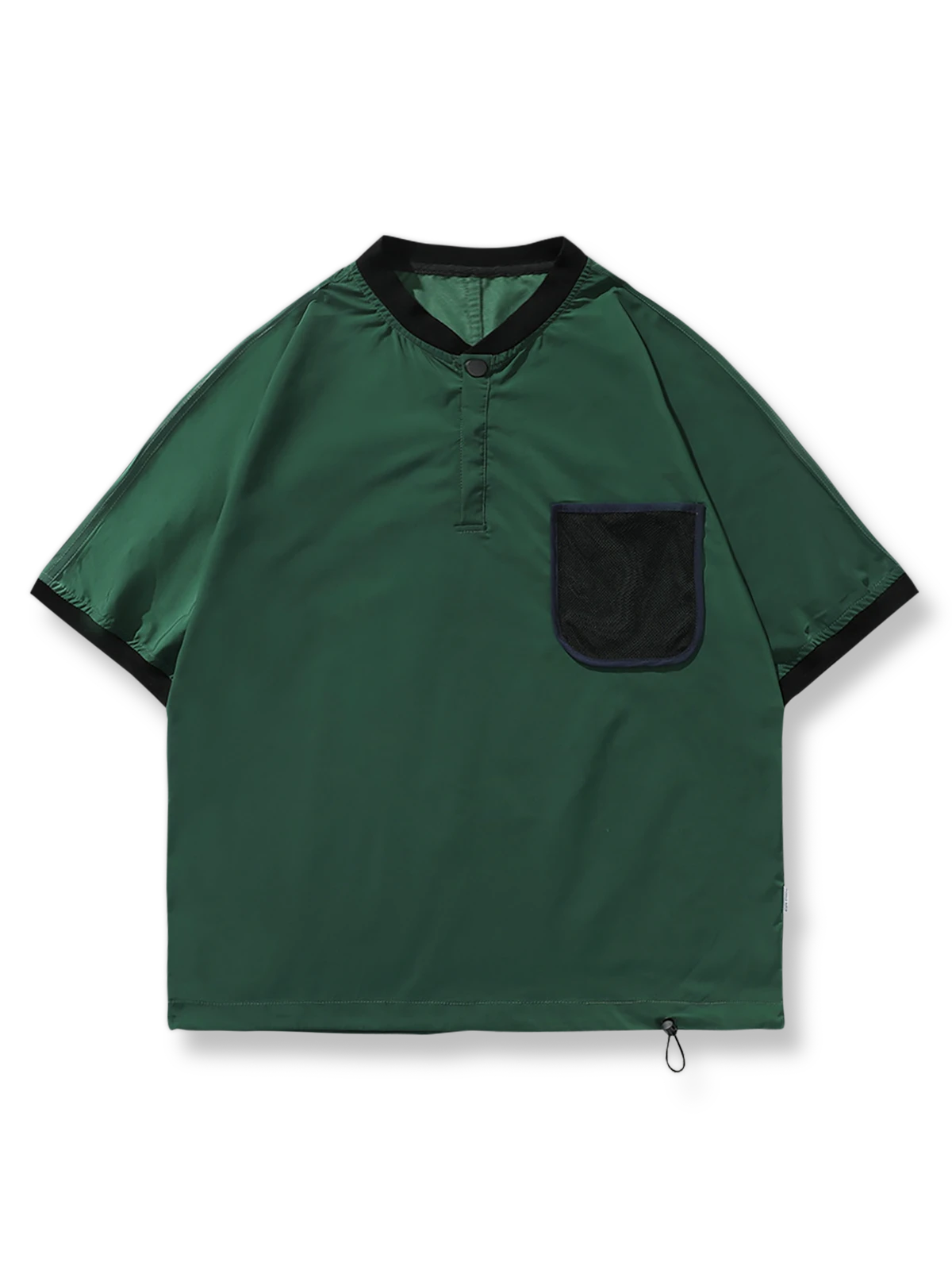 このTシャツはアウトドア活動の実用性とカジュアルスポーツウェアのデザインを融合し、野球襟、目立つポケット、ドローストリングのディテールを通じて活動的で機能的な服装スタイルを提供します。これらの要素は、スポーティな外観を強調し、現代のアクティブウェアとしての機能性を兼ね備えています。