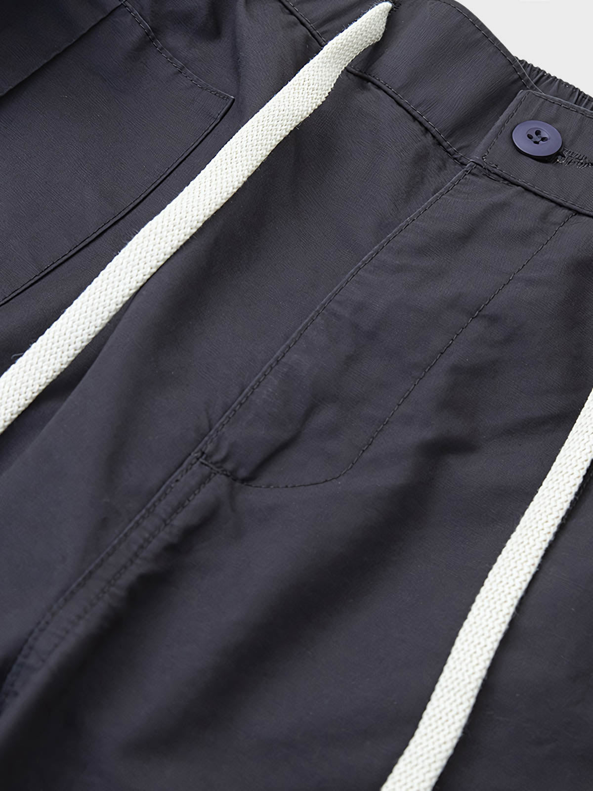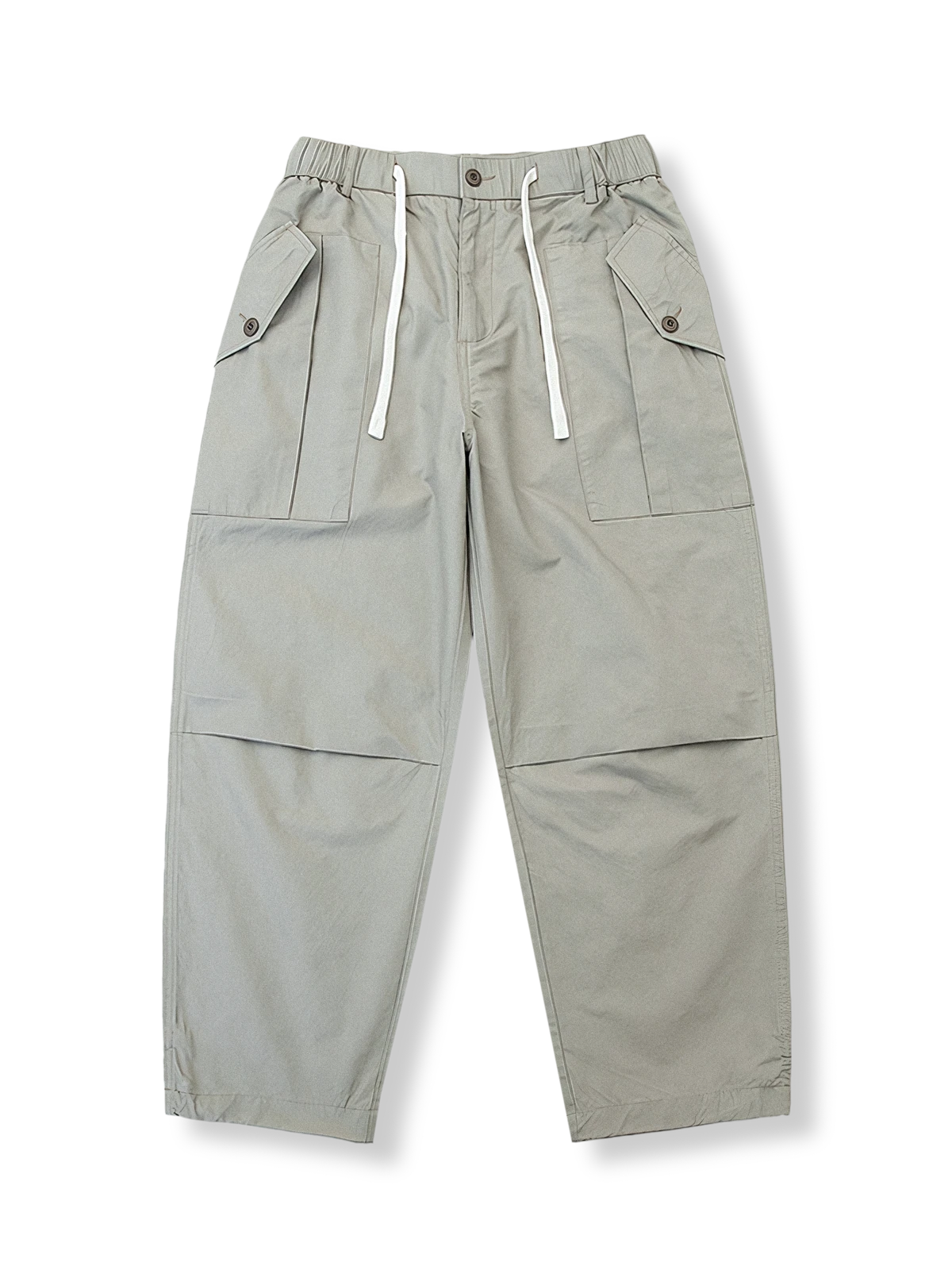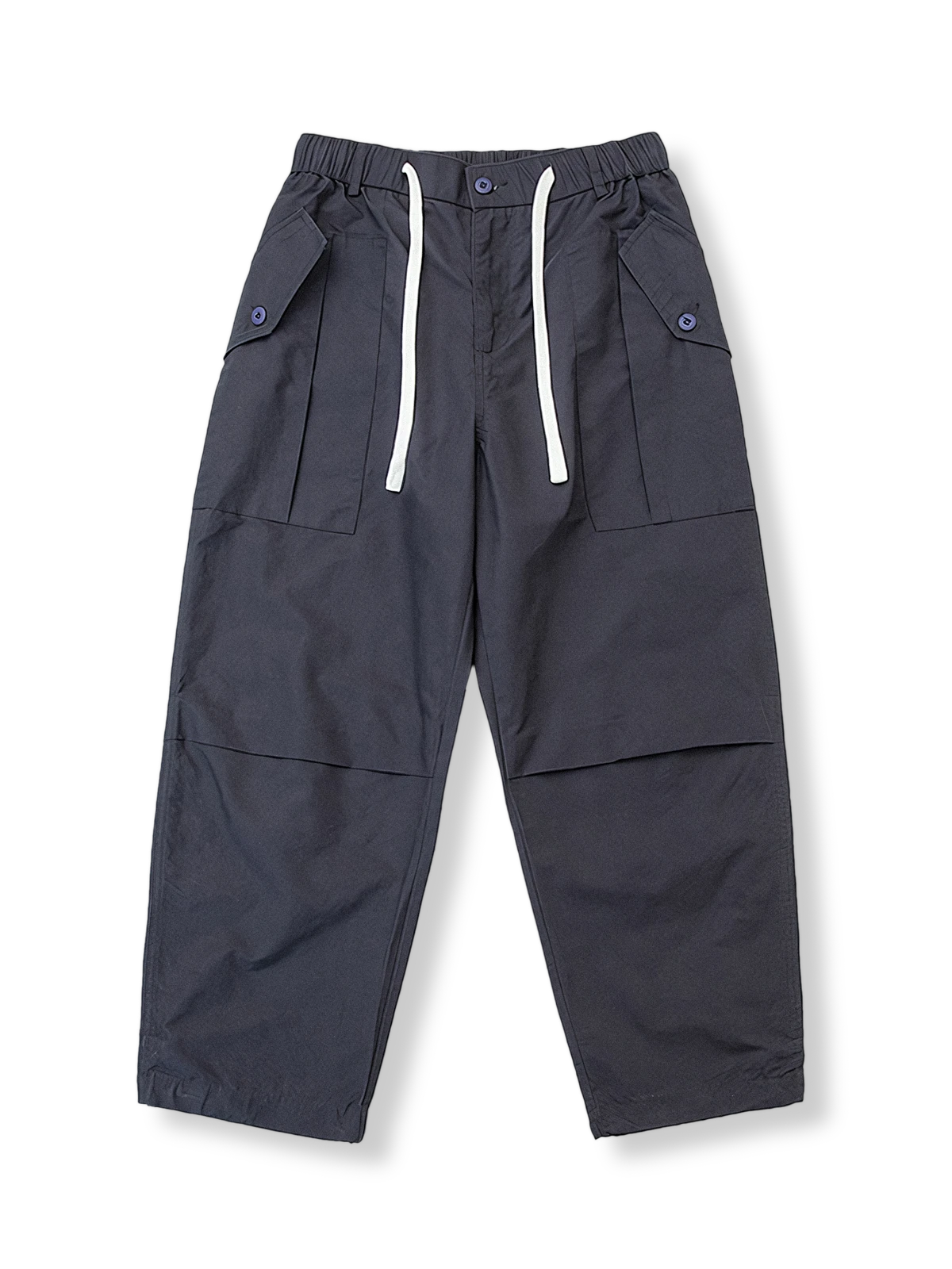 このゆったりなカジュアルパンツは、機能性を重視したデザインで、大きめのフラップポケットと立体的な装飾ポケットが特徴です。これらのポケットは、実用性だけでなく、パンツにユニークな工装スタイルの美学をもたらします。