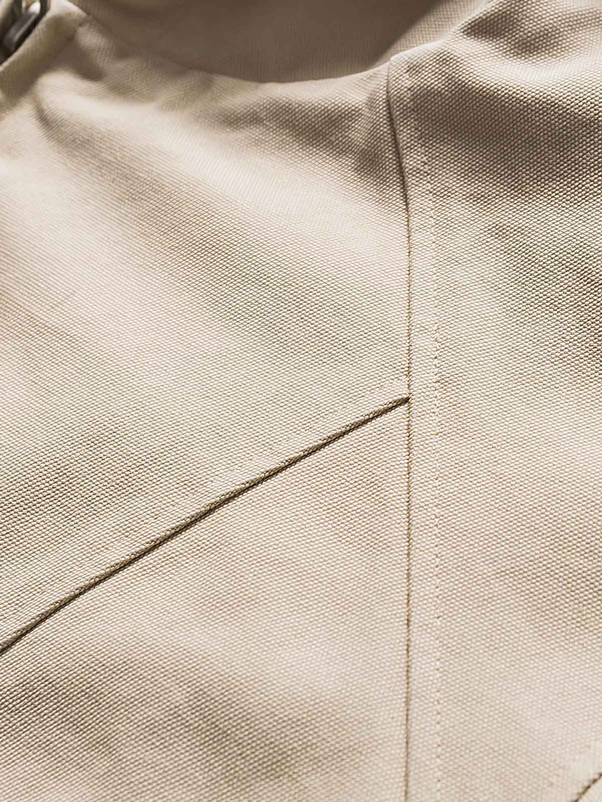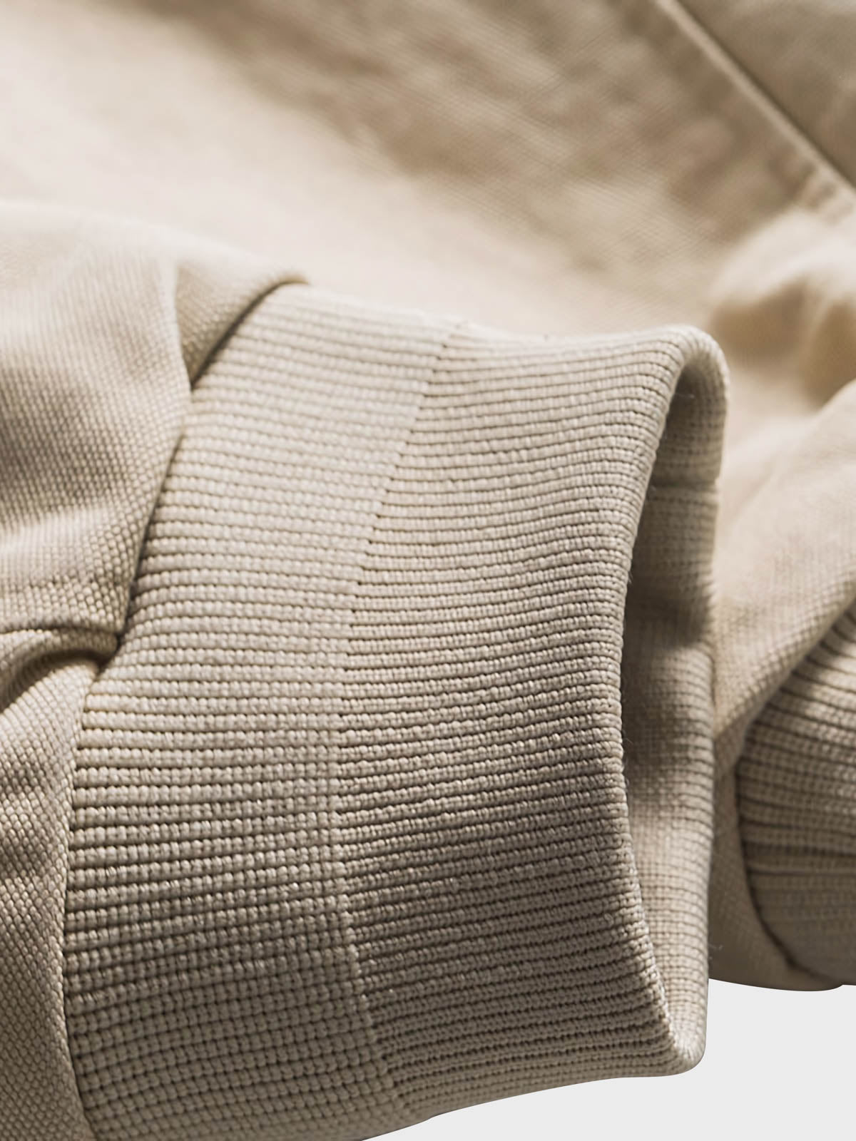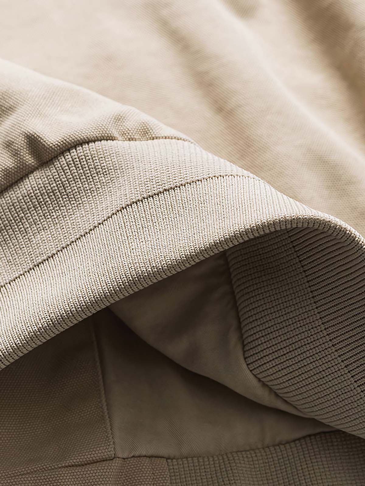 シルエットはリラックスフィットで、運動性を損なうことなく快適な着用感を実現しています。袖口と裾のリブニットは体のラインを拾いつつ、自由な動きを妨げない設計になっており、都市生活におけるアクティブな動きに対応します。
