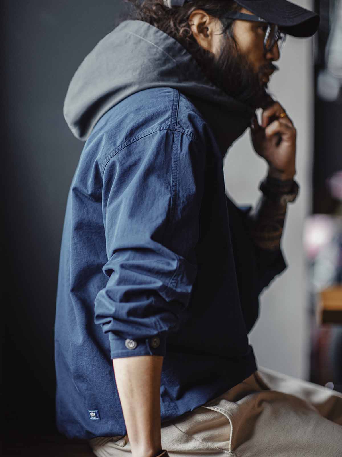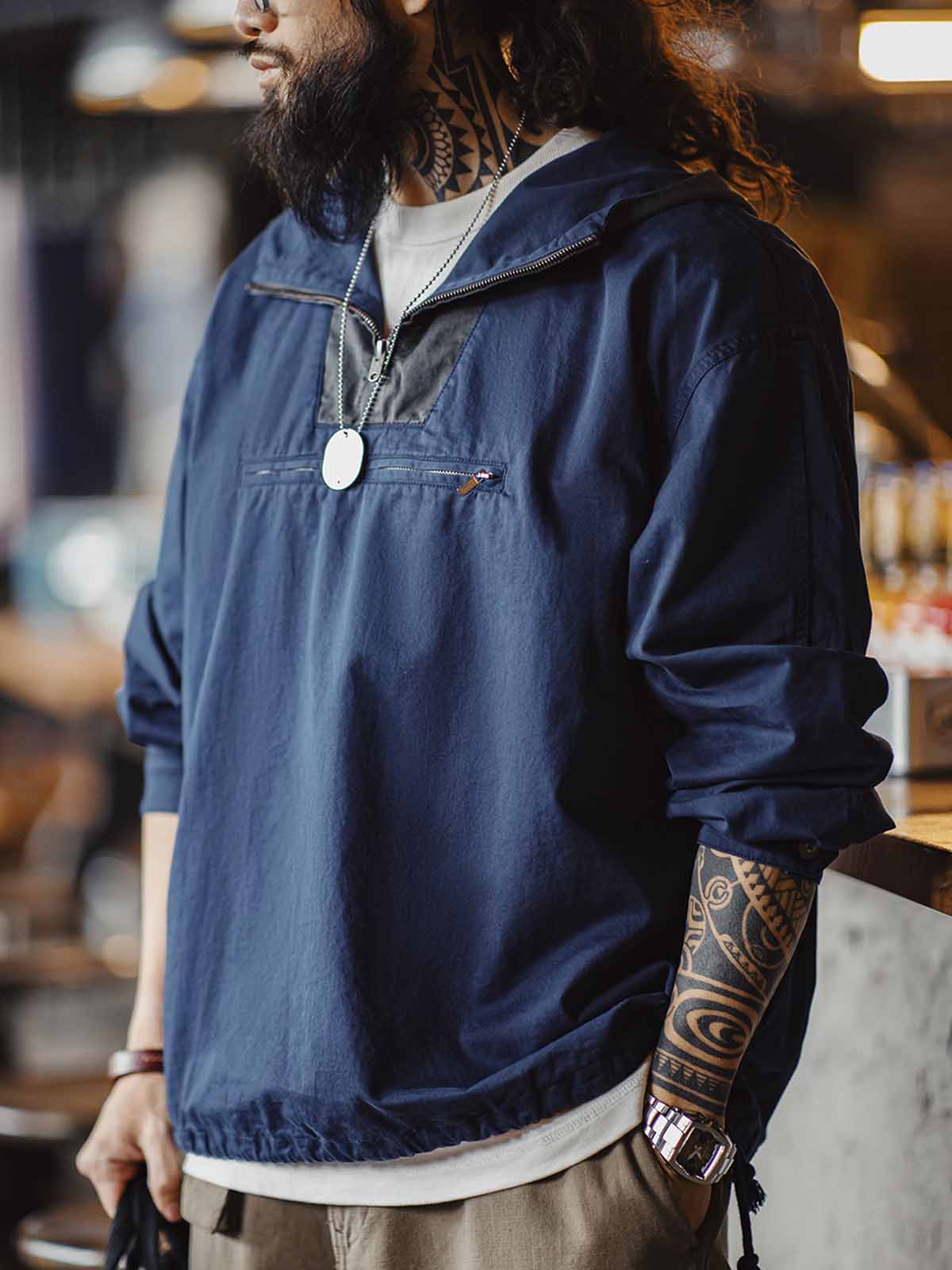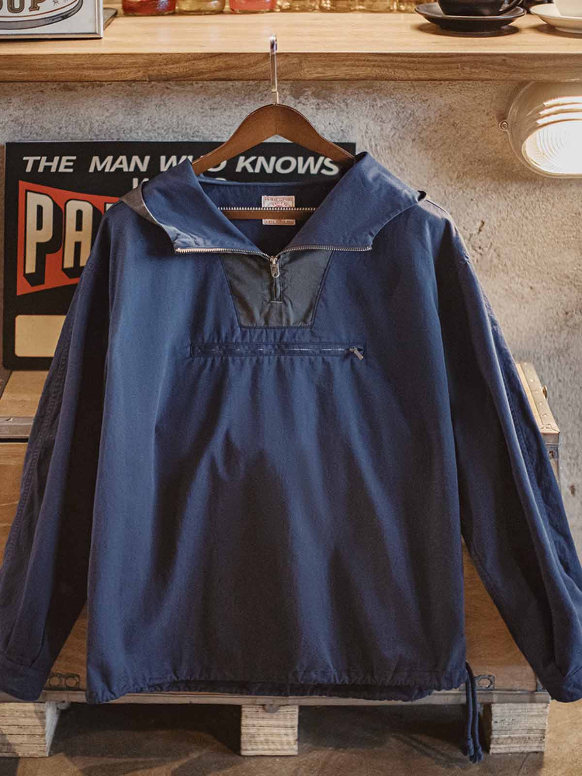 海軍デッキウェアにインスパイアされた、カラーブロックとフードがアクセントのヴィンテージ感溢れるワークジャケット。