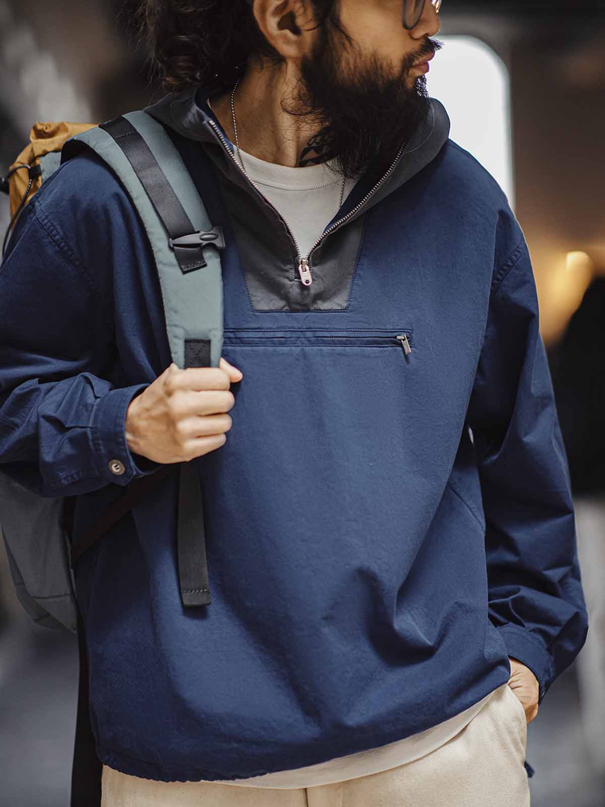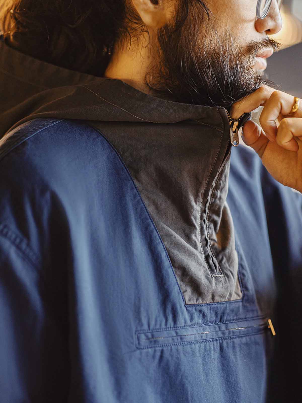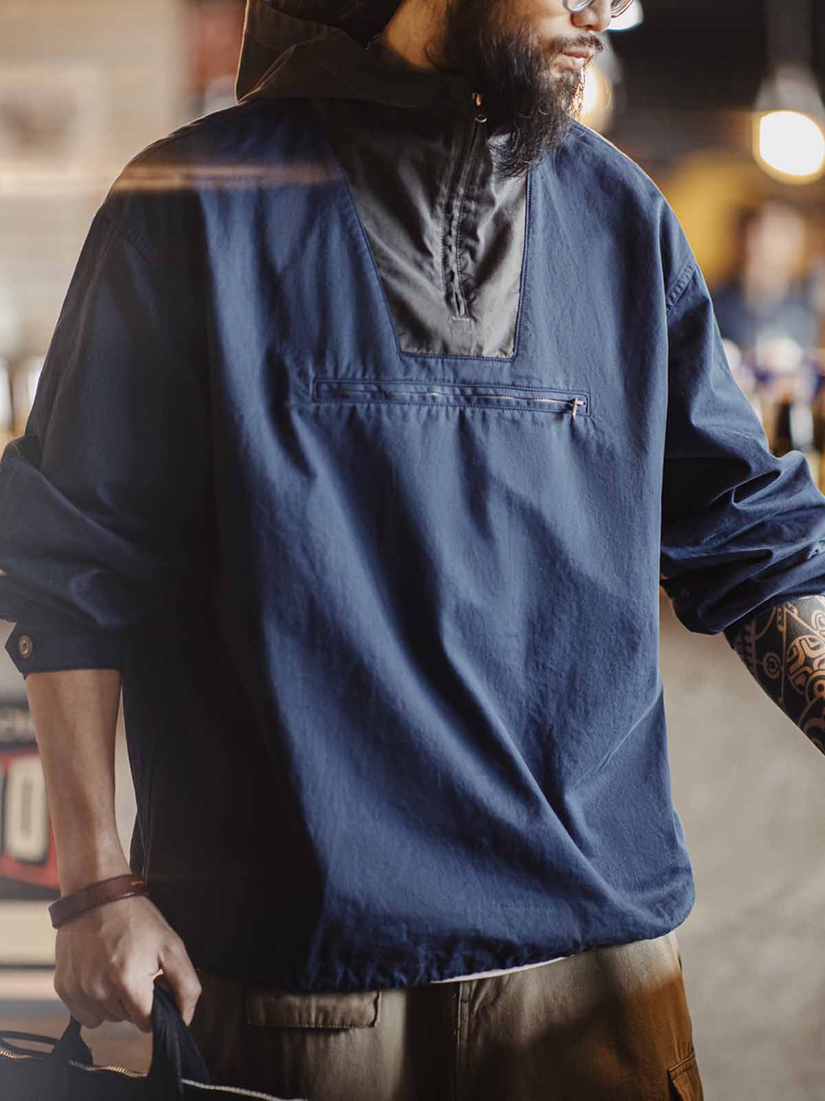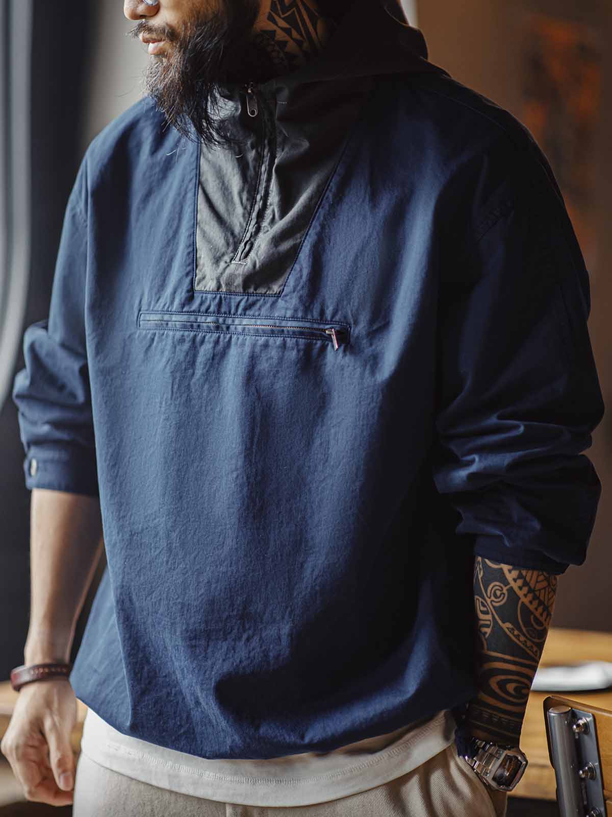 海軍デッキウェアにインスパイアされた、カラーブロックとフードがアクセントのヴィンテージ感溢れるワークジャケット。
