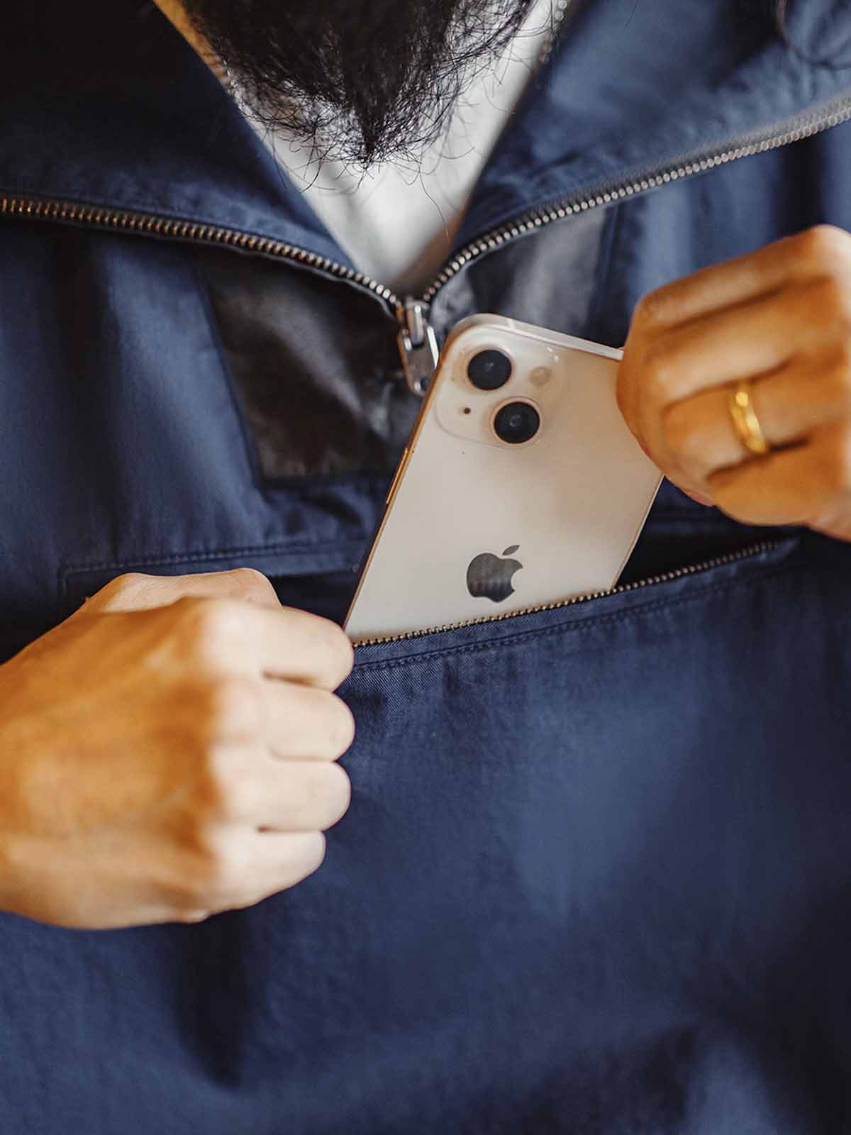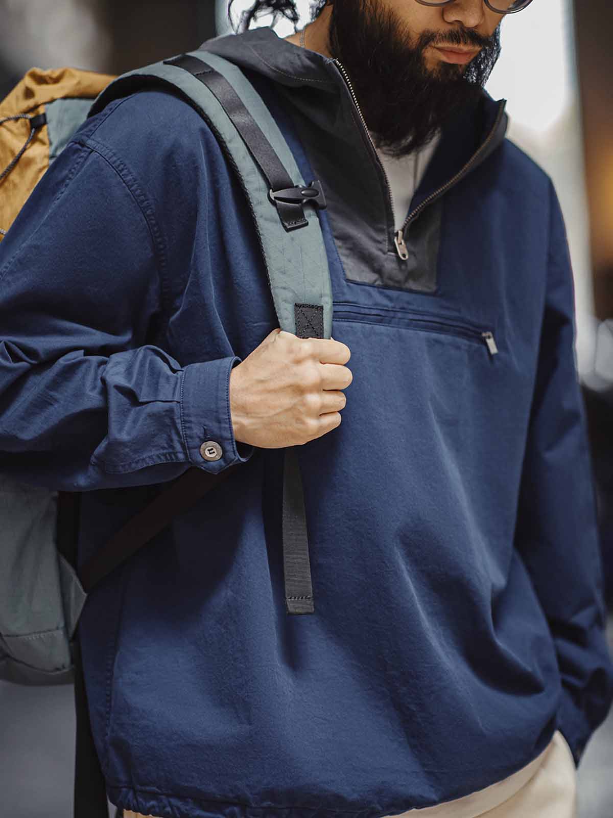 本ジャケットは旧式軍服をモチーフに、プルオーバー式フードと台形カラーブロックディテールを巧みに融合。200g/m²斜め織りの全綿素材が、アメリカンミリタリーの堅牢さと快適な着心地を実現し、着る人に豊かなレイヤードスタイルを演出します。胸部の大容量ジッパーポケット、調節可能な袖口、裾のドローコードなどの実用的なディテールが、デザイン性を高めるとともに、ブルーグレーのカラーブロックがヴィンテージな韻味を引き立てます。ワークパンツやルーズなデニムとの重ね着はもちろん、単品でも存在感のあるアウトドアスタイルを楽しめます。