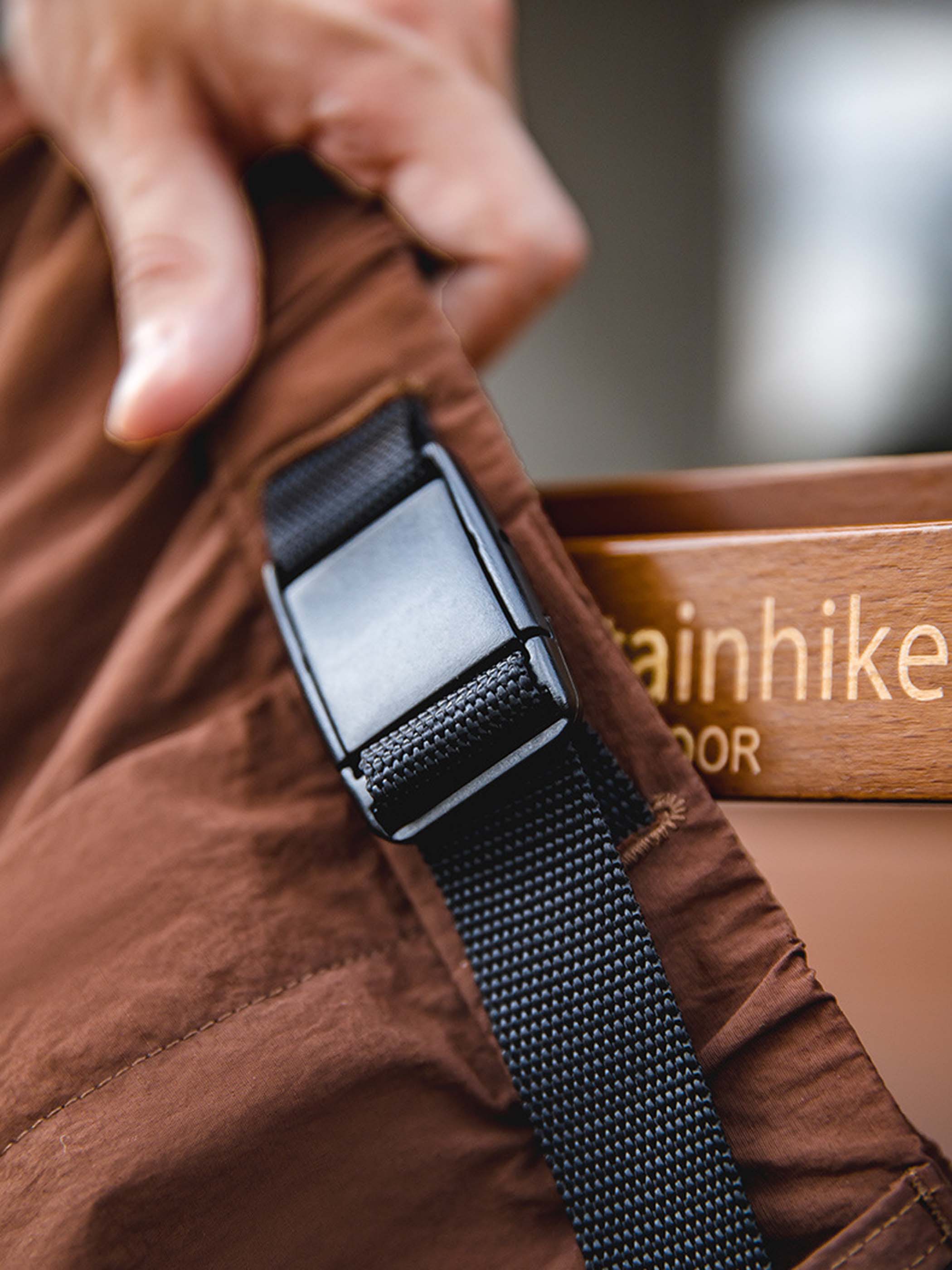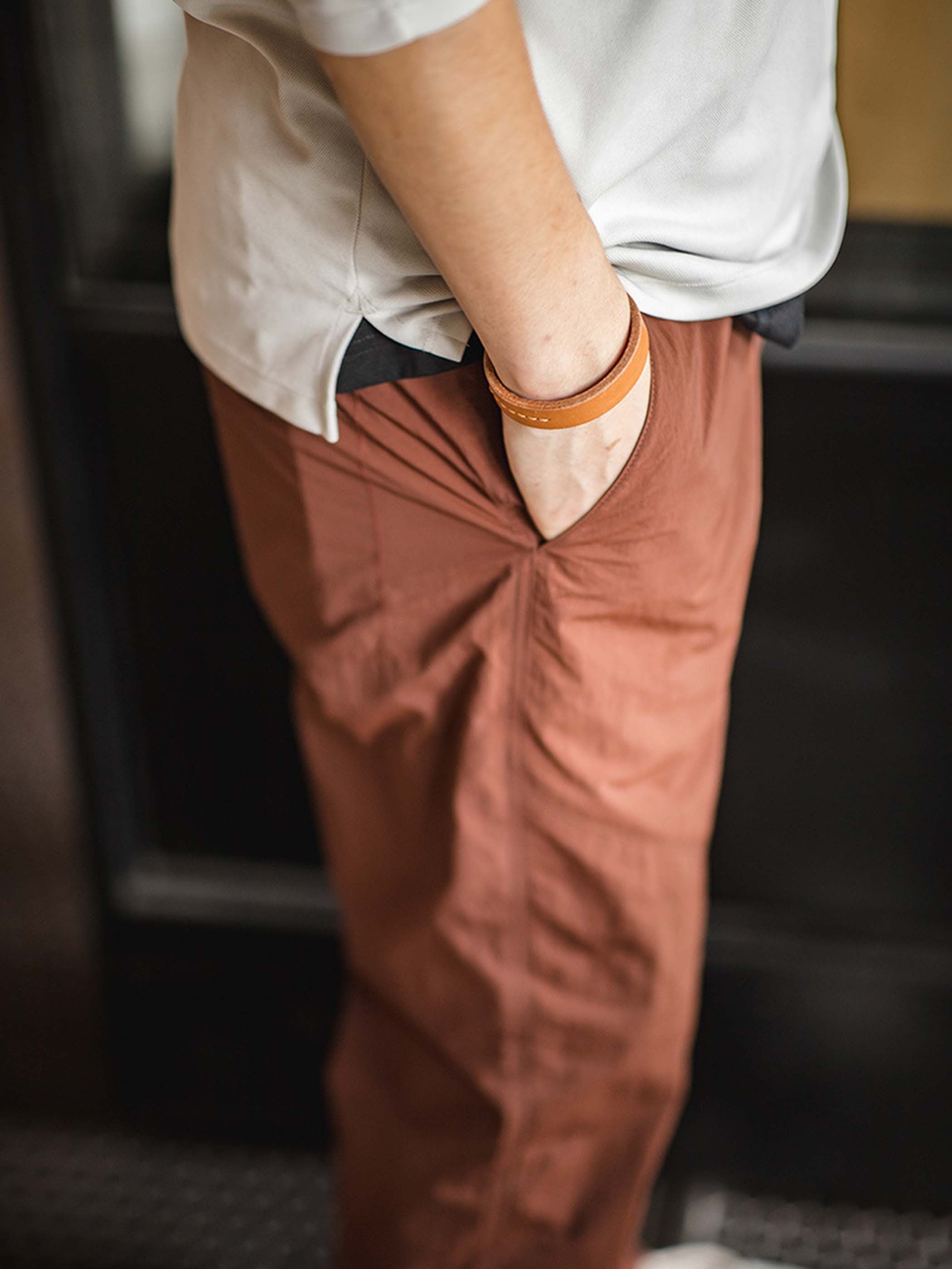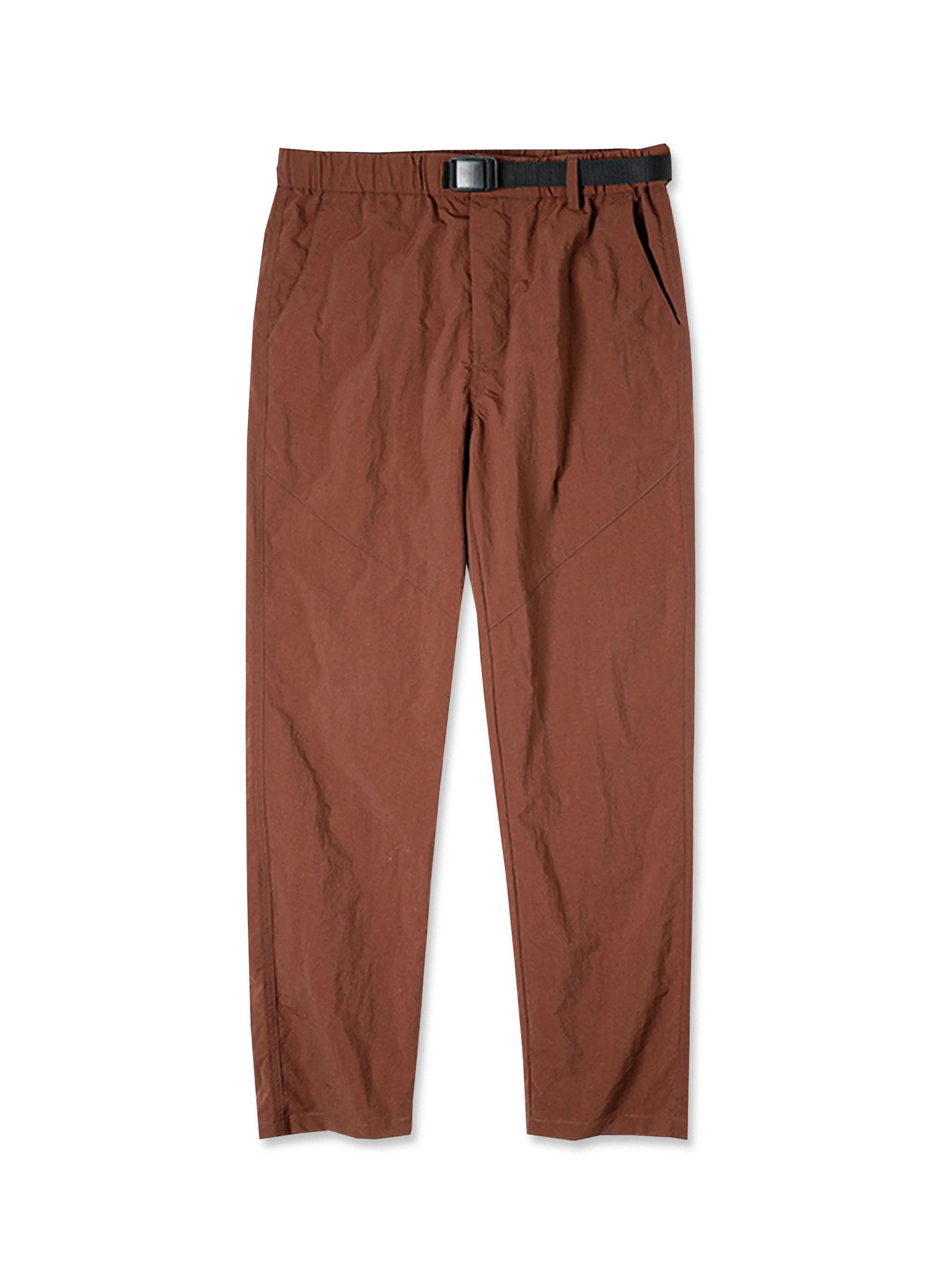 アーバンアウトドアと山系ギアのエッセンスを融合したデザイン。軽量ナイロン素材を使用し、高い速乾性能を発揮。湿気の多い環境やアクティブなアウトドアシーンでも快適な着用感を提供。シルエットは直線的なストレートテーパード仕様で、ワークウェアの無骨さを残しつつ、視覚的に脚のラインを整える効果をプラス。ウエスト部分には編み込みベルトと樹脂バックルを採用し、ワンタッチで着脱が可能でフィット感も調整しやすい仕様。生地にはウォッシュ加工を施し、落ち着いたマットな風合いが特徴。140g/m²の軽量素材で、シルエットを保ちながらも軽やかな着心地を実現。裾をロールアップすればカジュアルなアウトドアスタイルも楽しめ、トレッキングシューズやスニーカーとの相性も抜群。