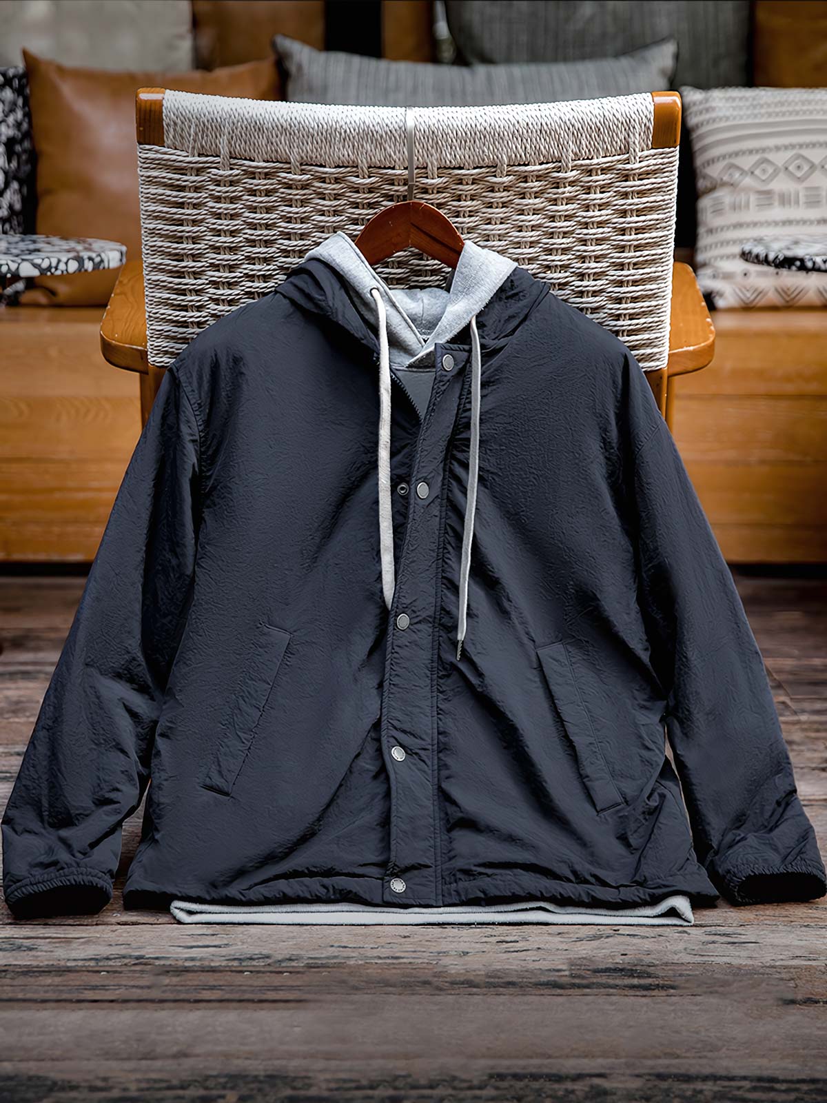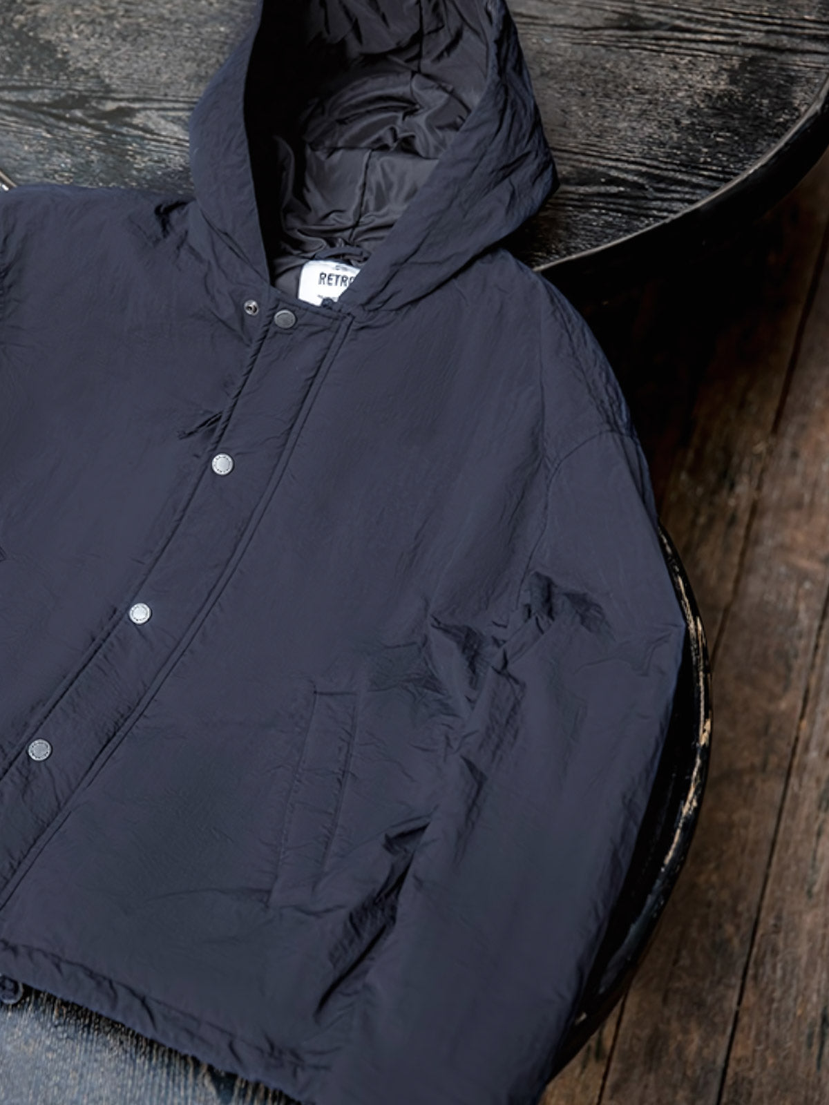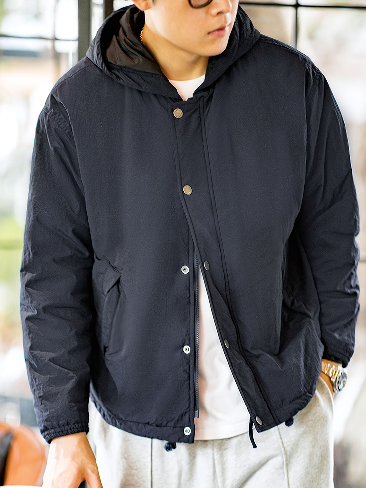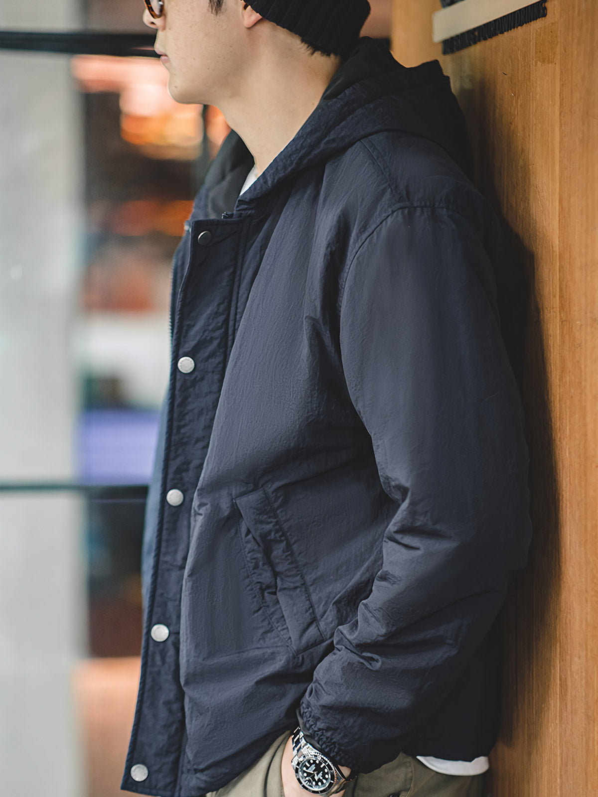 重ね着に適したゆったりとしたフィット感を提供します。フードの調節ボタンは、実用性を高めるとともに、風を防ぎ暖かさを保つ機能も備えています。