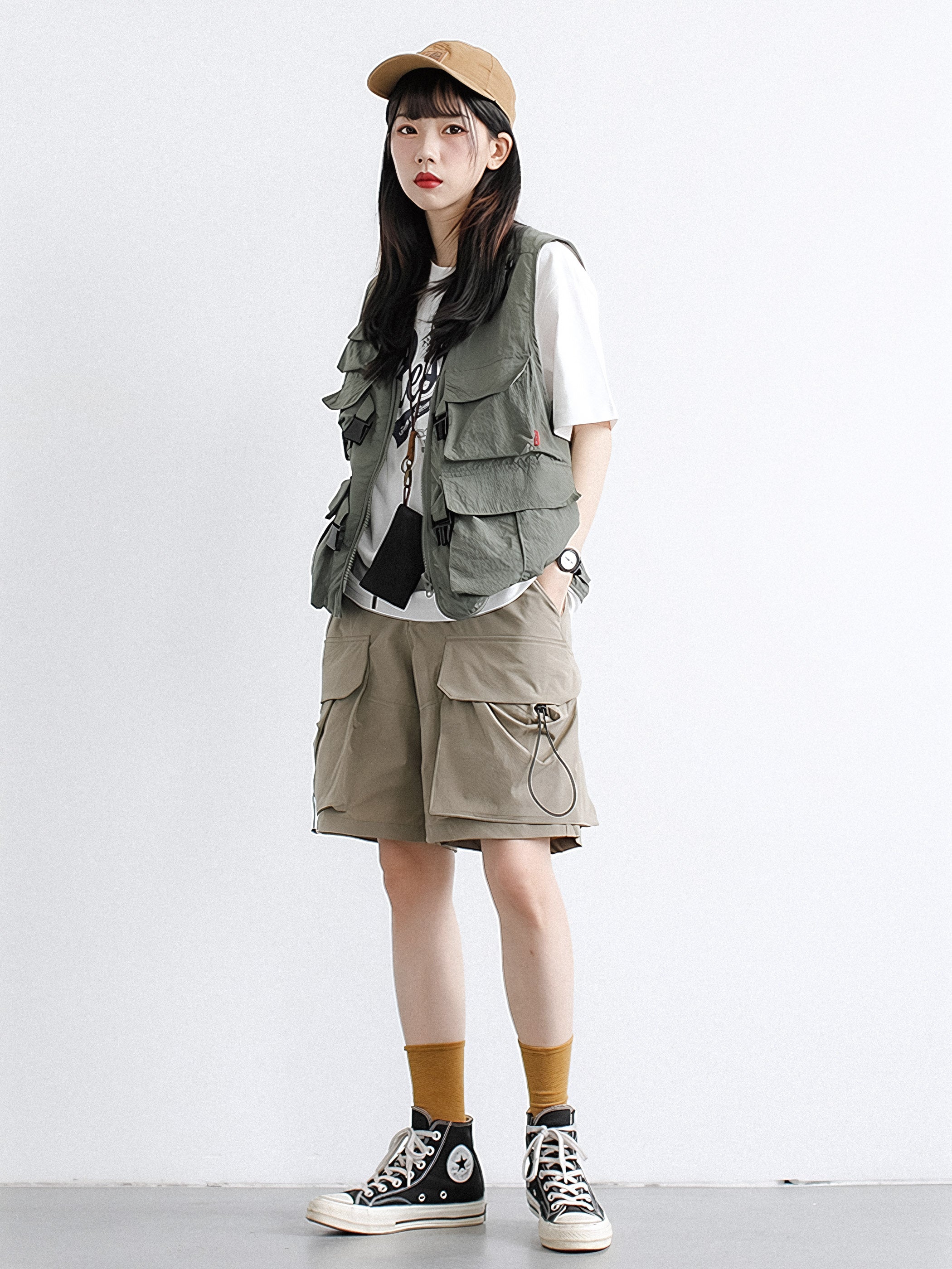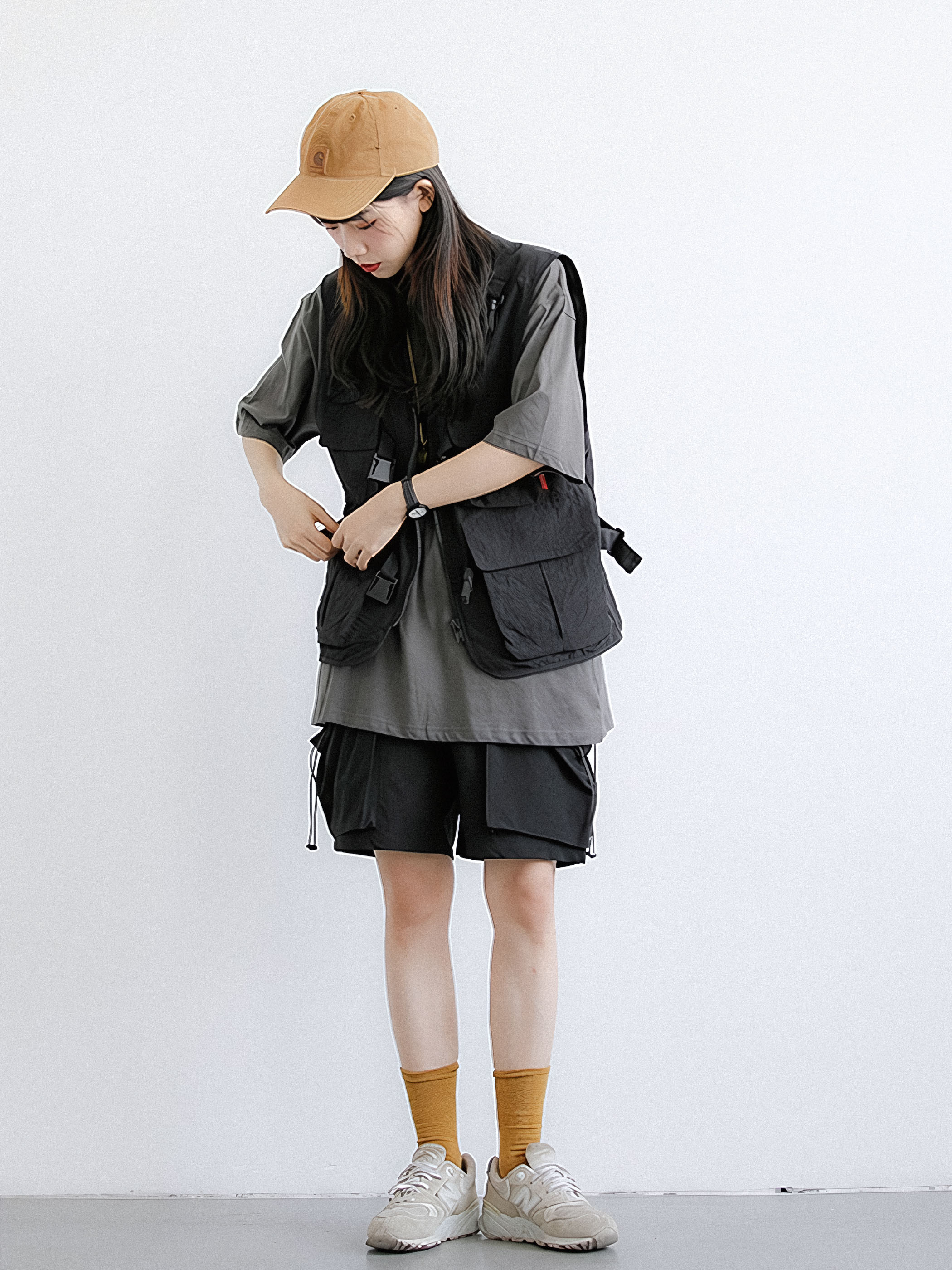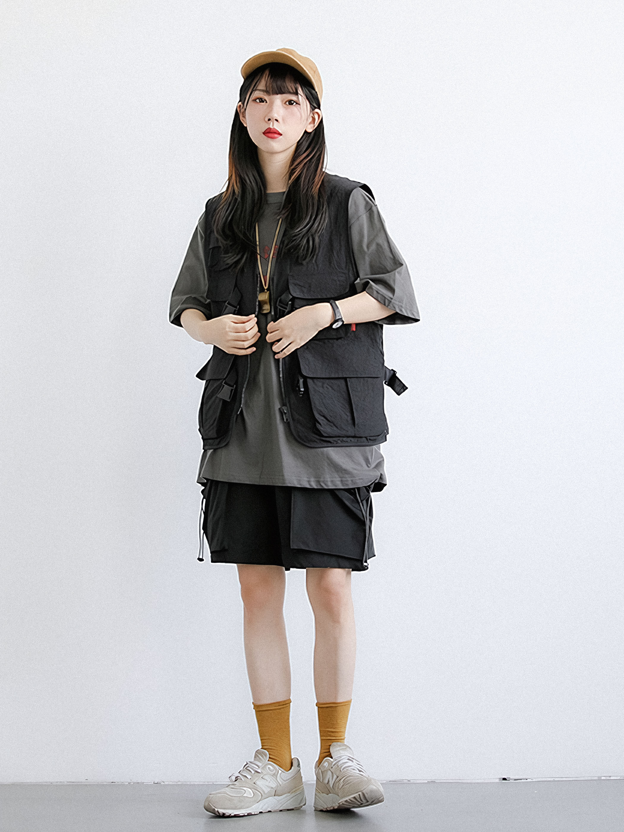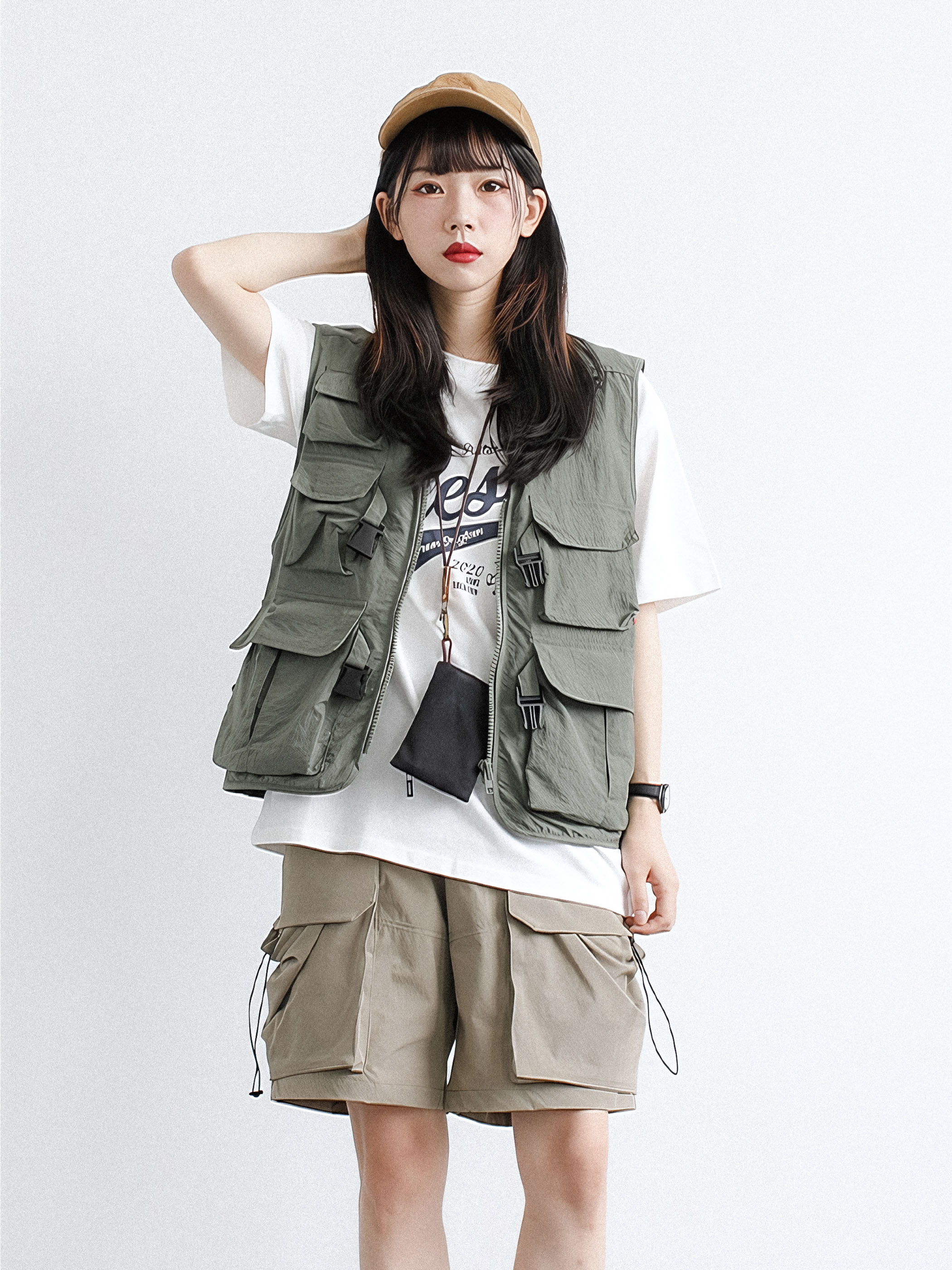 このベストのデザインは、前面にあるの立体的な大きなポケットが特徴で、他と一線を画しています。これらのポケットは実用性を高めるだけでなく、ベスト全体にファッション要素を加えています。これらのデザインは、物を簡単に持ち運ぶだけでなく、全体の外観にさらなる立体感とディテールをもたらしています。