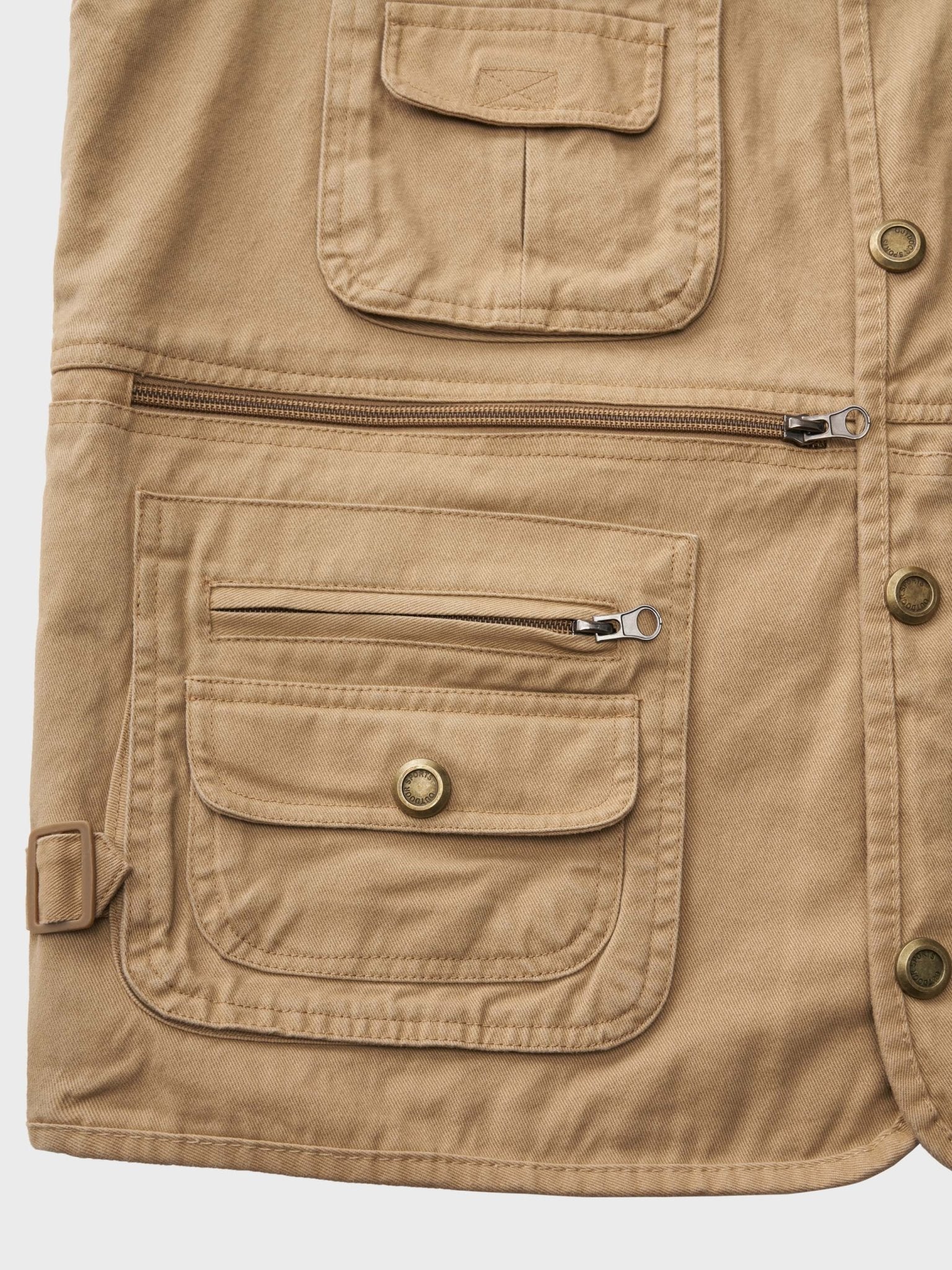4つのフラップポケットと4つのファスナーポケットのデザインで、様々なものを収納できます。金属のバックルが設計されて、美しさだけでなく耐久性も向上しています。