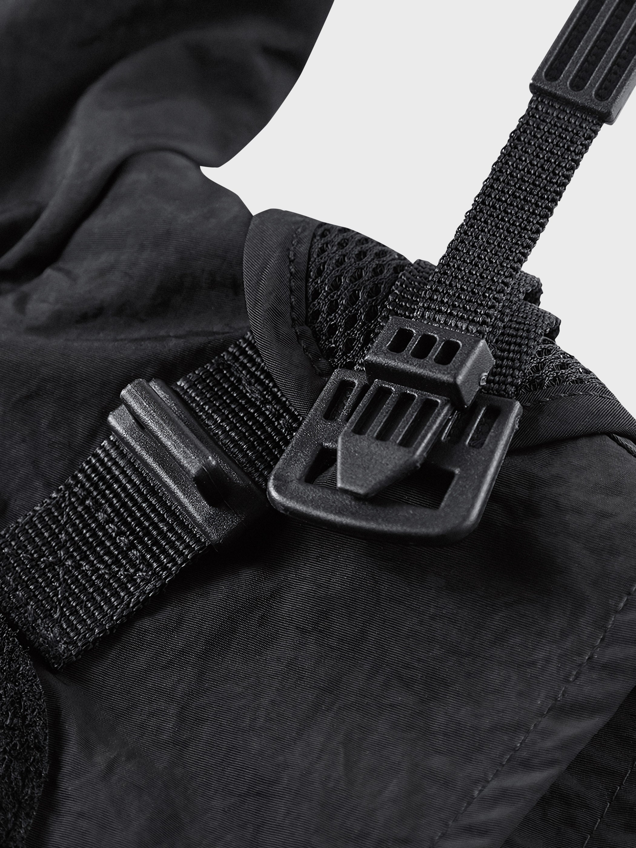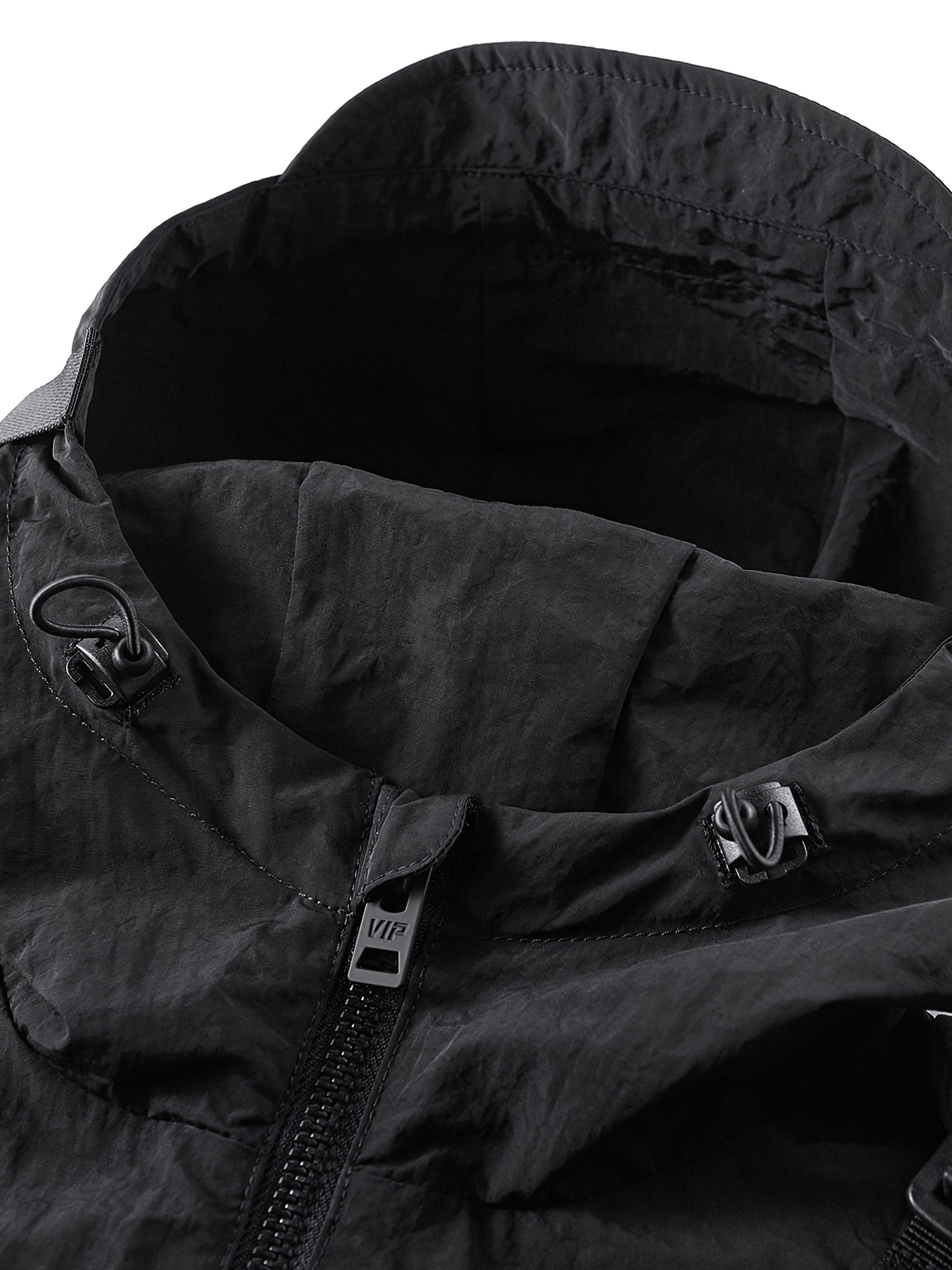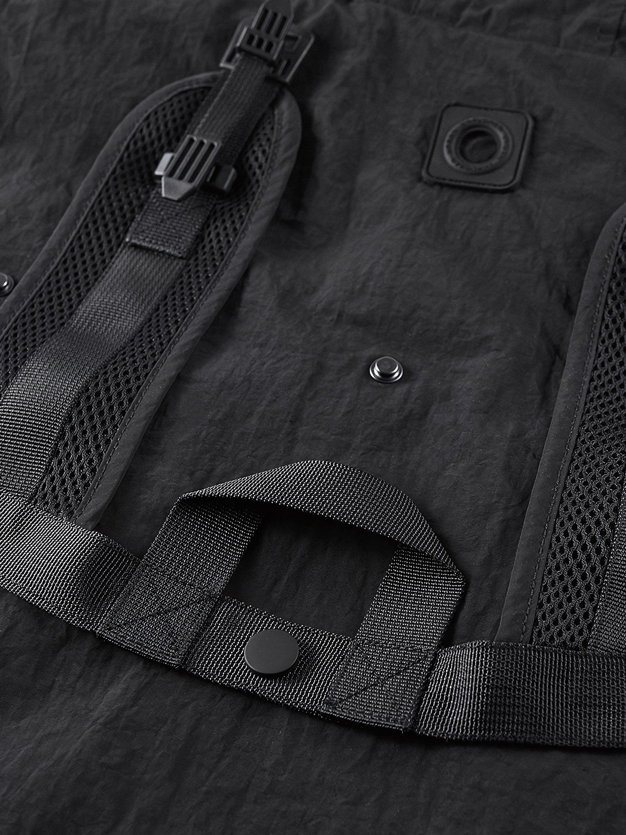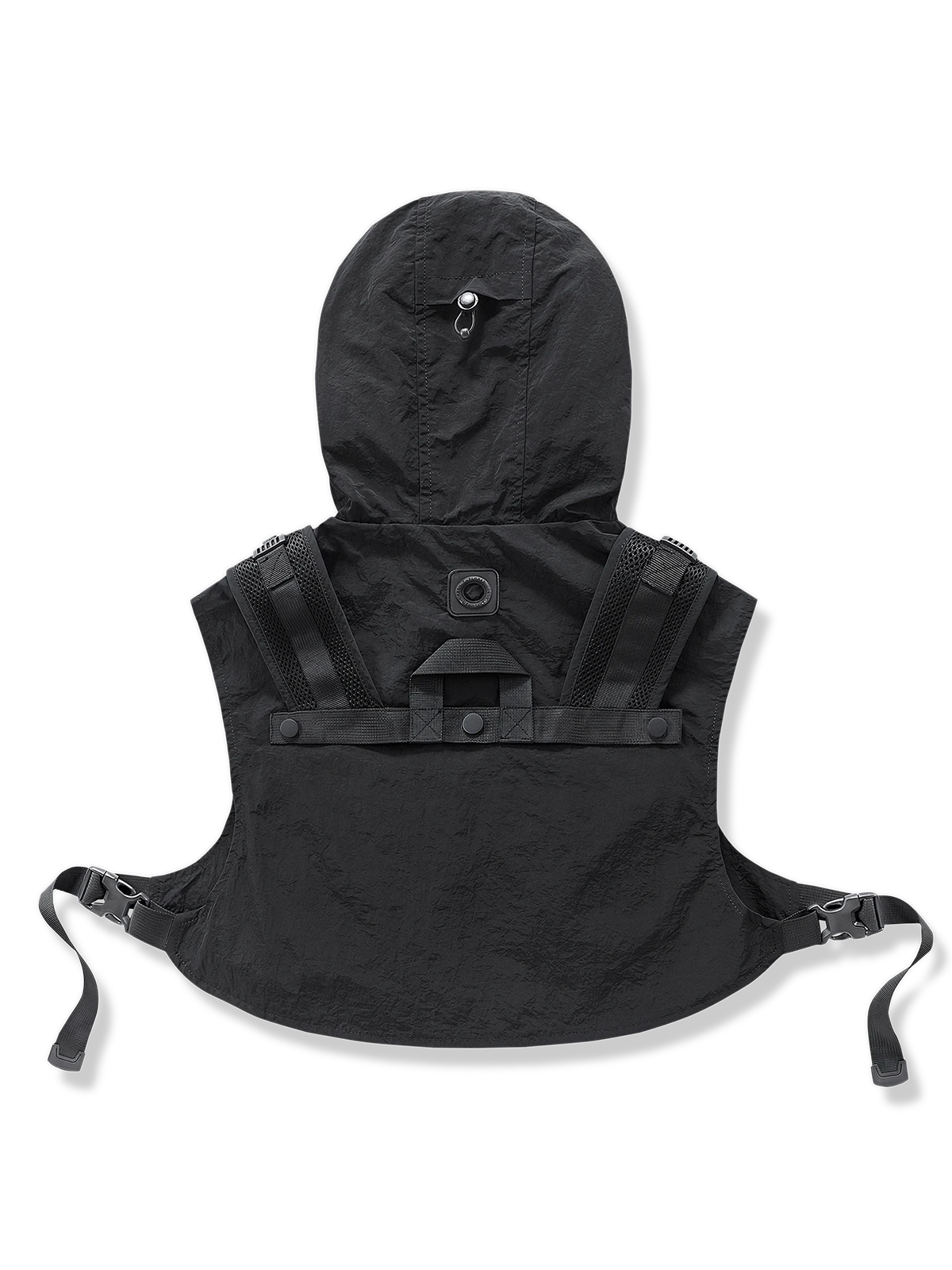 ショート丈のデザインとゴムひも付きのフードが組み合わさり、フードの着用感を快適にします。ベストの裾とウエストサイドには2つのボタンストラップがデザインされており、装飾性を高めるだけでなく、体型に合わせてゆるみやきつさを調整することができ、快適な着用感を確保します。