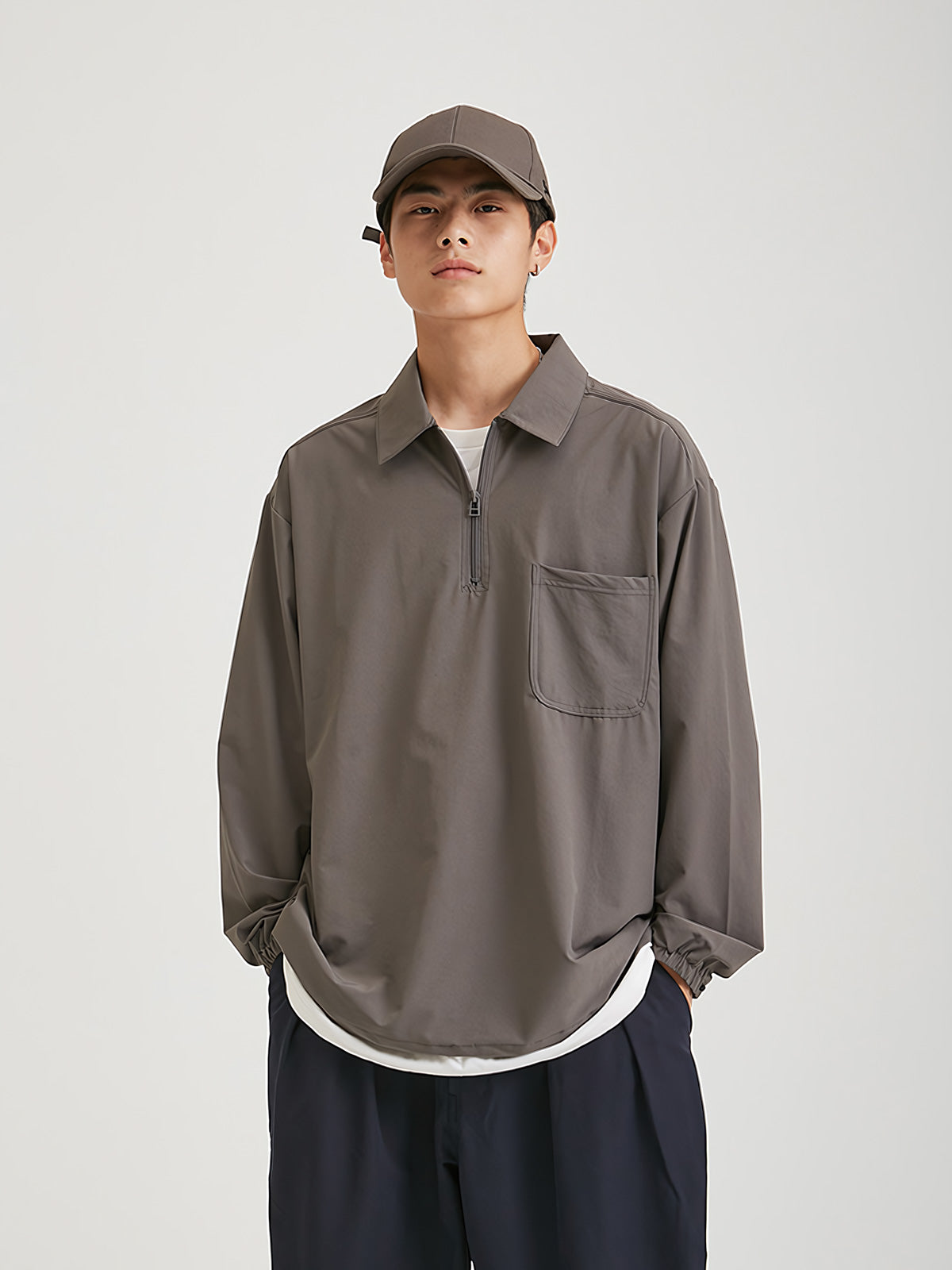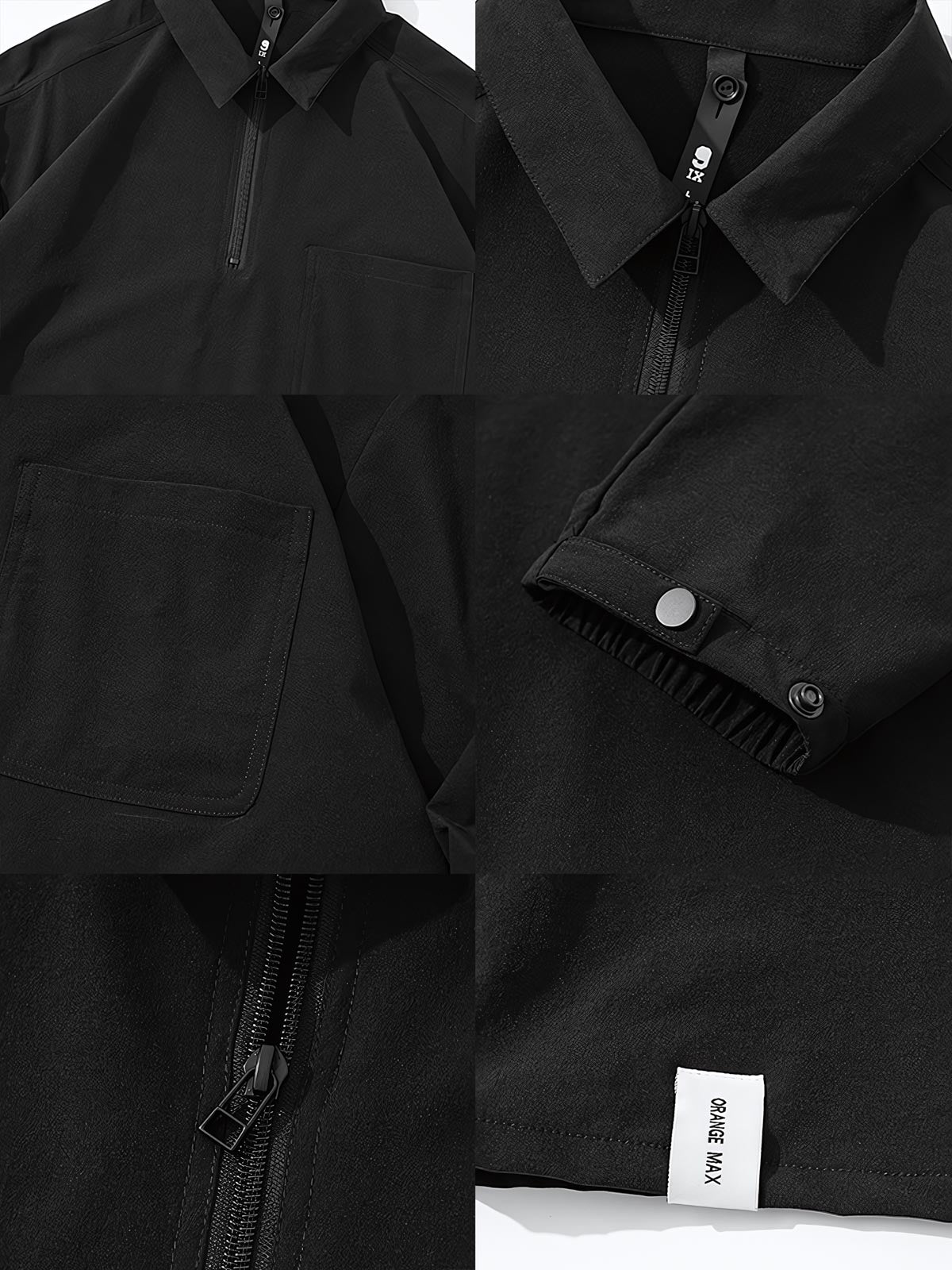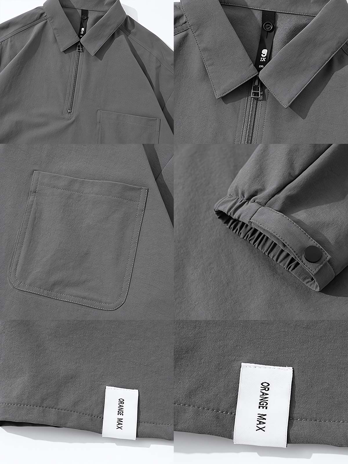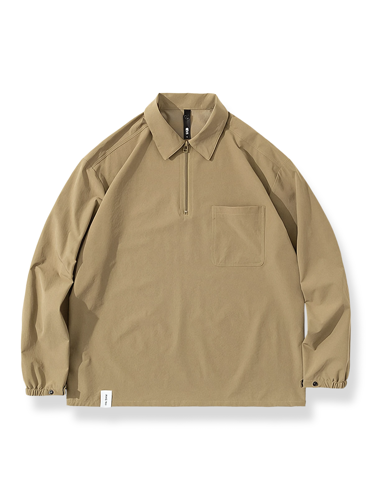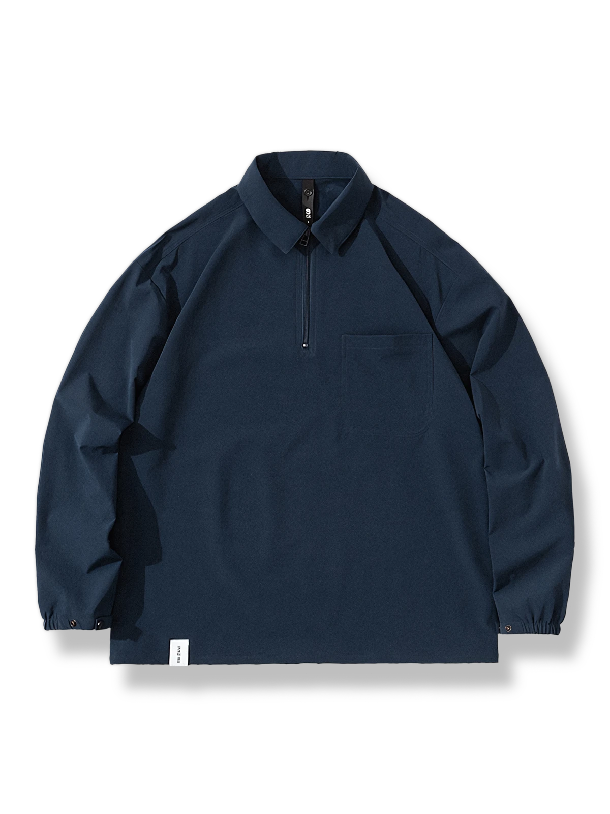 このジャケットは、ゆったりとしたデザインで、着用者に十分な動きの空間と快適さを提供します。ポロ襟は少し正式な印象を加えつつ、プルオーバーの便利さを保持しており、忙しい都市生活に適しています。袖口と裾のわずかな伸縮性が、より自由な動きを可能にします。