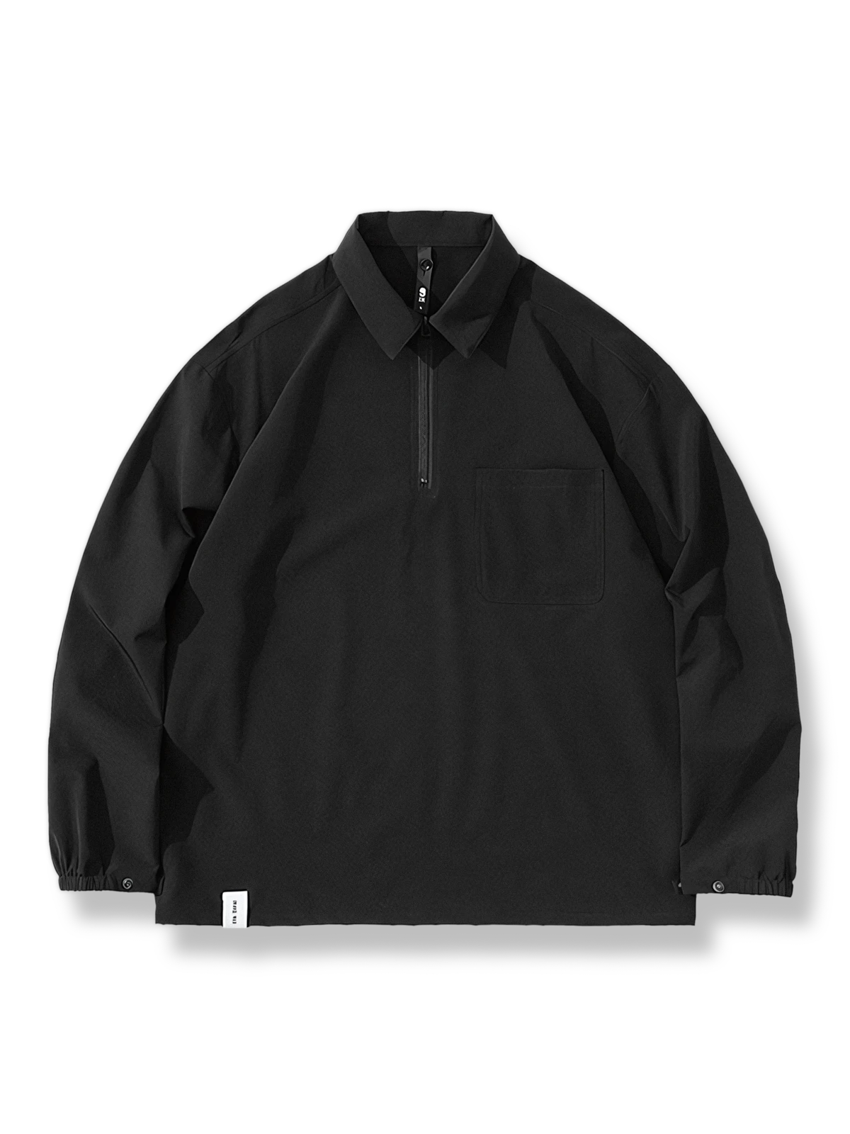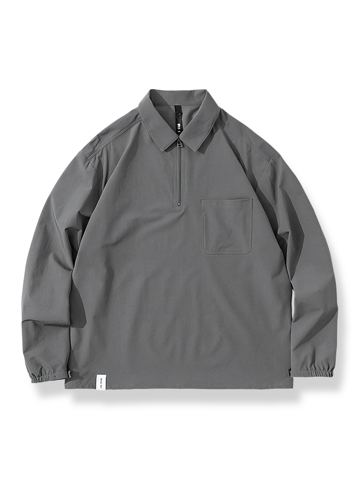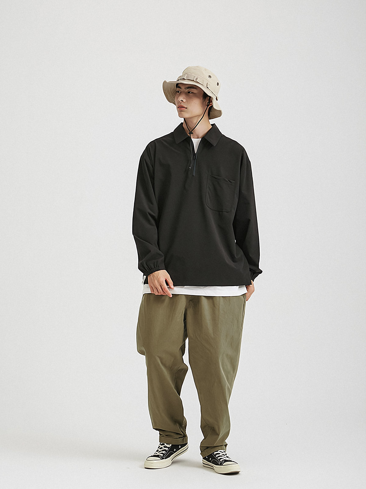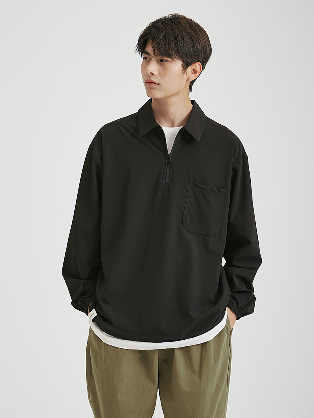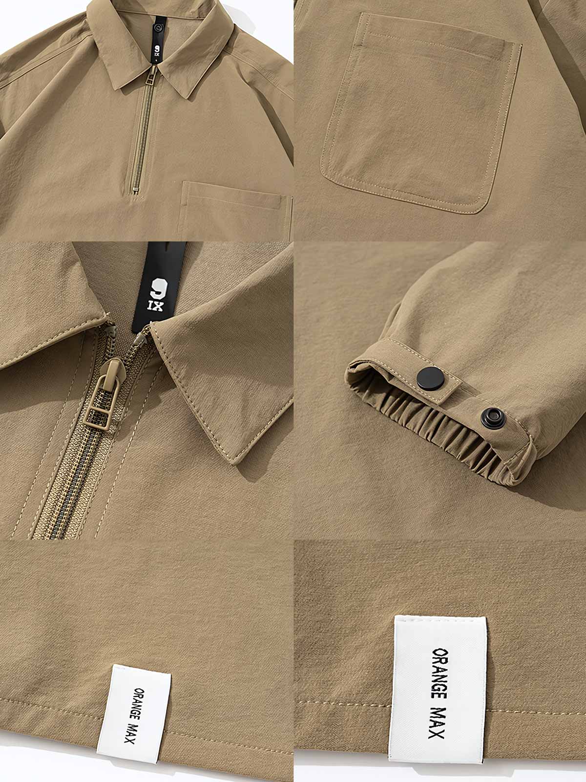 このジャケットは、ゆったりとしたデザインで、着用者に十分な動きの空間と快適さを提供します。ポロ襟は少し正式な印象を加えつつ、プルオーバーの便利さを保持しており、忙しい都市生活に適しています。袖口と裾のわずかな伸縮性が、より自由な動きを可能にします。