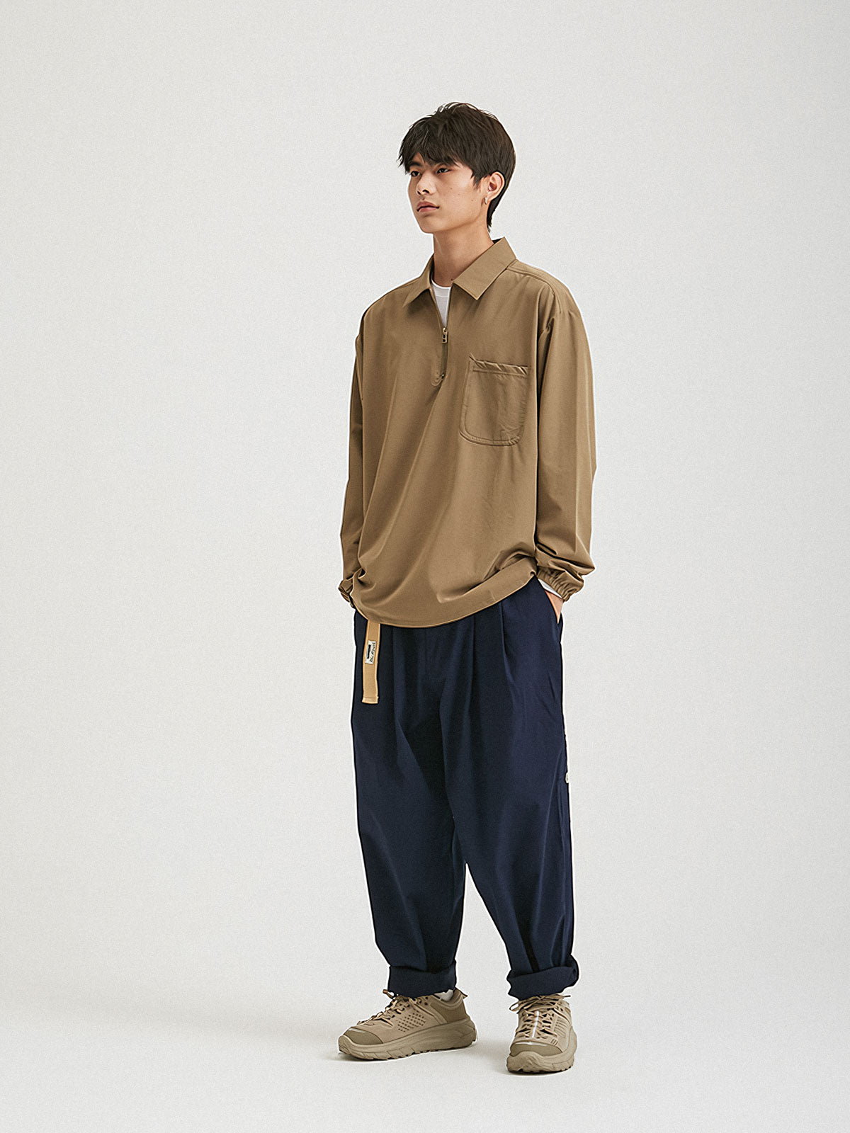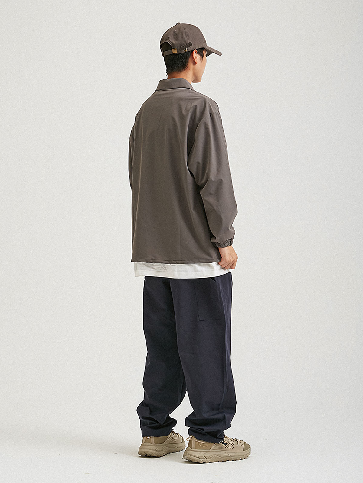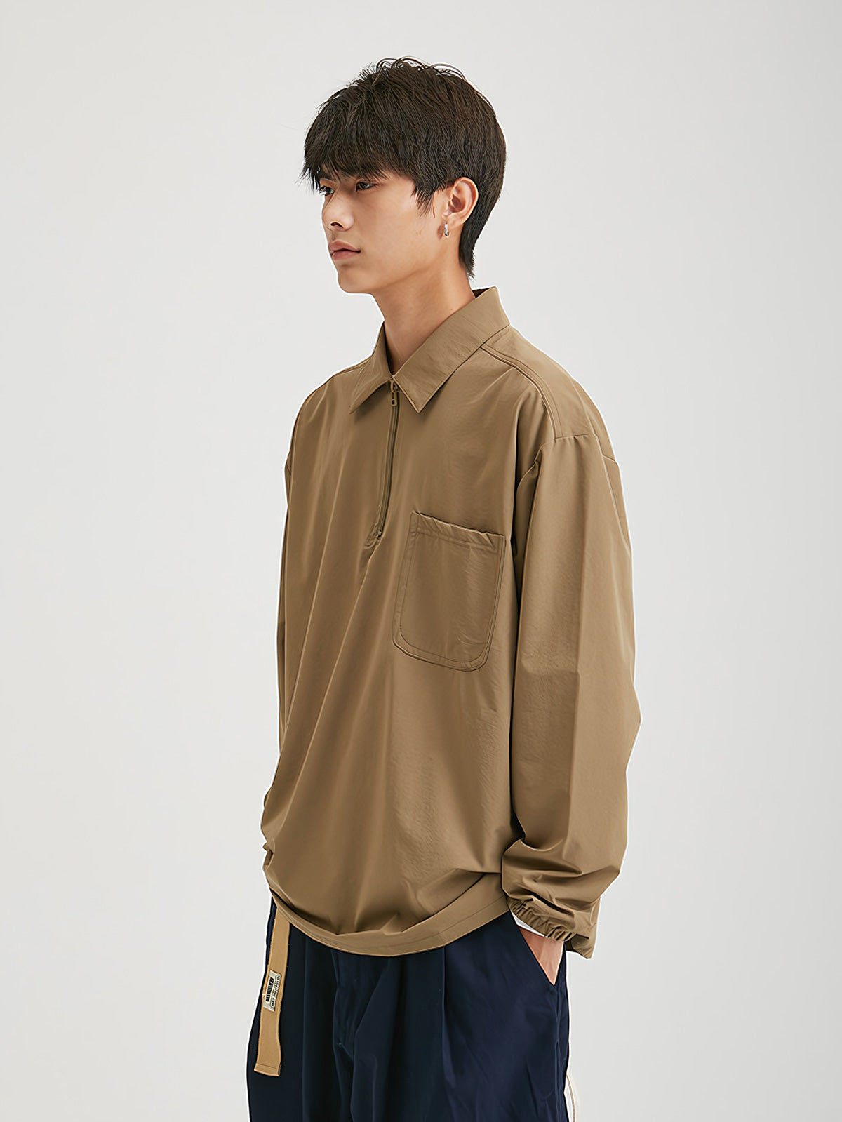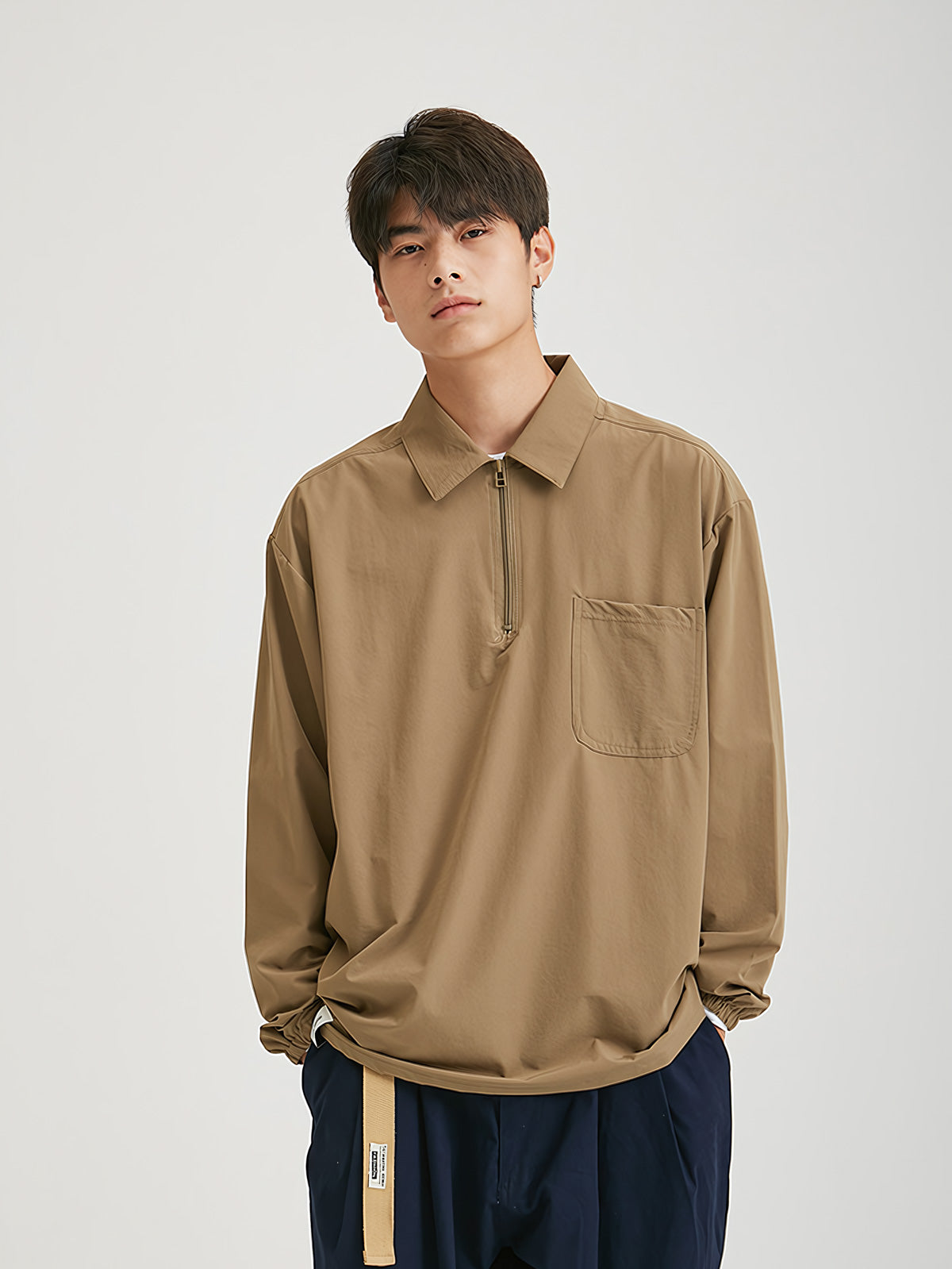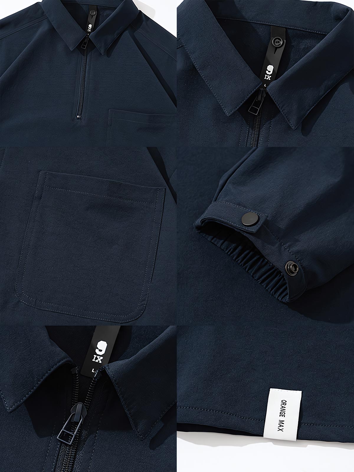 このジャケットは、ゆったりとしたデザインで、着用者に十分な動きの空間と快適さを提供します。ポロ襟は少し正式な印象を加えつつ、プルオーバーの便利さを保持しており、忙しい都市生活に適しています。袖口と裾のわずかな伸縮性が、より自由な動きを可能にします。