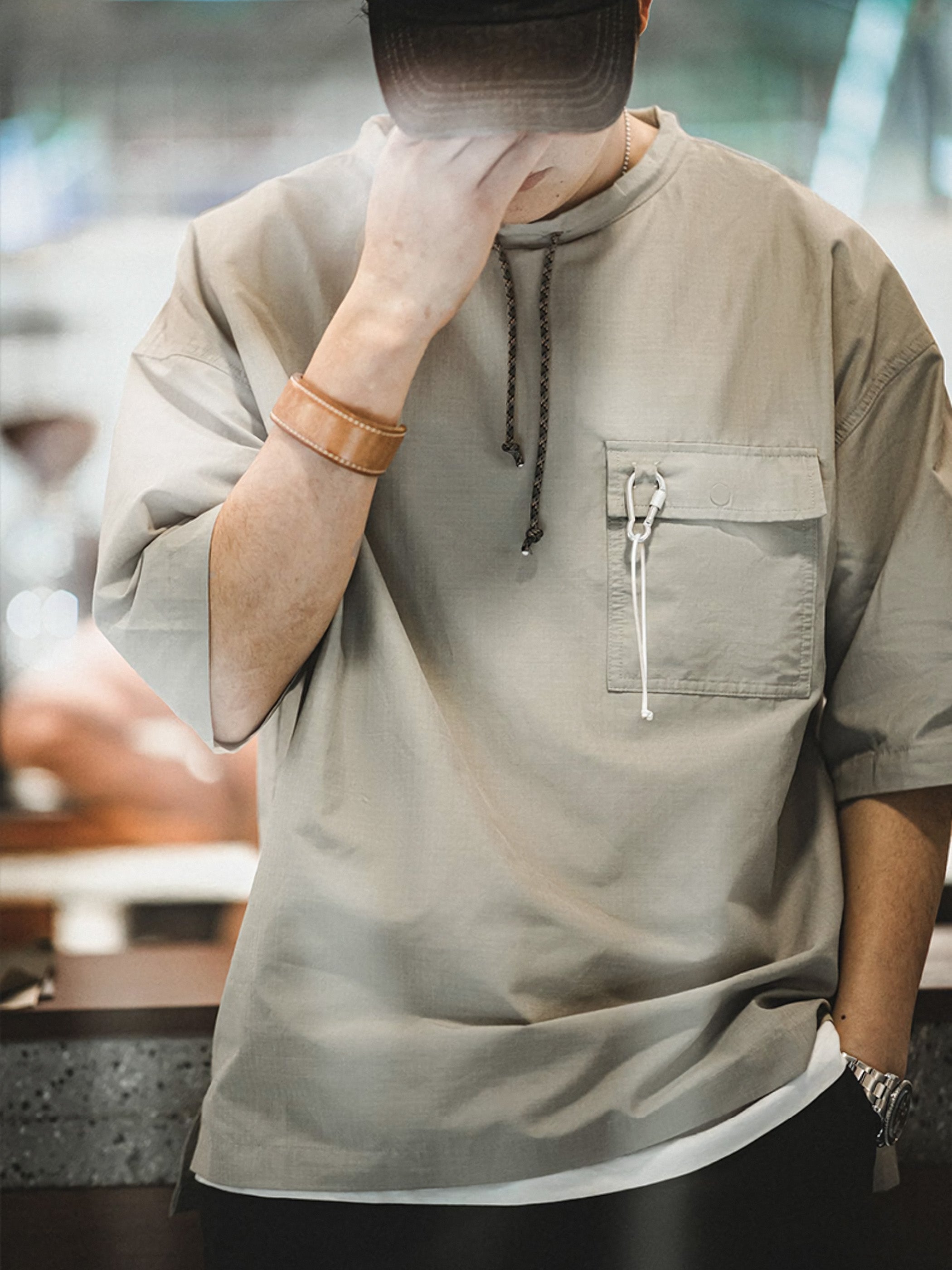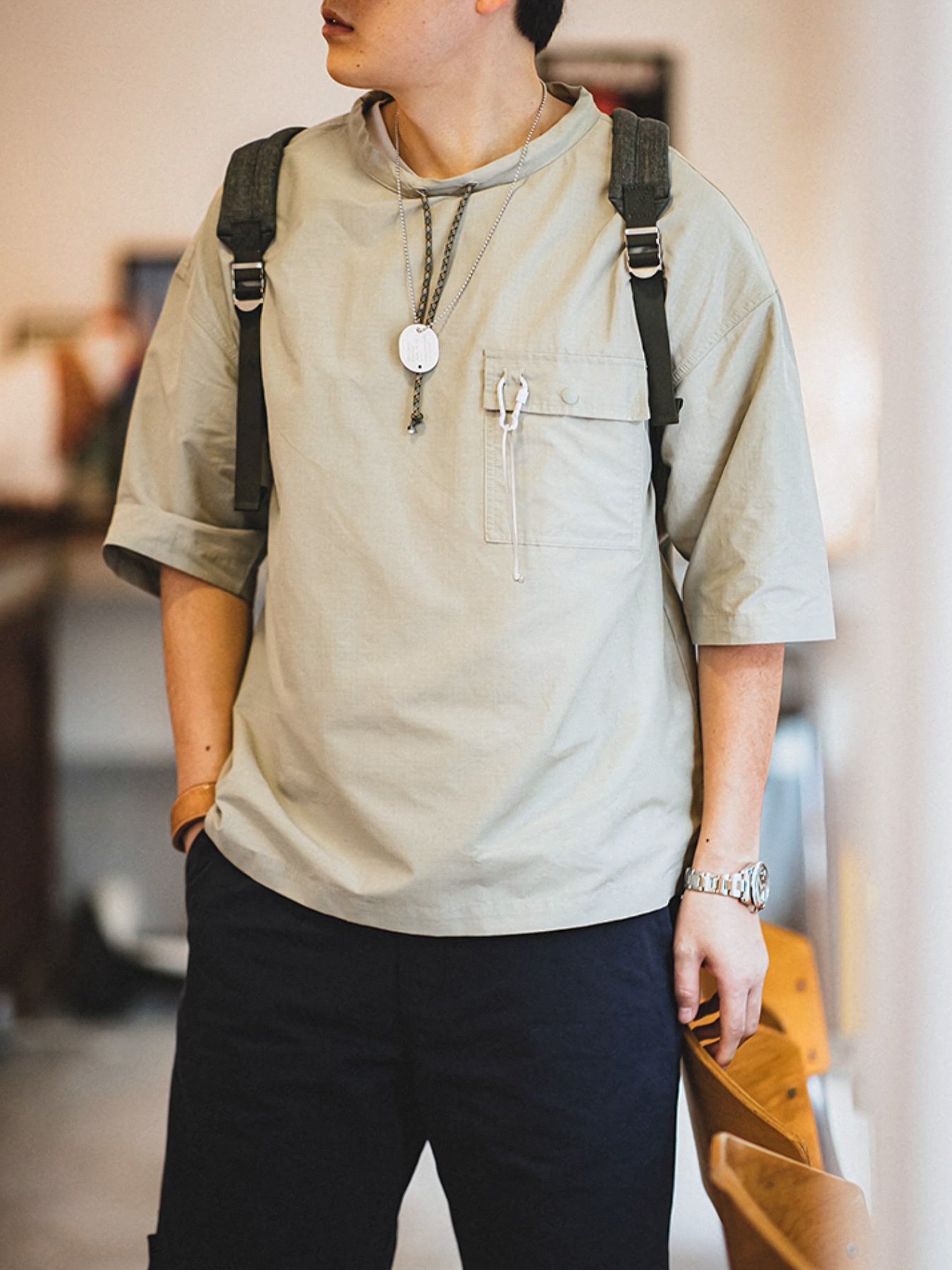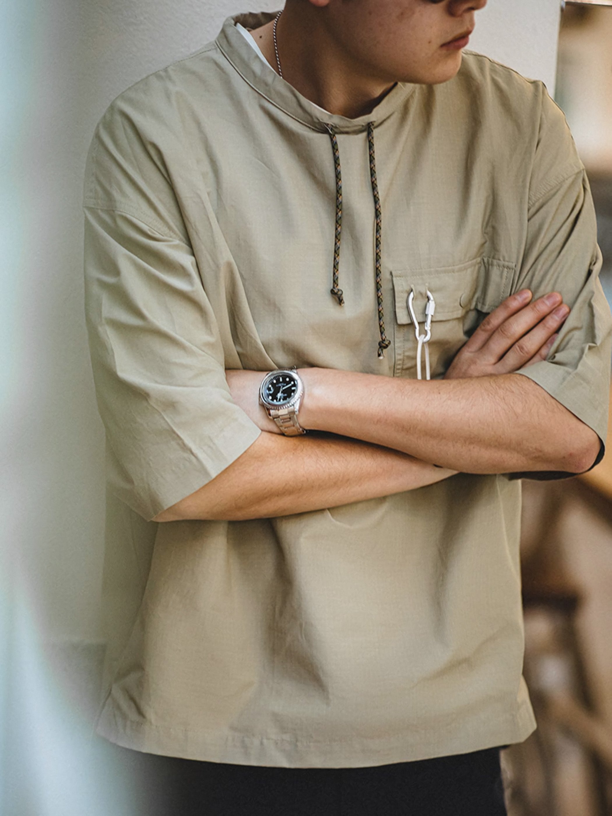 左胸ポケットにはカラビナリング付きのディテールが施されて、細部までこだわったデザインが特徴です。裾部分には前後差のフリルデザインを採用し、立体感、そして大人のカジュアルなスタイリング効果を追加しました。
