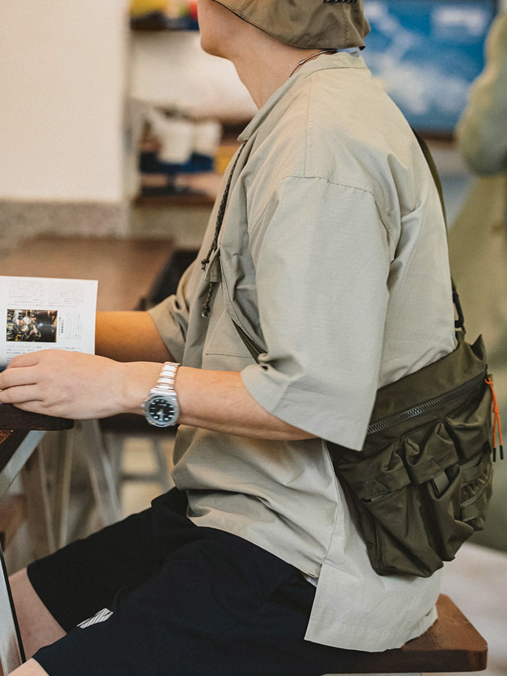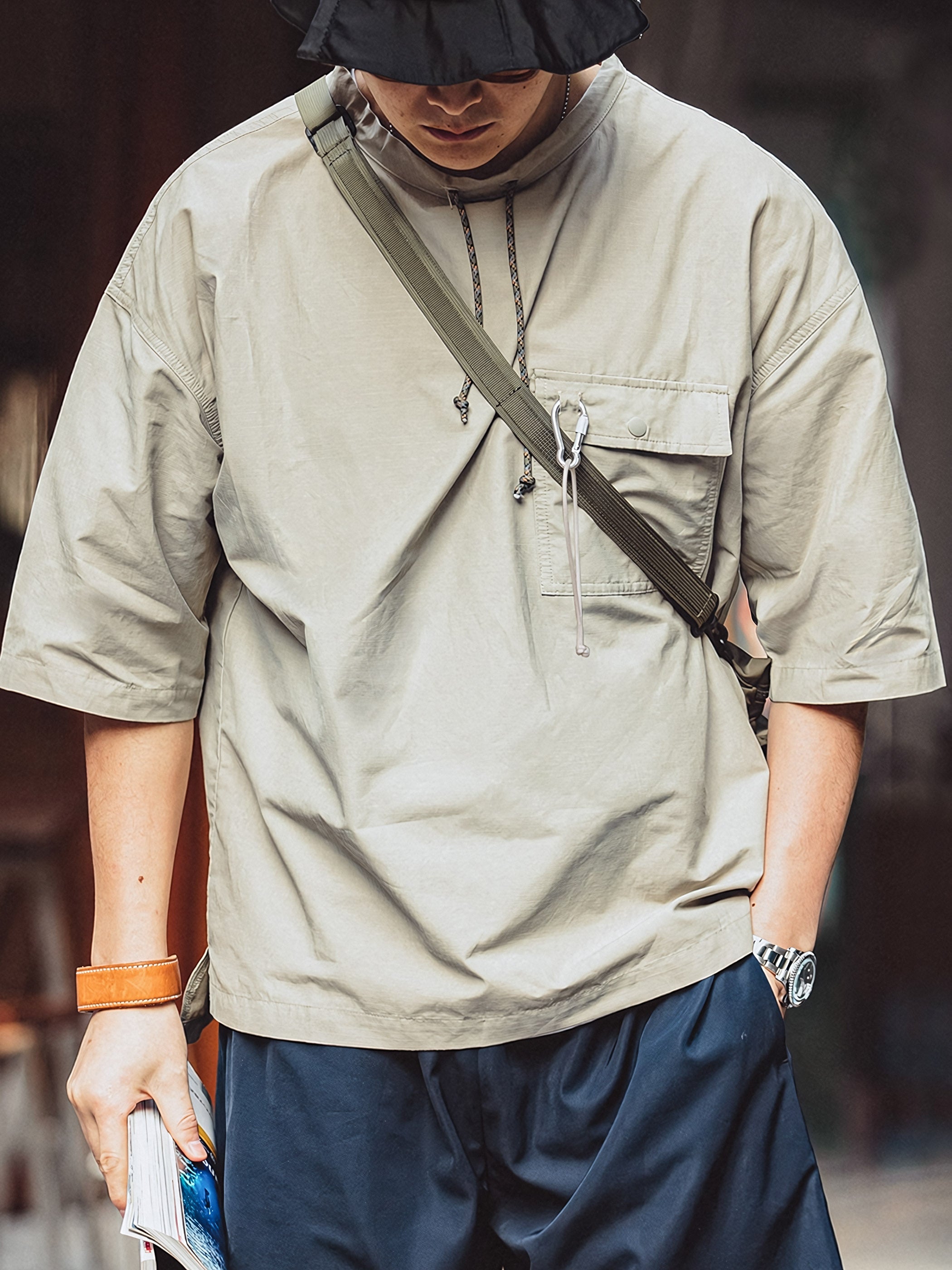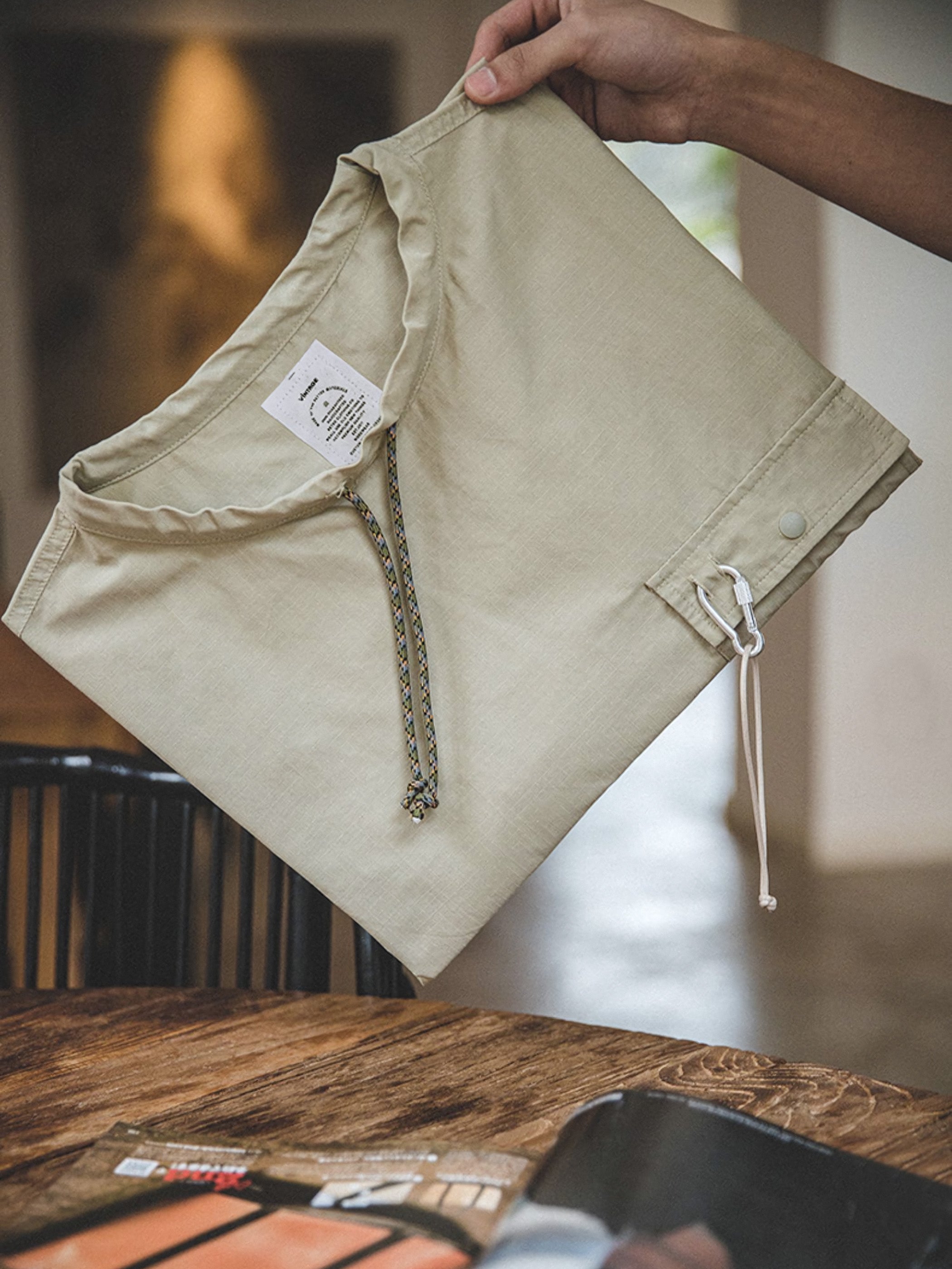 左胸ポケットにはカラビナリング付きのディテールが施されて、細部までこだわったデザインが特徴です。裾部分には前後差のフリルデザインを採用し、立体感、そして大人のカジュアルなスタイリング効果を追加しました。