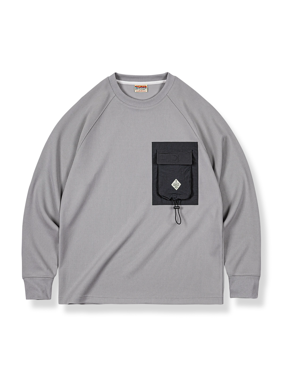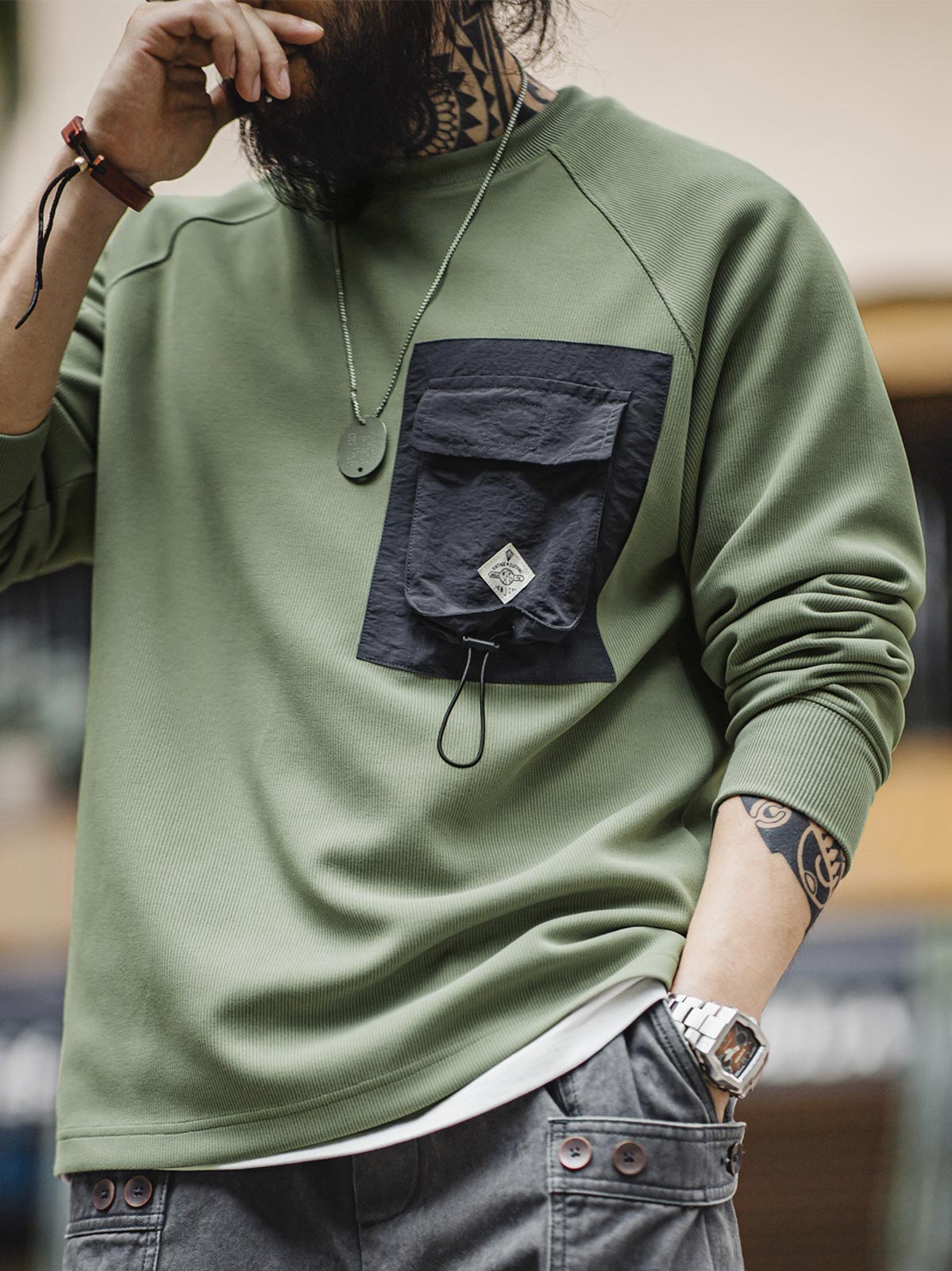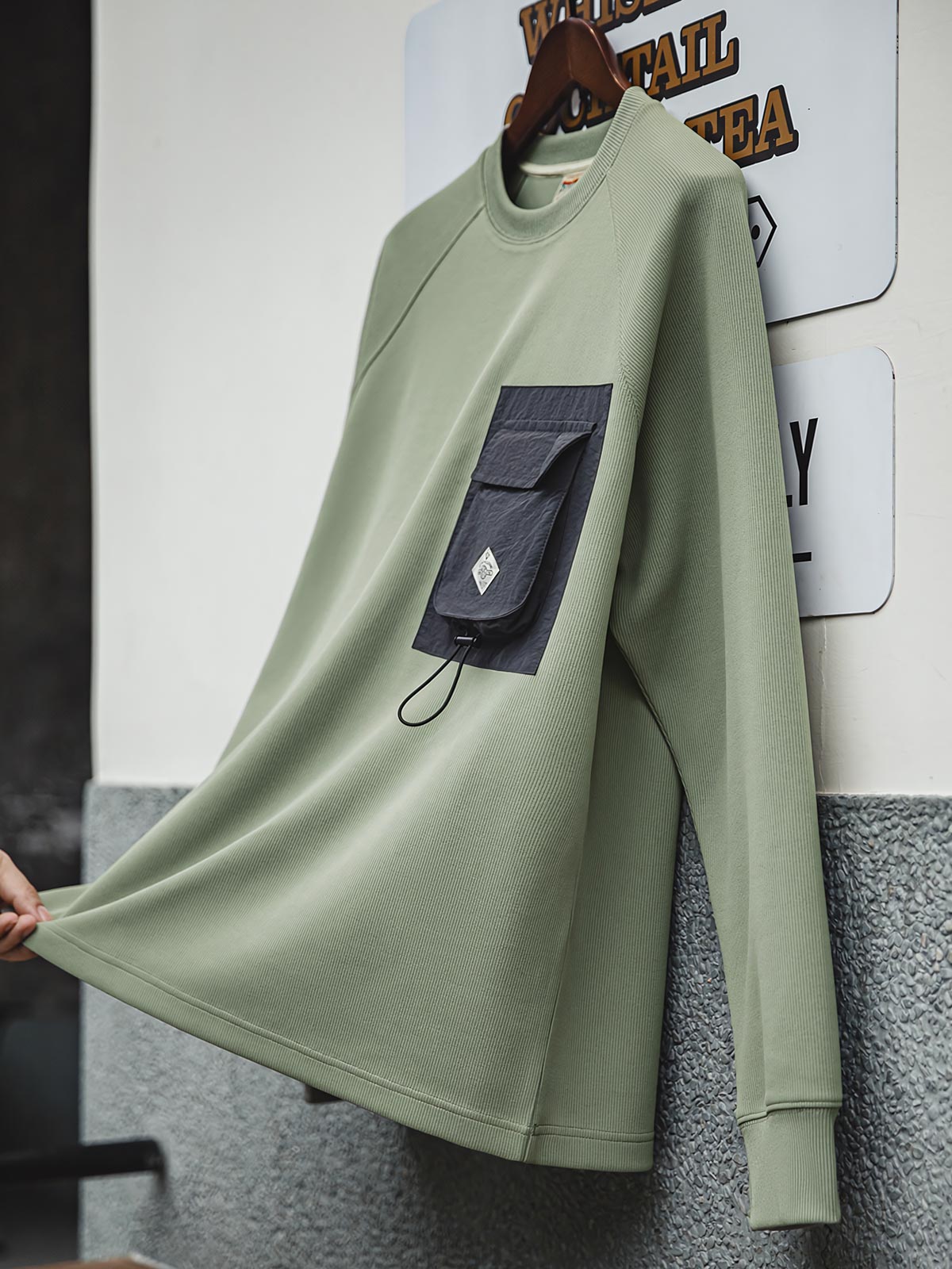 基本的なカジュアルスタイルとマウンテンテックスタイルが融合されたこの長袖Tシャツは、独特のデザインコンセプトと対比色の巧妙な使用により、レトロと現代の調和を示しています。柔らかなオリーブグリーンの色合いを採用し、中央に位置する黒のポケットが視覚的な焦点となり、レトロな感じを提供しつつ実用性も加えています。