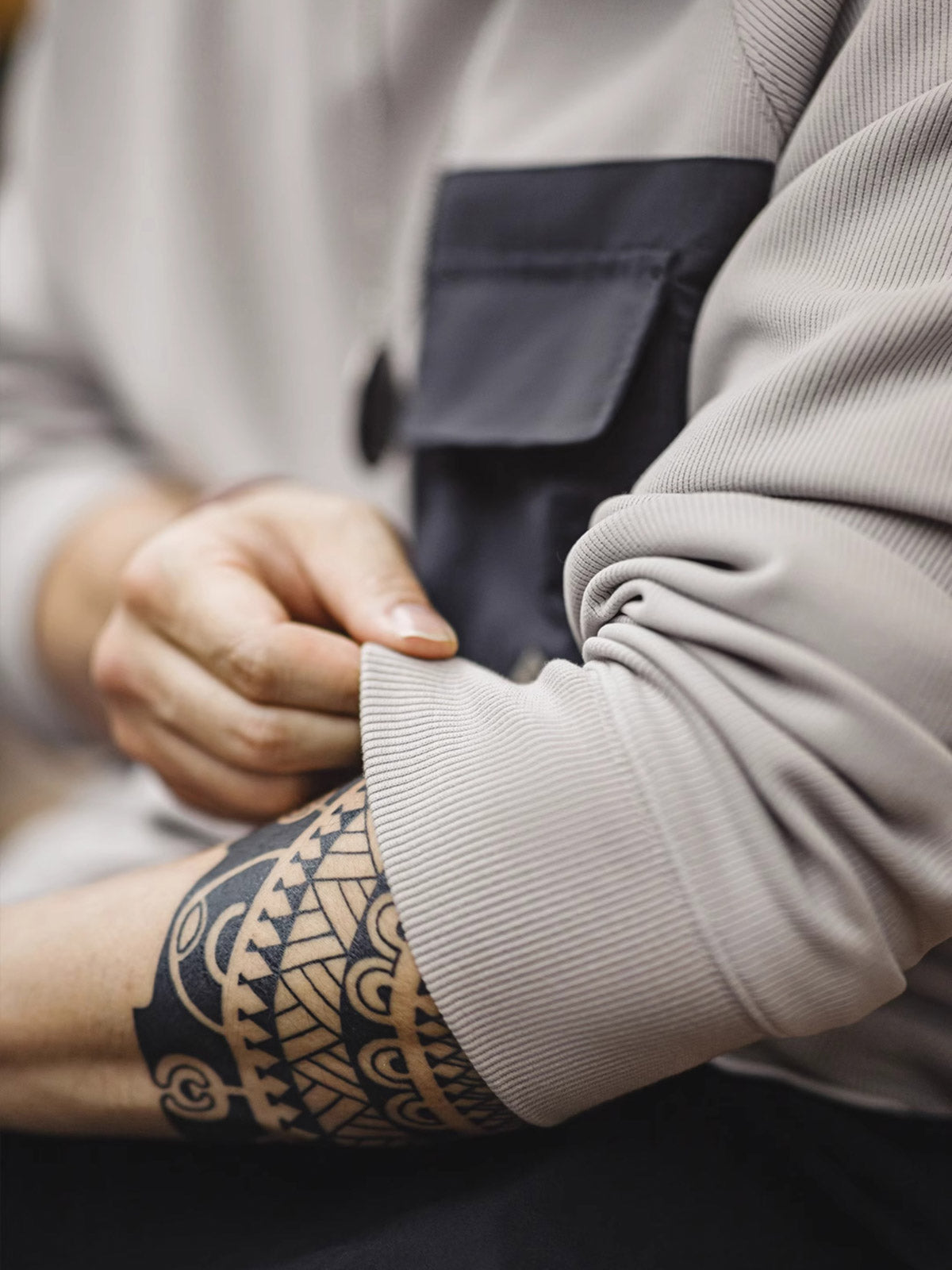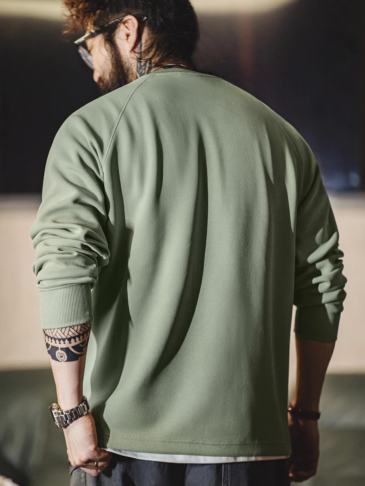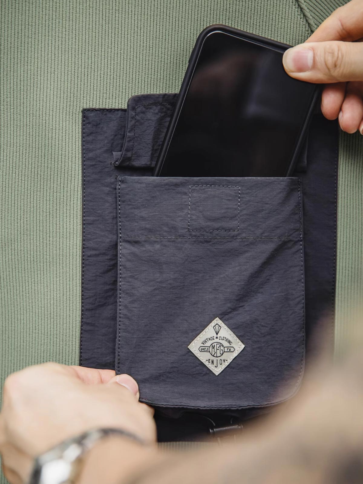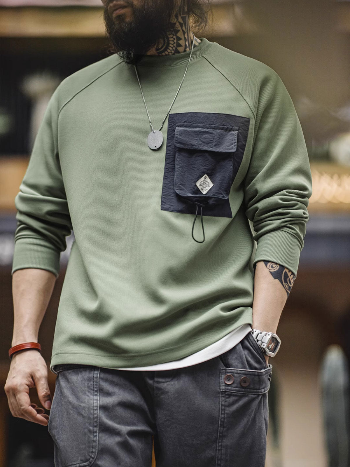 基本的なカジュアルスタイルとマウンテンテックスタイルが融合されたこの長袖Tシャツは、独特のデザインコンセプトと対比色の巧妙な使用により、レトロと現代の調和を示しています。柔らかなオリーブグリーンの色合いを採用し、中央に位置する黒のポケットが視覚的な焦点となり、レトロな感じを提供しつつ実用性も加えています。