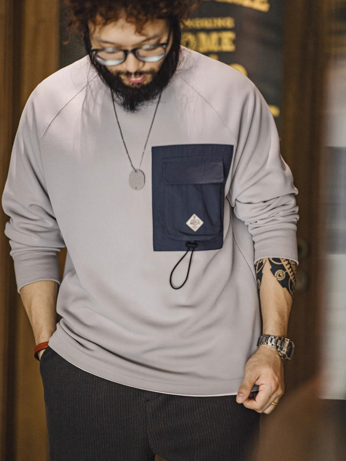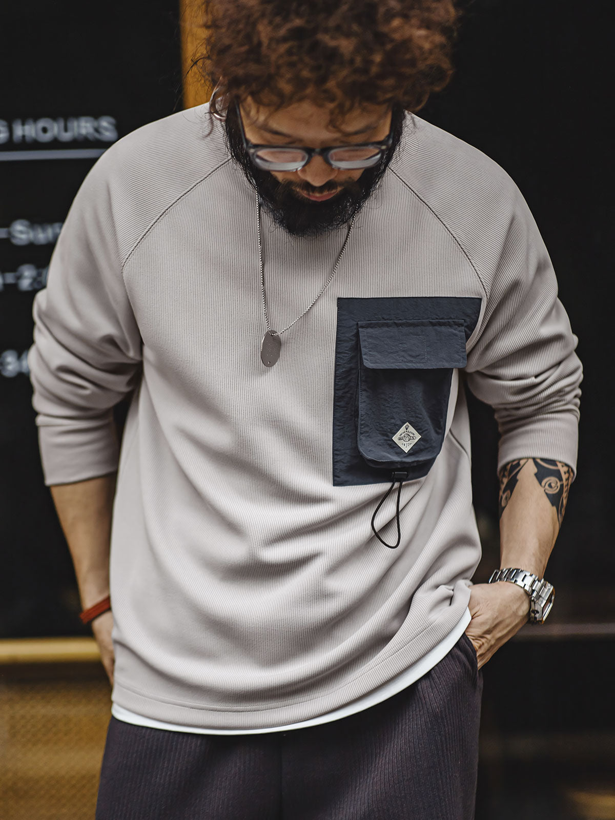 異なる2種類の生地を使用したこのTシャツは、ユニークな質感と多層的なレトロ感をもたらします。小さなポケットのテクニカルスタイルのデザインは、全体のルックを引き立てるだけでなく、Tシャツの実用性も高めます。