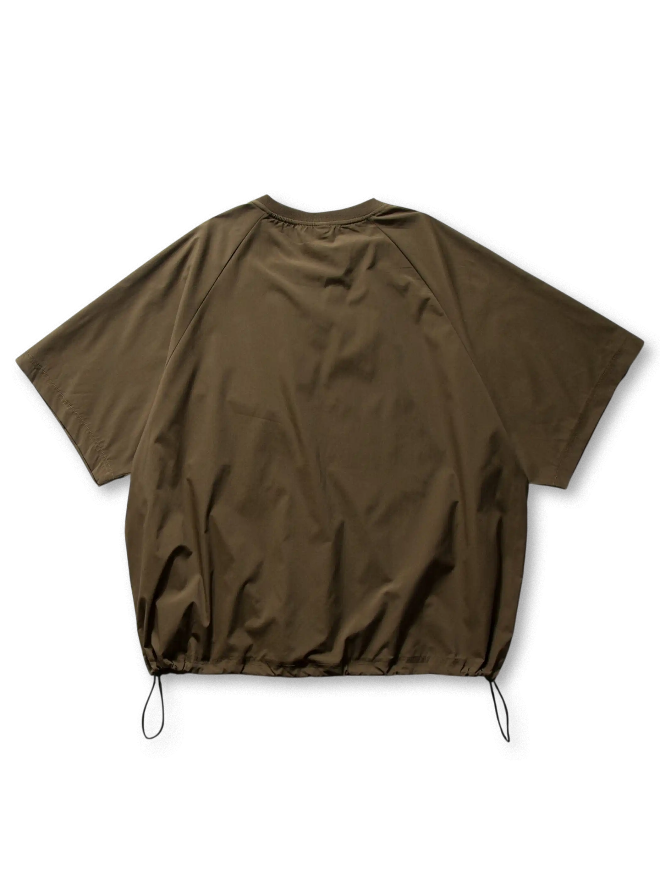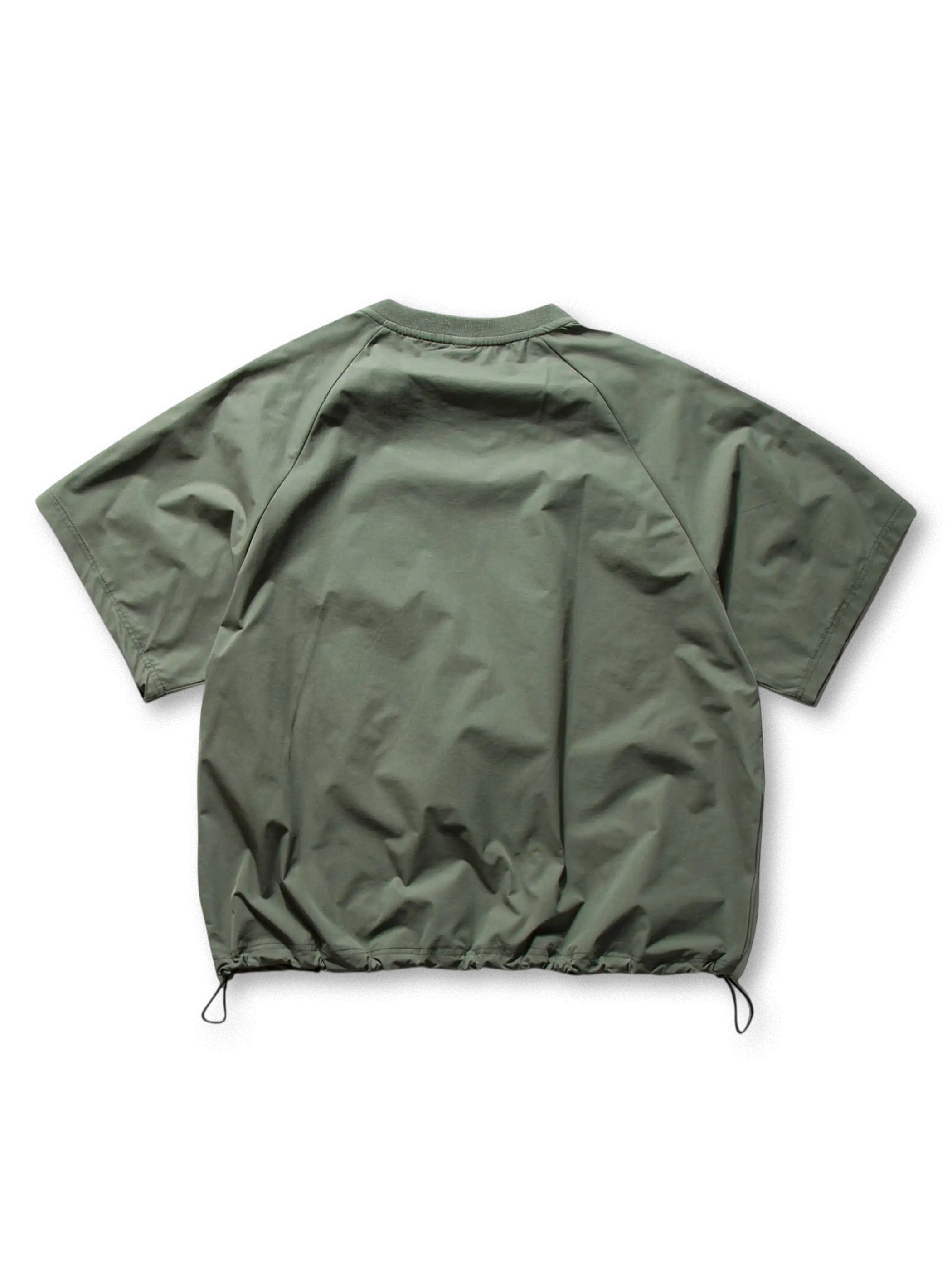 胸もとのジップ付きポケットは小物の収納に便利で、裾のドローストリングを絞ればシルエットをアレンジ可能。ラグランスリーブとゆったりした身幅が動きやすく、ワークパンツやカーゴショーツとの相性も抜群です。撥水性のあるポリエステル素材がアウトドアやタウンユースでの快適性を高め、ミニマルながら味わい深いアースカラーがスタイリングに溶け込みます。